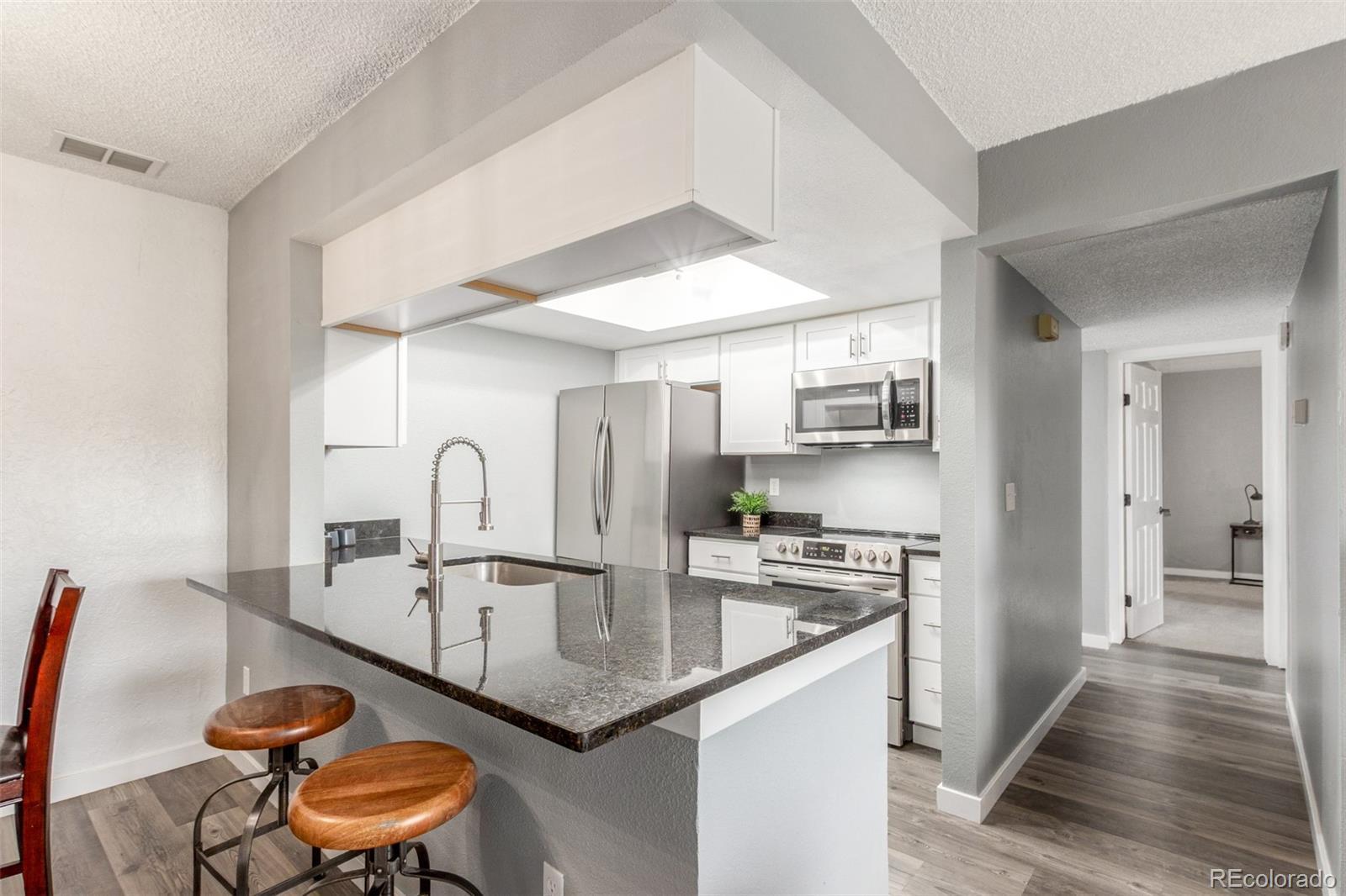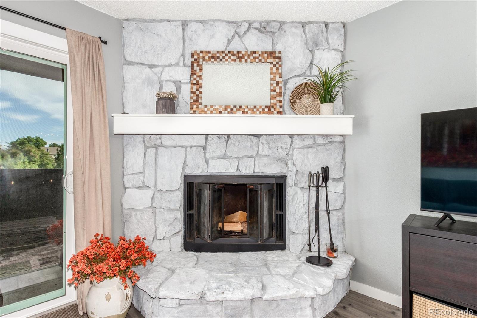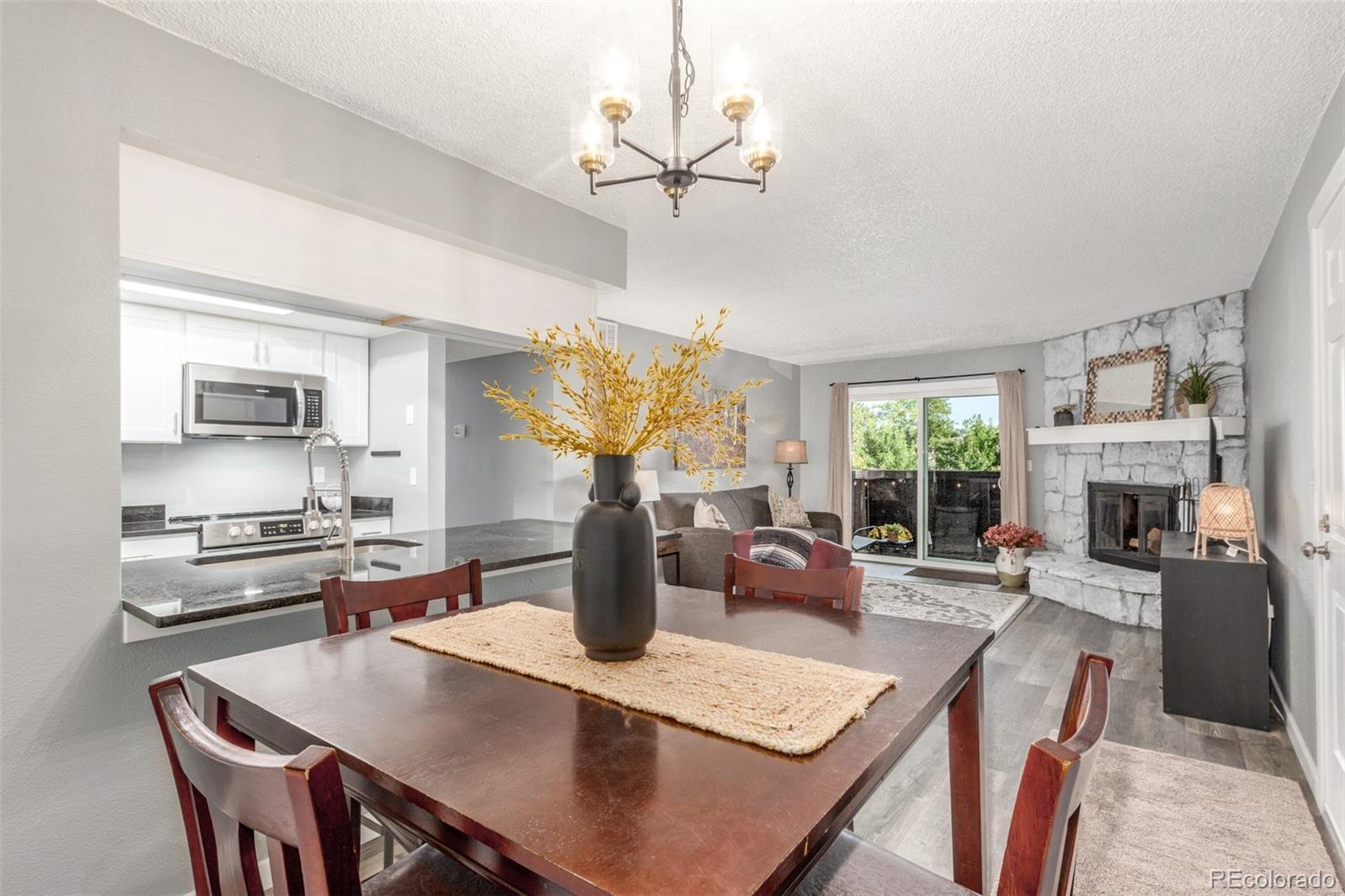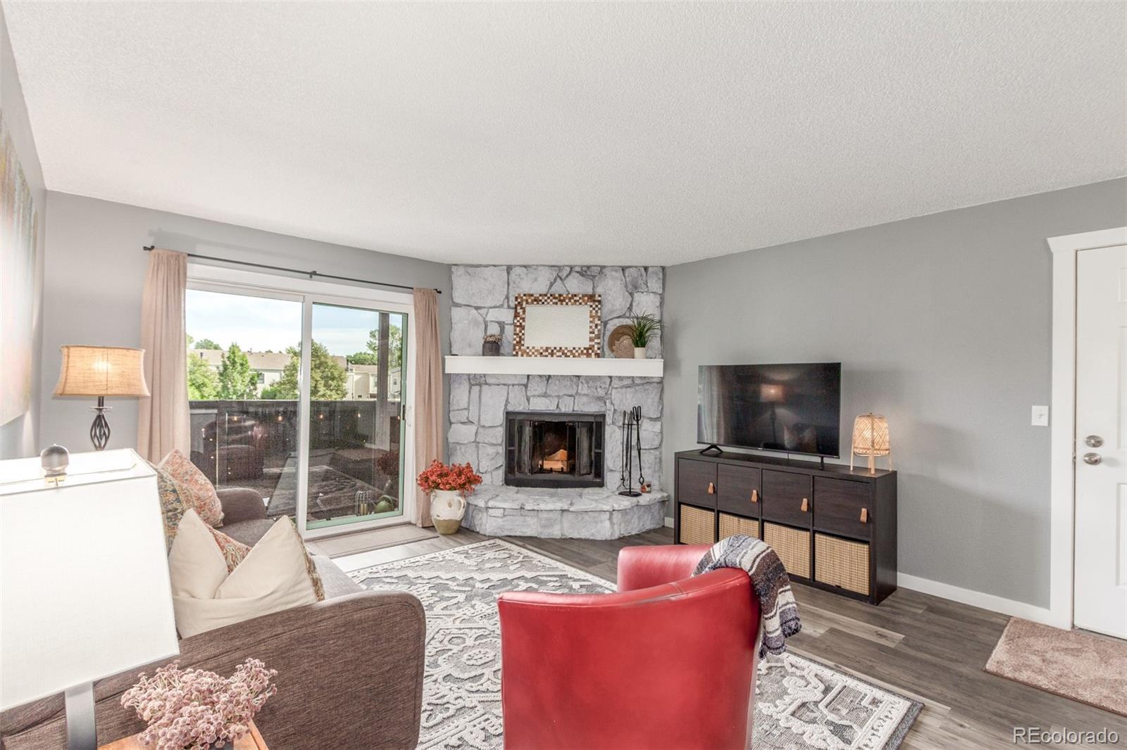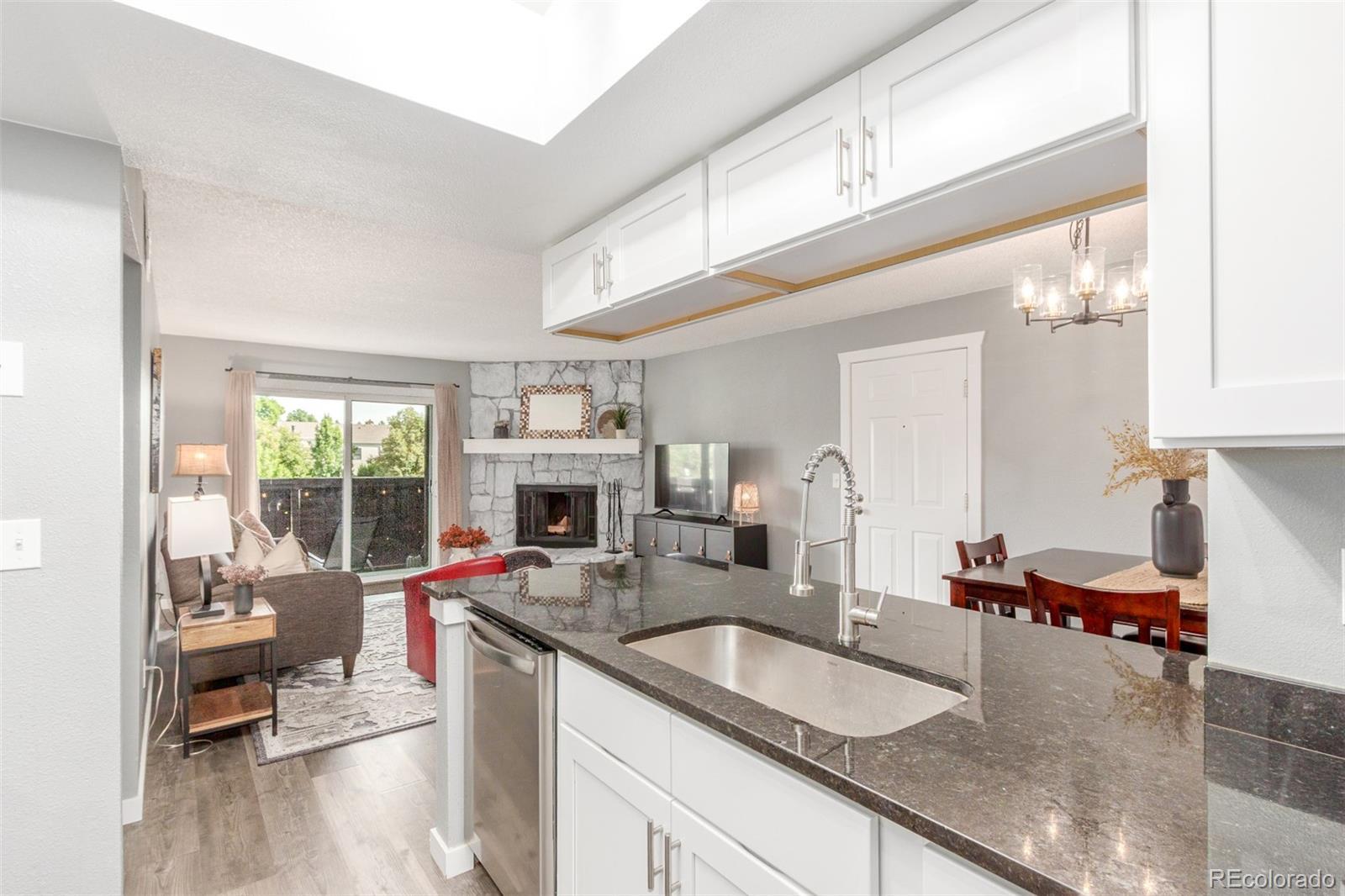 Seller's are offering to pay HOA Dues FOR TWO MONTHS AFTER CLOSING! One less item on your list when it is time to move-in! What a charming ground-floor condo awaits you in Mountain Vista Village! With 2 beds & 1 bath, this beauty seamlessly blends modern style and everyday comfort. The inviting interior showcases a neutral palette, abundant natural light, wood-look flooring in common areas, and soft carpet in bedrooms. You'll love the seamlessly flowing open layout that enhances both daily living and entertaining! With a fireplace as the focal point, the space exudes warmth and character. The impressive kitchen boasts stainless steel appliances, granite counters, track lighting, white shaker cabinetry, and a breakfast bar. The primary bedroom has a walk-in closet and access to the Jack & Jill bathroom. For added functionality, the secondary bedroom can also serve as an office. If you want to relax after a busy day, the private yard is waiting for you with a cozy covered patio! The unit is adjacent to a greenbelt, offering added privacy and serene natural views right outside your door. For your convenience, you’ll have two assigned parking spaces. Let's not forget the Community amenities, including a heated pool, a spa, and tennis/pickleball courts. Excellent location close to parks, shopping, dining options, entertainment, and highways. Don't miss this great opportunity!