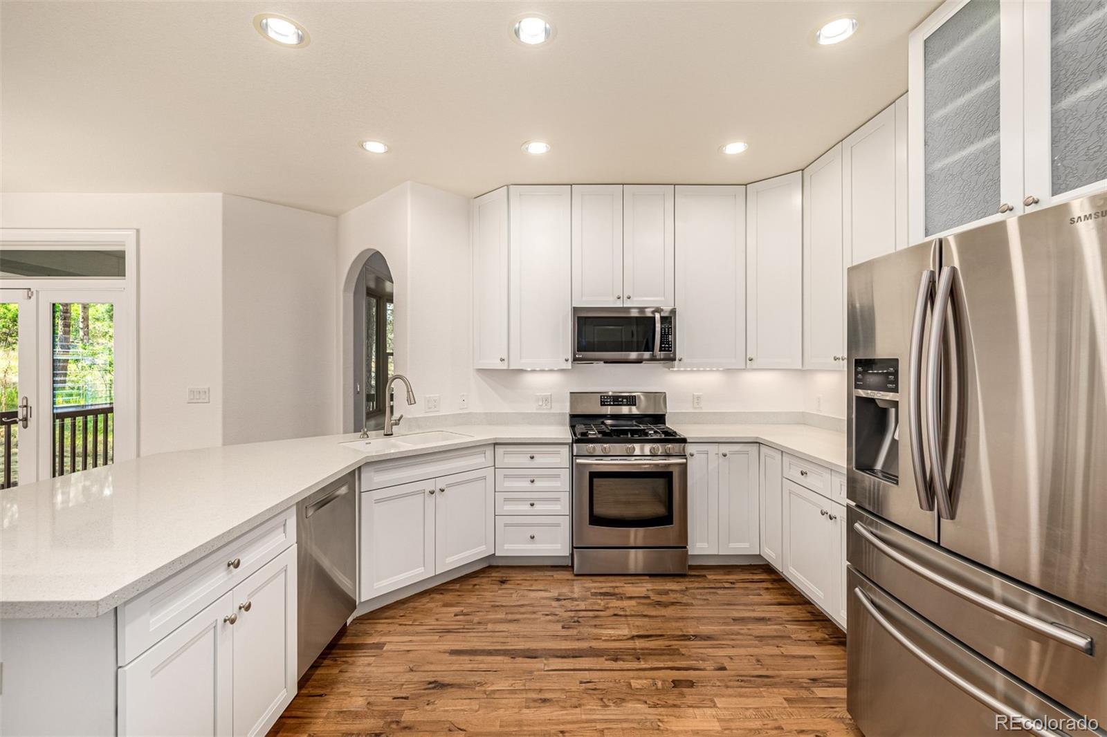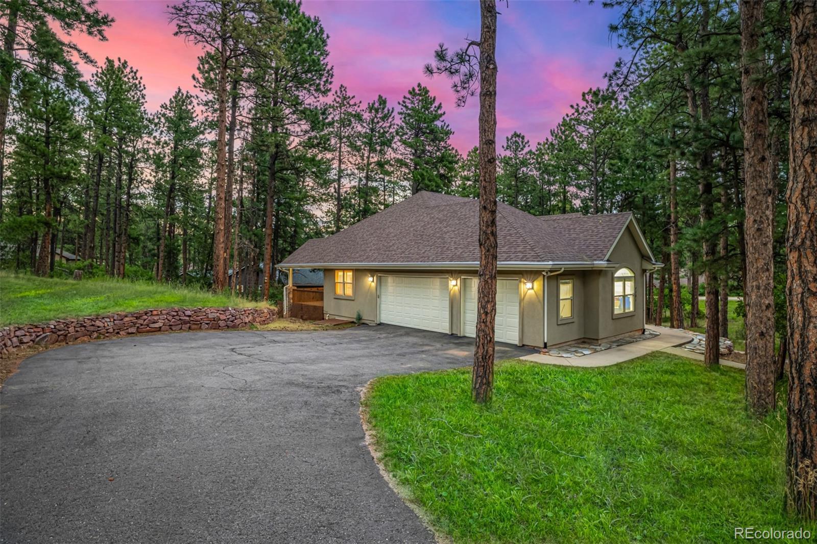 Prepare to be amazed! Check out this fantastic 5 bed, 4 bath residence now for sale in Perry Park! Nestled on an oversized corner lot nearly 1 acre in size & featuring 3 garage spaces, a quaint patio, and a lovely covered deck. Come inside to discover a sizeable living area with a fireplace to keep you warm during the winter months. Elegant wood flooring, window shutters, new carpet, dazzling light fixtures, and trending palette throughout! You'll also find a formal dining room, perfect for hosting a dinner party. The kitchen comes equipped with shaker cabinetry, a walk-in pantry, quartz countertops, stainless steel appliances, and a peninsula with a breakfast bar. Relax and unwind in the grand primary suite, showcasing two walk-in closets and a full bath with dual vessel sinks and a soaking tub. Cozy basement family room with walk-out access also includes a second fireplace. Lastly, the unfinished basement area can be easily converted into additional living space or used for storage! The home of your dreams is here, don't let it get away!