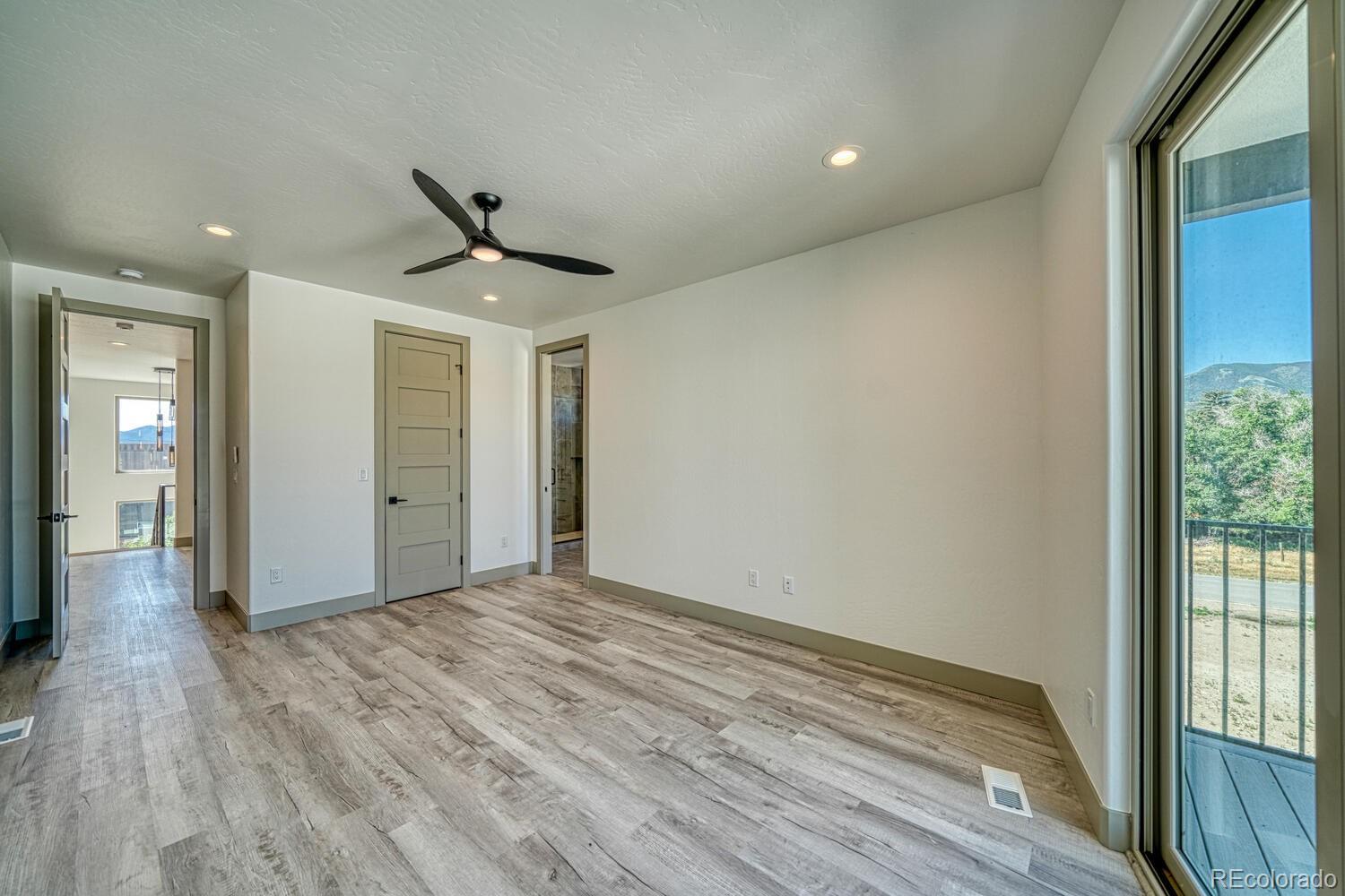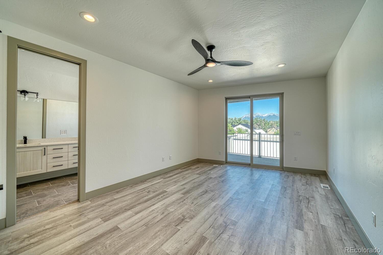 Located within Salida town limits, this newly built luxury townhome offers a refined approach to small-town living with modern design and walkable access to the heart of town. Thoughtfully designed across three levels, the main residence includes approximately 2,309 square feet with four bedrooms and three bathrooms. The upper living level is bright and open, centered around a chef-inspired kitchen featuring quartz countertops, a waterfall island, high-end stainless appliances, pantry storage, and a dedicated coffee bar. Ten-foot ceilings, oversized windows, and expansive sliding doors connect the kitchen, dining, and great room to covered balconies, creating an easy flow between indoor and outdoor living. A custom floating staircase of steel and white oak serves as an architectural focal point, allowing light and sightlines to flow between levels. Other architectural details wide-plank luxury vinyl flooring, eight-foot doors, and clean, modern finishes throughout. The primary suite features a spa-style bath with a freestanding soaking tub, walk-in closet, and private balcony. Additional bedrooms provide flexibility for guests, home office space, or everyday living. Above the detached two-car garage, a fully separate one-bedroom, one-bath accessory dwelling unit includes its own kitchen and living area and may be used as a long-term rental, guest suite, or private space for extended living. Outdoor areas are designed for low-maintenance enjoyment with xeriscaped landscaping, private fencing, and multiple patios and balconies. Located on a paved public street, this home offers convenient access to downtown Salida, local restaurants and shops, trails, and the Arkansas River, combining modern comfort with the ease and rhythm of in-town mountain living.