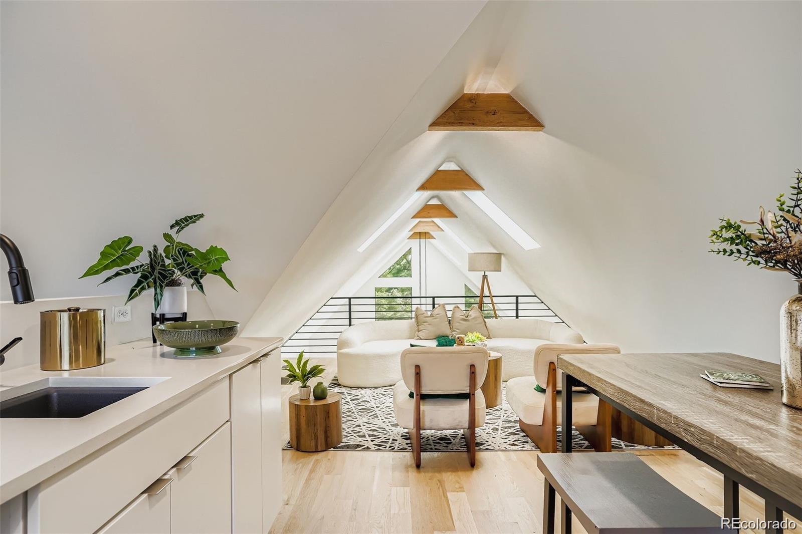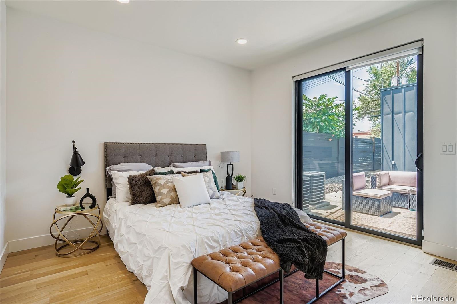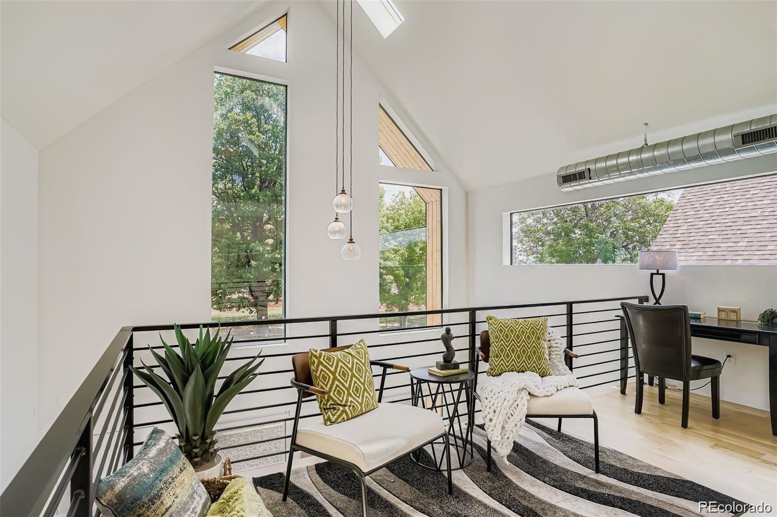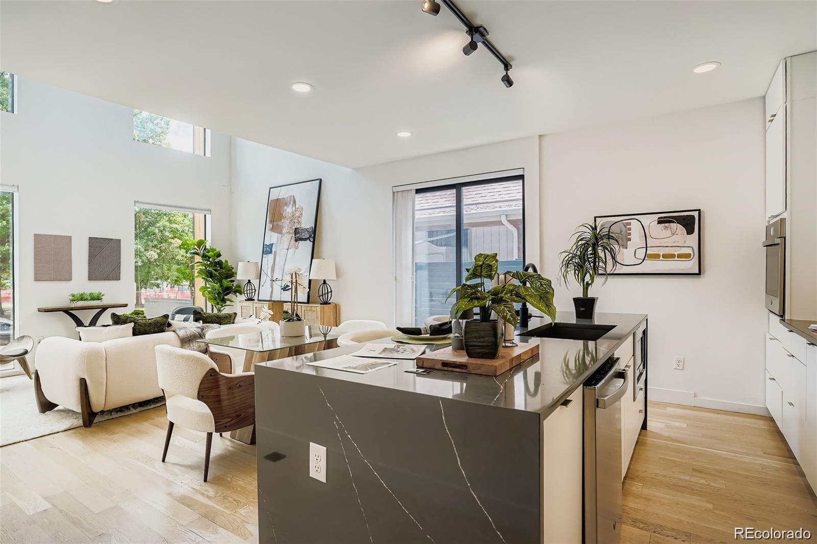Stunning contemporary Sunnyside duplex directly across from La Raza Park (in the middle of a major renovation), offering park-front living with walkable Denver lifestyle. This light-filled modern home features an open-concept floor plan, floorto-ceiling windows, and skylights that flood the space with natural light. The main level is built for entertaining with a chef’s kitchen—quartz countertops, large island, stainless appliances, high-efficiency induction cooktop, pot filler, undermount sink, and abundant storage + prep space. Also on the main floor: a main-floor bedroom + ensuite 5-piece bath + walk-in closet, perfect as a main-level primary suite or guest setup. Upstairs includes a second primary suite, plus an additional bedroom and bath, and a loft/office flex space with park and city views—ideal for work-from-home. The third level delivers a private retreat with a wet bar and west-facing balcony for sunsets. The finished basement offers tall ceilings, two egress windows, a large rec room, guest bedroom, full bath, and extra storage—great for a media room, gym, or playroom. Outside, enjoy a private low-maintenance backyard leading to a 2-car detached garage. Upgrades buyers search for: oak hardwood floors, custom lighting, modern metal railings, multi-zone heating & cooling, tankless water heater, and seller-owned solar panels (average utilities ~$100/month). Green-built / energy-efficient and steps to Sunnyside coffee shops, restaurants, and Traverse Fitness—this is modern Denver living with space, style.