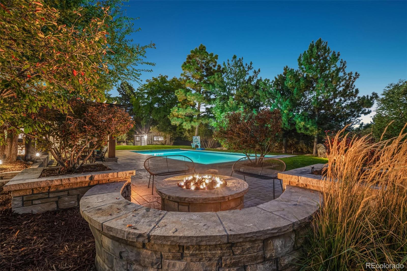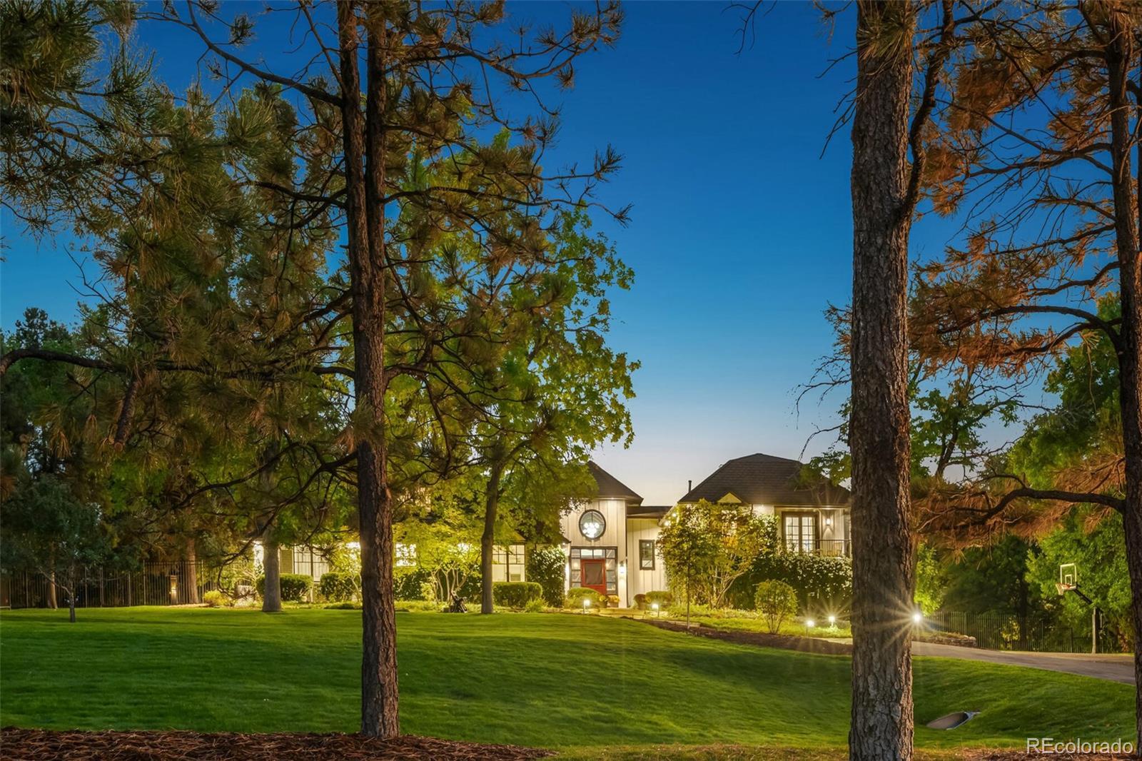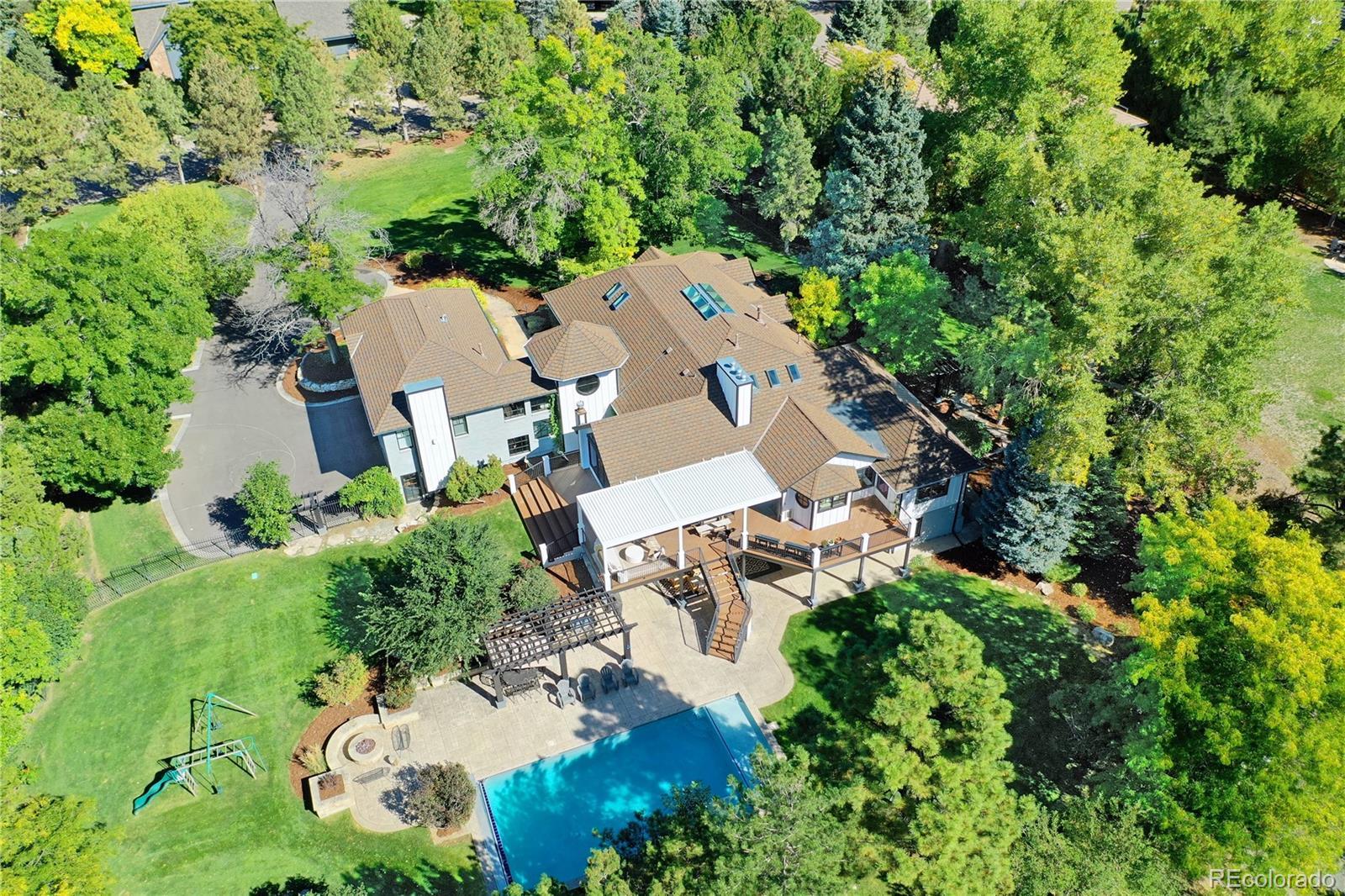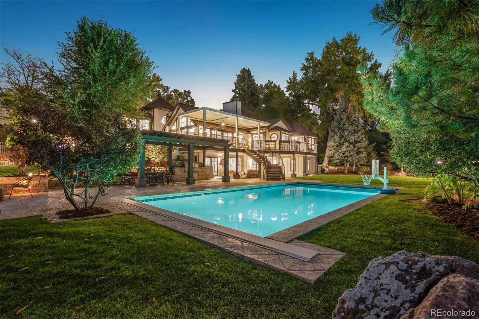 Cape Cod–inspired architecture meets modern luxury in this fully updated 7-bedroom, 6-bath estate on one of the most prestigious streets on the east side of I-25. Poised high on a 1.17-acre lot, the home has a commanding presence, framed by majestic pinion pines that gracefully flank the entry. A charming flagstone patio welcomes you inside this fully wrought-iron fenced property, which also features a 4-car sideload garage & 2 outbuildings—a private man cave & a light-filled art studio. Natural light abounds throughout the home, enhanced by southern exposure & multiple skylights. The gourmet chef’s kitchen features dual oversized center islands, generous prep space, & panoramic windows that capture serene views. The open-concept family room showcases floor-to-ceiling windows, sliding doors to the deck, & tongue-and-groove pitched ceilings that highlight its architectural character. The dining room is equally inviting with a tongue-and-groove tray ceiling & indirect mood lighting for elegant entertaining.Outdoor living is truly exceptional with multiple patio spaces, pergolas, a stamped concrete patio surrounding the heated pool, and a cozy fire pit area. The heated pool includes an electronic cover and is complemented by a fully equipped outdoor kitchen—all surrounded by lush landscaping and ample sitting areas. A dog run adds convenience and versatility for pet lovers.The finished walkout lower level extends the home’s entertaining and living space, offering a wet bar, dual-sided fireplace, professional gym, theater area, and 2 additional bedrooms. Custom antique wood doors lead into a charming wine cellar. Located within the coveted Cherry Creek School District, this exceptional home is within walking distance to shopping, dining, Cherry Creek State Park, and all the desirable amenities of Greenwood Village. Timeless charm, modern updates, and an unparalleled setting make 9500 Poundstone Place one of Greenwood Village’s most distinguished luxury estates.
