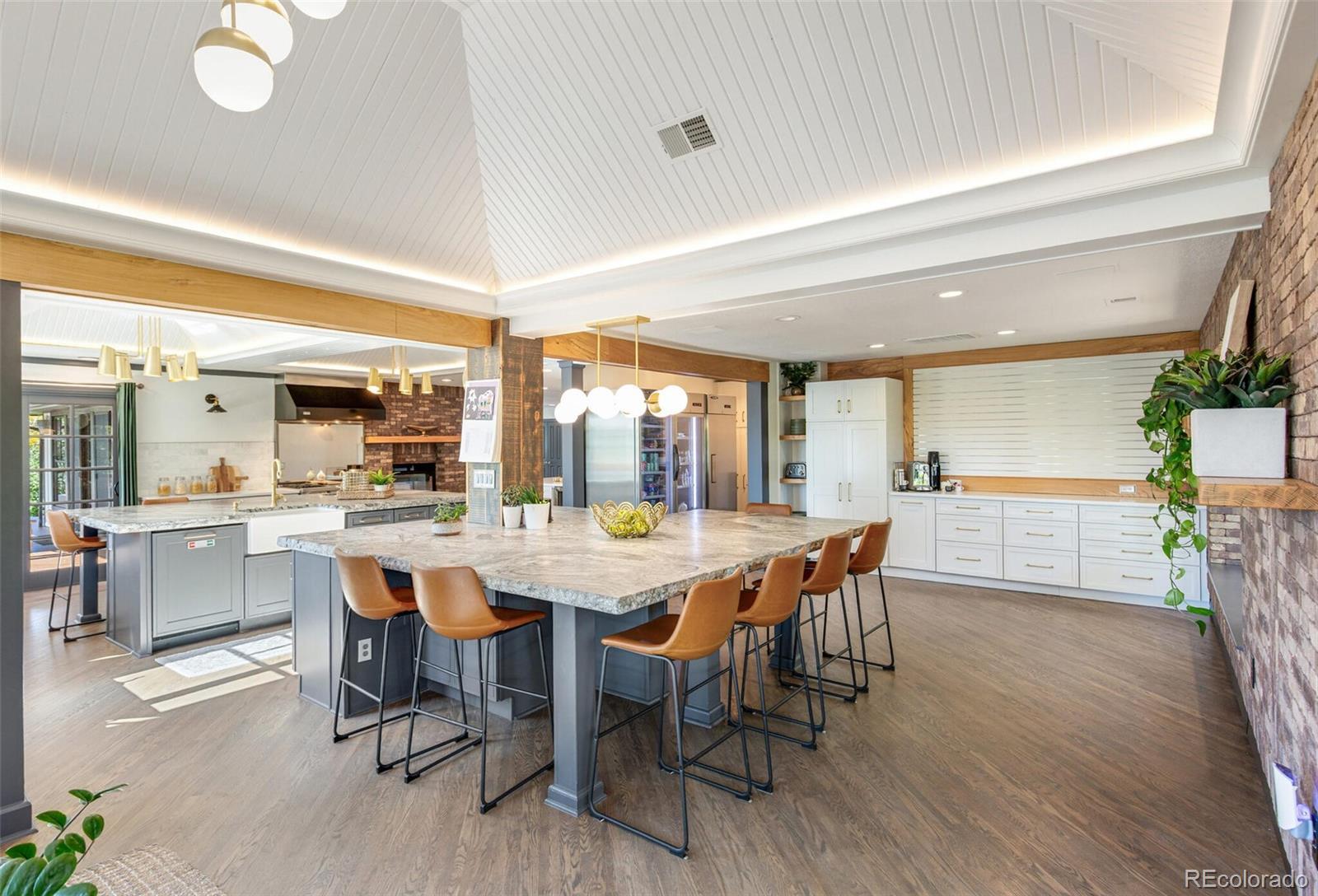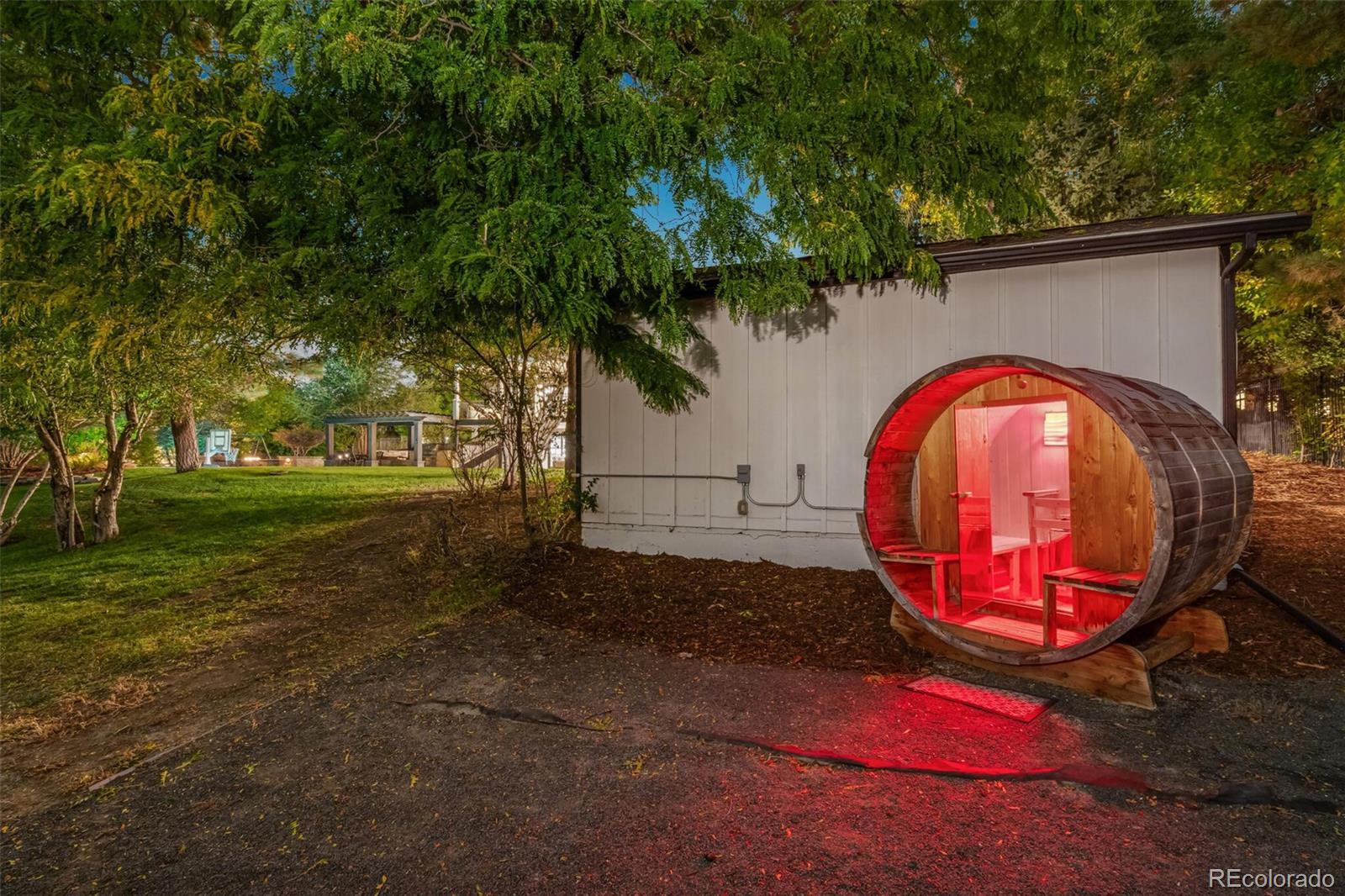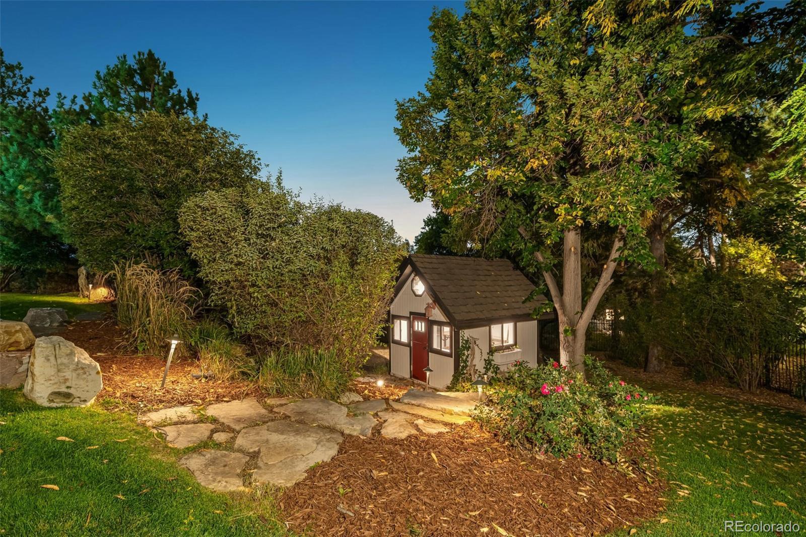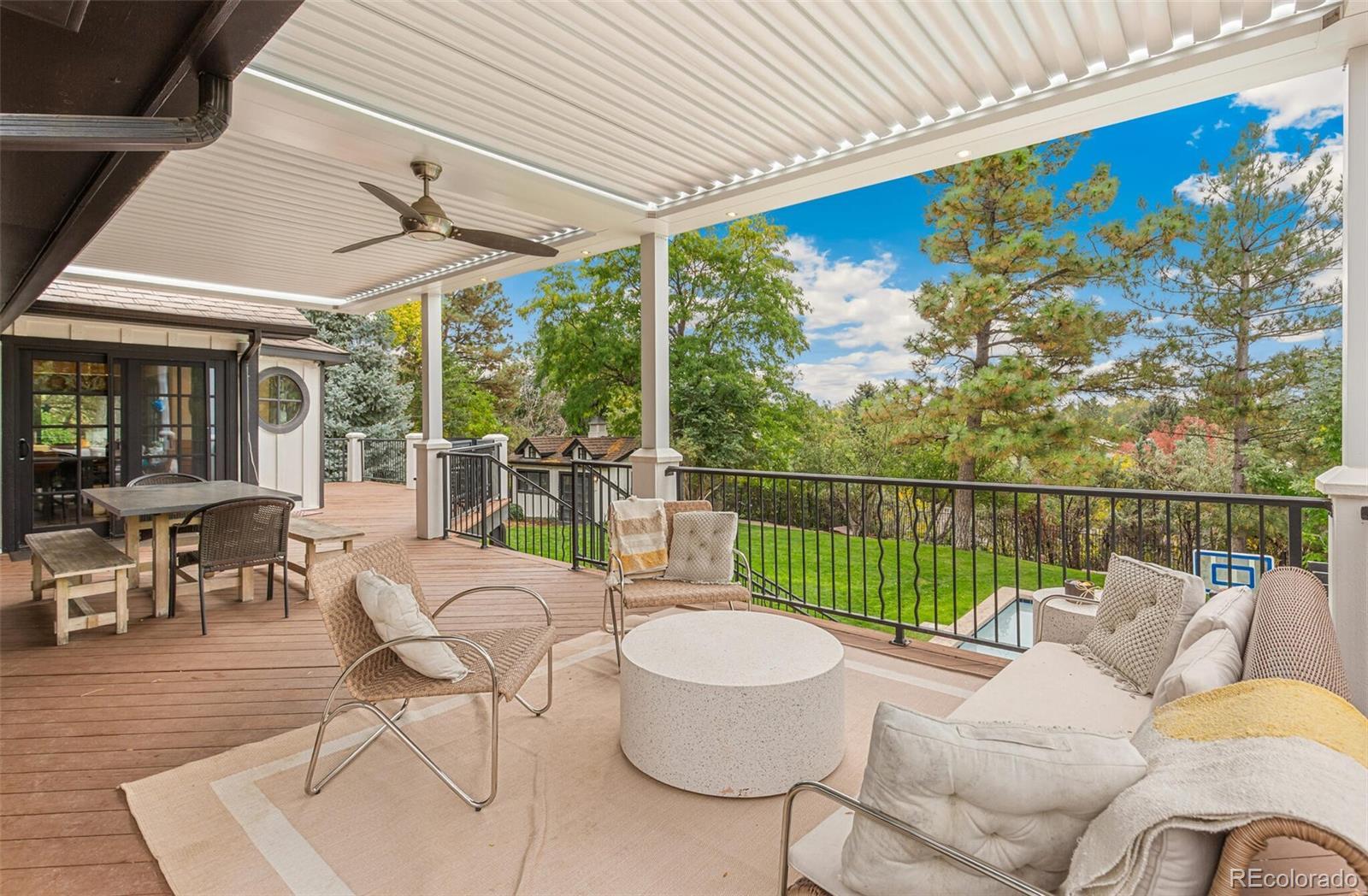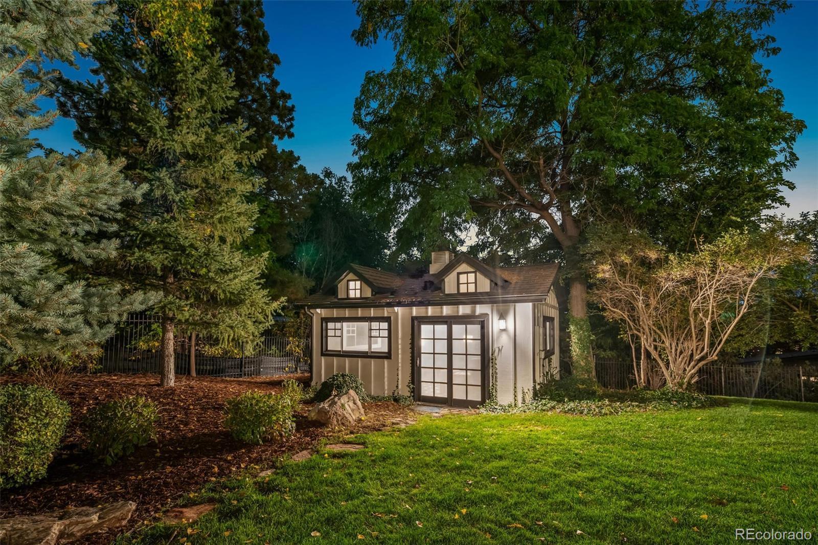 Cape Cod–inspired architecture meets modern luxury in this fully updated 7-bedroom, 6-bath estate on one of the most prestigious streets on the east side of I-25. Poised high on a 1.17-acre lot, the home has a commanding presence, framed by majestic pinion pines that gracefully flank the entry. A charming flagstone patio welcomes you inside this fully wrought-iron fenced property, which also features a 4-car sideload garage & 2 outbuildings—a private man cave & a light-filled art studio. Natural light abounds throughout the home, enhanced by southern exposure & multiple skylights. The gourmet chef’s kitchen features dual oversized center islands, generous prep space, & panoramic windows that capture serene views. The open-concept family room showcases floor-to-ceiling windows, sliding doors to the deck, & tongue-and-groove pitched ceilings that highlight its architectural character. The dining room is equally inviting with a tongue-and-groove tray ceiling & indirect mood lighting for elegant entertaining.Outdoor living is truly exceptional with multiple patio spaces, pergolas, a stamped concrete patio surrounding the heated pool, and a cozy fire pit area. The heated pool includes an electronic cover and is complemented by a fully equipped outdoor kitchen—all surrounded by lush landscaping and ample sitting areas. A dog run adds convenience and versatility for pet lovers.The finished walkout lower level extends the home’s entertaining and living space, offering a wet bar, dual-sided fireplace, professional gym, theater area, and 2 additional bedrooms. Custom antique wood doors lead into a charming wine cellar. Located within the coveted Cherry Creek School District, this exceptional home is within walking distance to shopping, dining, Cherry Creek State Park, and all the desirable amenities of Greenwood Village. Timeless charm, modern updates, and an unparalleled setting make 9500 Poundstone Place one of Greenwood Village’s most distinguished luxury estates.