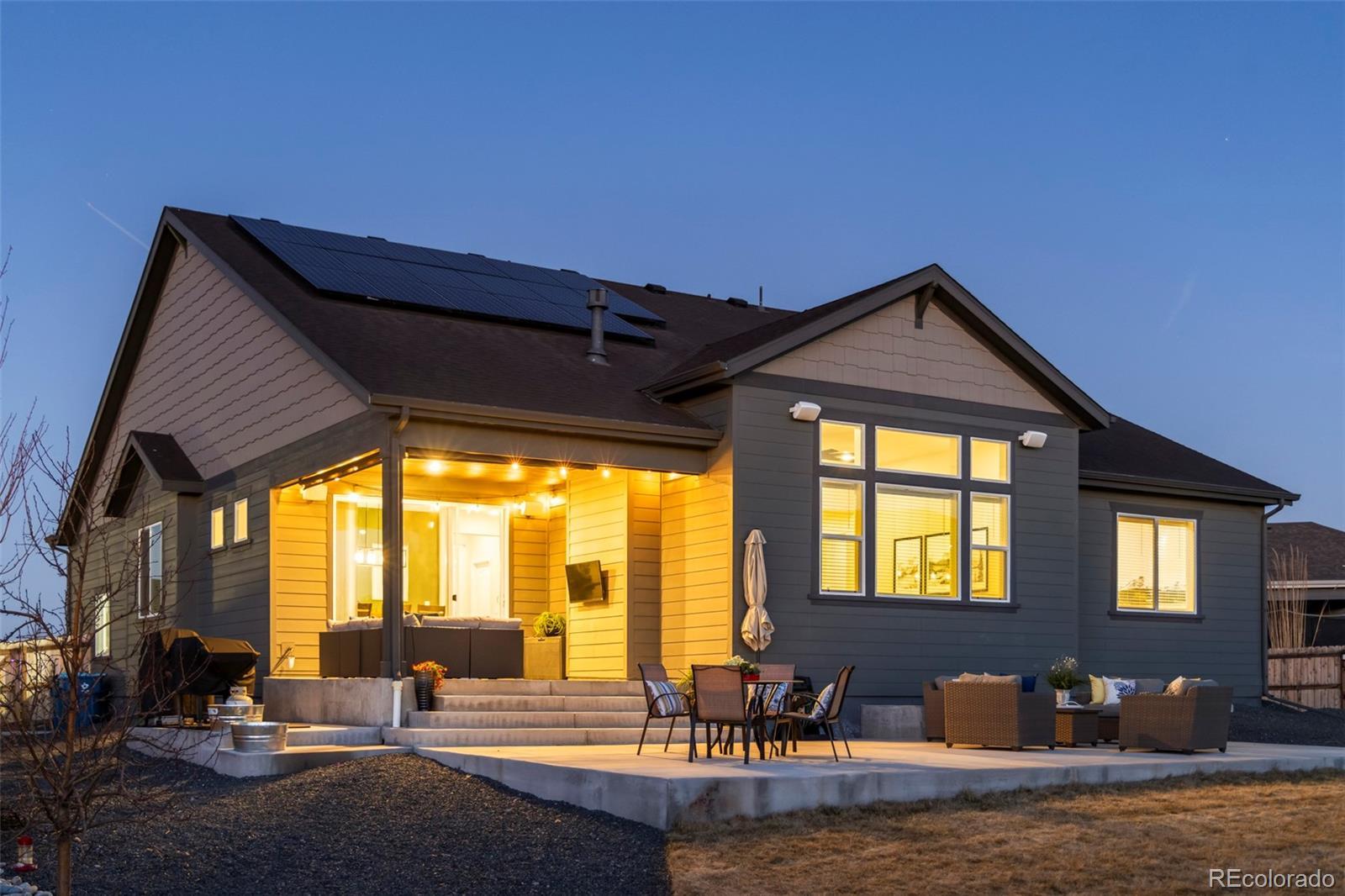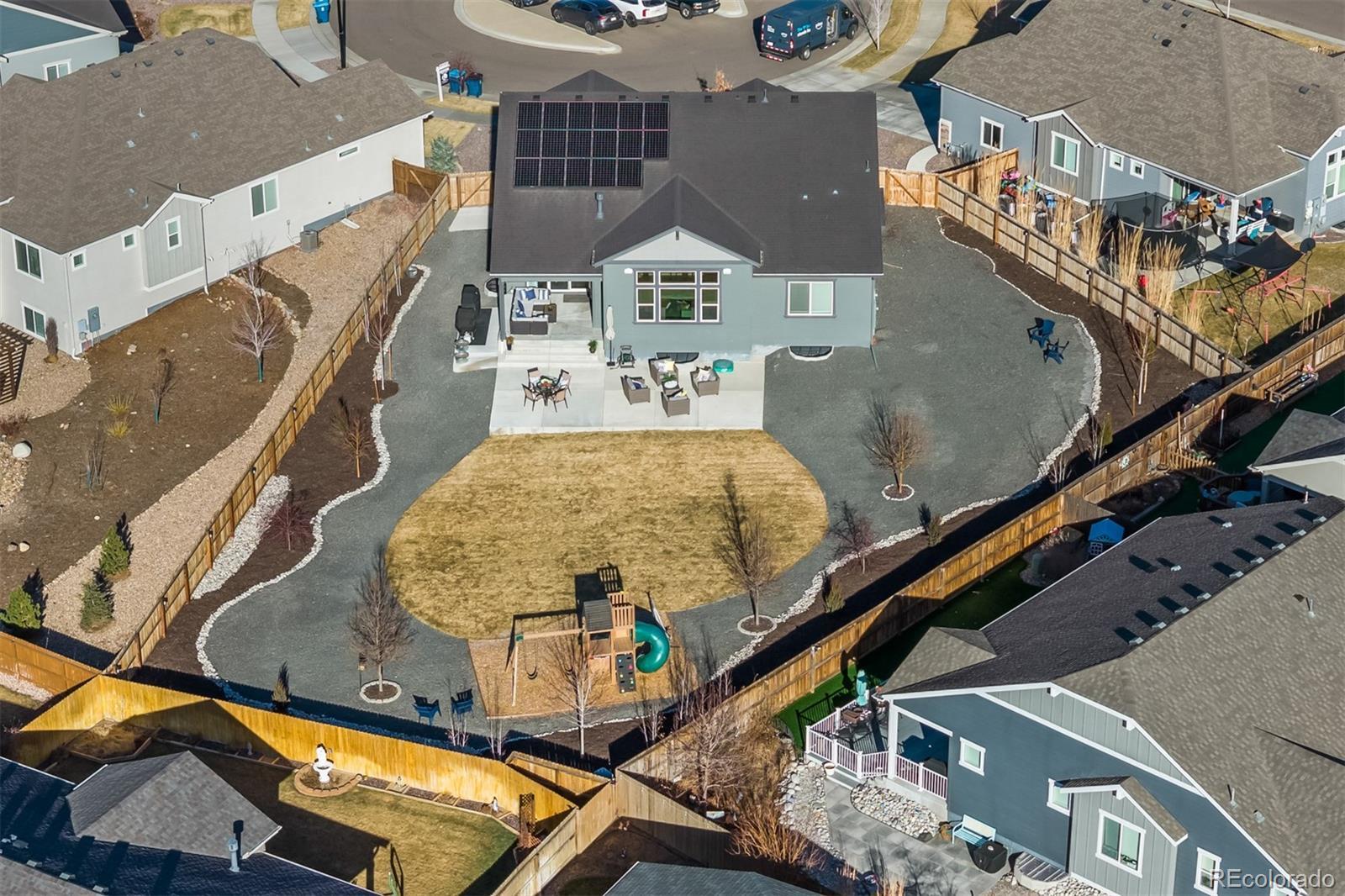 Welcome to this exceptional ranch home in popular Buffalo Run, offering over $280,000 in builder and after-market upgrades. This outstanding home's features begin with one of the largest lots (.38 acres) offered in the community, professionally designed and offers privacy and room to grow. DON'T MISS THE CINEMATIC VIRTUAL TOUR FOR A CLOSER VIEW. The amazing professionally finished basement adds 1800 sq. ft. of living space (plus, 442 of storage). Features included ambient coved ceiling accent lighting, 2 bedrooms, stunning 3/4 bath, enormous Rec Room, Gym area w/Finnish Sauna (~$9000K) and windows are egress. This home has been designed for a buyer with the most distinctive taste and expecting the finest custom upgrades available. The upgraded Gourmet kitchen is a chef's dream w/premium appliances/upgraded cabinet package/slab granite/double convection ovens/gas cooktop/huge breakfast bar and adjacent dining area. An open concept floor plan allows flow into the dramatic Great Room offering with soaring ceilings, stone surround gas fireplace, built-in surround sound speakers and a wall of windows, overlooking the huge backyard. Other highlights - main-level office w/French doors, custom cubby storage, upgraded laundry room, Luxury Vinyl Plank/main level brand new carpet, 5 bedrooms, 4 baths, indoor and outdoor speaker systems - the Home Book has more details. Your Primary Suite is complete with a millwork accent wall, natural light and a spa-inspired bath showcasing elegant tile, large soaking tub, oversized shower, dual vanities and expansive walk-in closet. Secondary bedrooms are generously sized with large closets and high ceilings. See the Room Description section for more info. The beautiful exterior has over $80K in landscaping, multiple patios added, covered entertainment space w/speakers, gas line, sprinkler system and the playset is included. Prime Cul-de-sac location, solar system installed (lease assumption) and low HOA complete this turnkey opportunity.