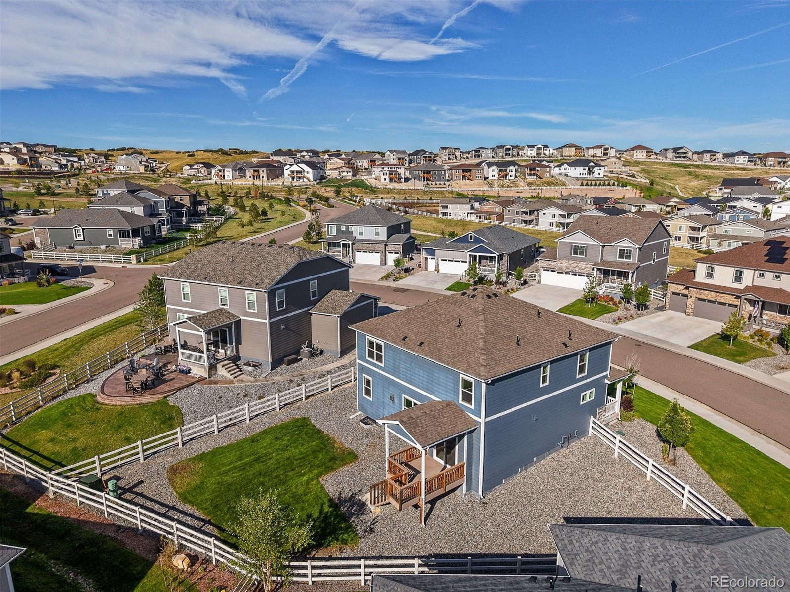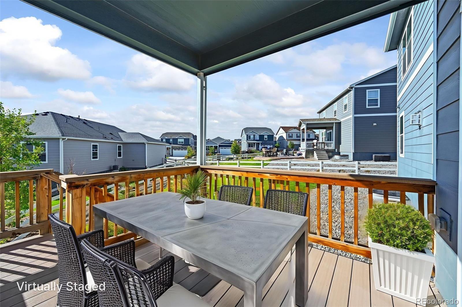 Welcome home to this light and bright former D.R. Horton show home in Crystal Valley Ranch! Boasting contemporary finishes on a spacious lot with beautiful laminate hardwood floors, grand 10' ceilings, and a neutral palette that all seamlessly tie together the main living spaces. The open living and dining areas are ideal for entertaining and are just steps off the well-appointed kitchen. Enjoy preparing a meal in the eat-in kitchen featuring an oversized center island, white shaker cabinetry, a stainless steel appliance package, and quartz counters. Upstairs, the private living area is comprised of three generously sized secondary bedrooms, a full bath, laundry, a bonus loft space, and the primary suite. This large sanctuary includes a walk-in closet and an upgraded bathroom. Descend to the finished basement to the sizeable den for family movie nights or watching the big game. The basement features a non-conforming bedroom which could also be used as a bonus space - perfect for a play room, home gym, or craft room with a sleek 3/4 bath. The unfinished portion of the basement has a large storage area that rounds out the lower level. Step outside to the covered deck, which overlooks a large, fenced-in yard. Additional features of this turnkey residence include a main floor bedroom and bath, ideal for guests or a mother-in-law suite, an oversized three-car garage, and custom window coverings throughout. Crystal Valley Ranch is a family-friendly community with many resort-style amenities, including a clubhouse, outdoor pool, parks, tennis courts, and endless trails. Ideally located within minutes of downtown Castle Rock and offering limitless recreation, shopping, dining, and entertainment at The Outlets. This contemporary home is truly a standout in a premium location. Book your showing today!