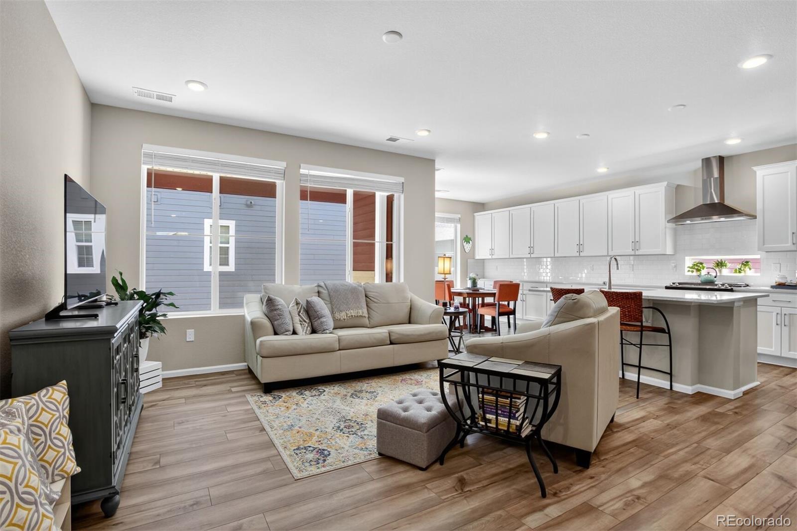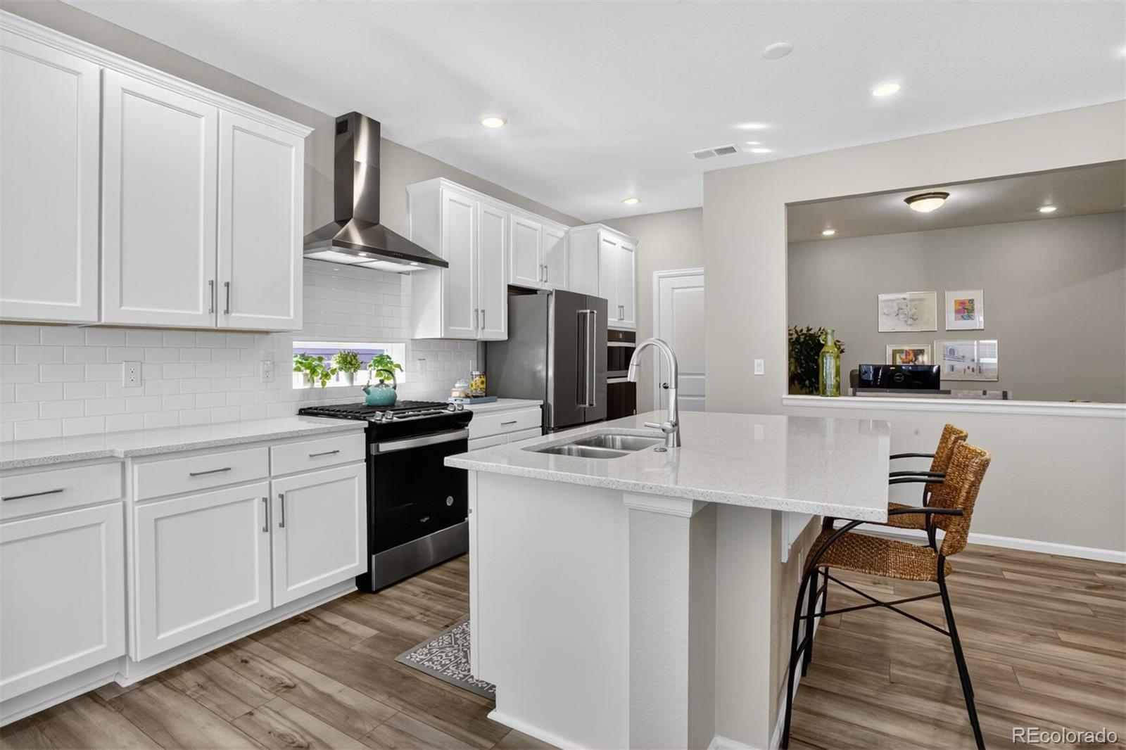“Short Sale, Sold As-Is.” Welcome to this well-maintained Voyager ranch home in the desirable Reserve Oakwood Homes 55+ gated community. Open concepts design, the large kitchen island with quartz countertops & white backsplash 3 x 6 tiles ample Frisco white cabinet w/Satin Nickel hardware space, cabinets self-close w/pullouts, all appliances included, large walk-in pantry, the separate dining space is perfect for gatherings & lively conversations while the living room will inspire memorable moments. The flex room is great for den/study, dining area, reading room & so on, and a convenient main floor laundry, 2 car oversized garage with plenty of storage space. Featuring an inviting ambiance, the main floor offers primary and second bedrooms, a second full bathroom, and an open office for easy access on one level. Upgraded LED disk lights & ceiling fan prewire package. Luxury Vinyl plank flooring (waterproof) thought out the home & carpet in both bedrooms. The spacious primary suite boasts a walk-in closet, double vanity, with double garage cabinet tile flooring and spa shower with a surround tile finish and a bench seat. The covered back patio is perfect for your outdoor enjoyment with 6ft maintenance free privacy fence with gate. Front yard is landscaped & maintained by the Metro District who also shovel the paver stone driveway! Enjoy a truly low-maintenance lifestyle with an HOA that covers ground maintenance & snow removal, giving you more time to embrace the exceptional community amenities. At The Reserve, you’ll have access to a clubhouse, fitness center, & a pool, spa/hot tub—all within a secure, vibrant environment tailored to adults. This home is a must-see, located just a few blocks from the clubhouse and pool, with easy access to parks, schools, shopping, DIA, Light Rail, trails I-70 and E-470, but the home is located away from busy streets. Welcome to your new home! Buyer will pay a transfer fee when they purchase the home:0.5% on the purchase price.