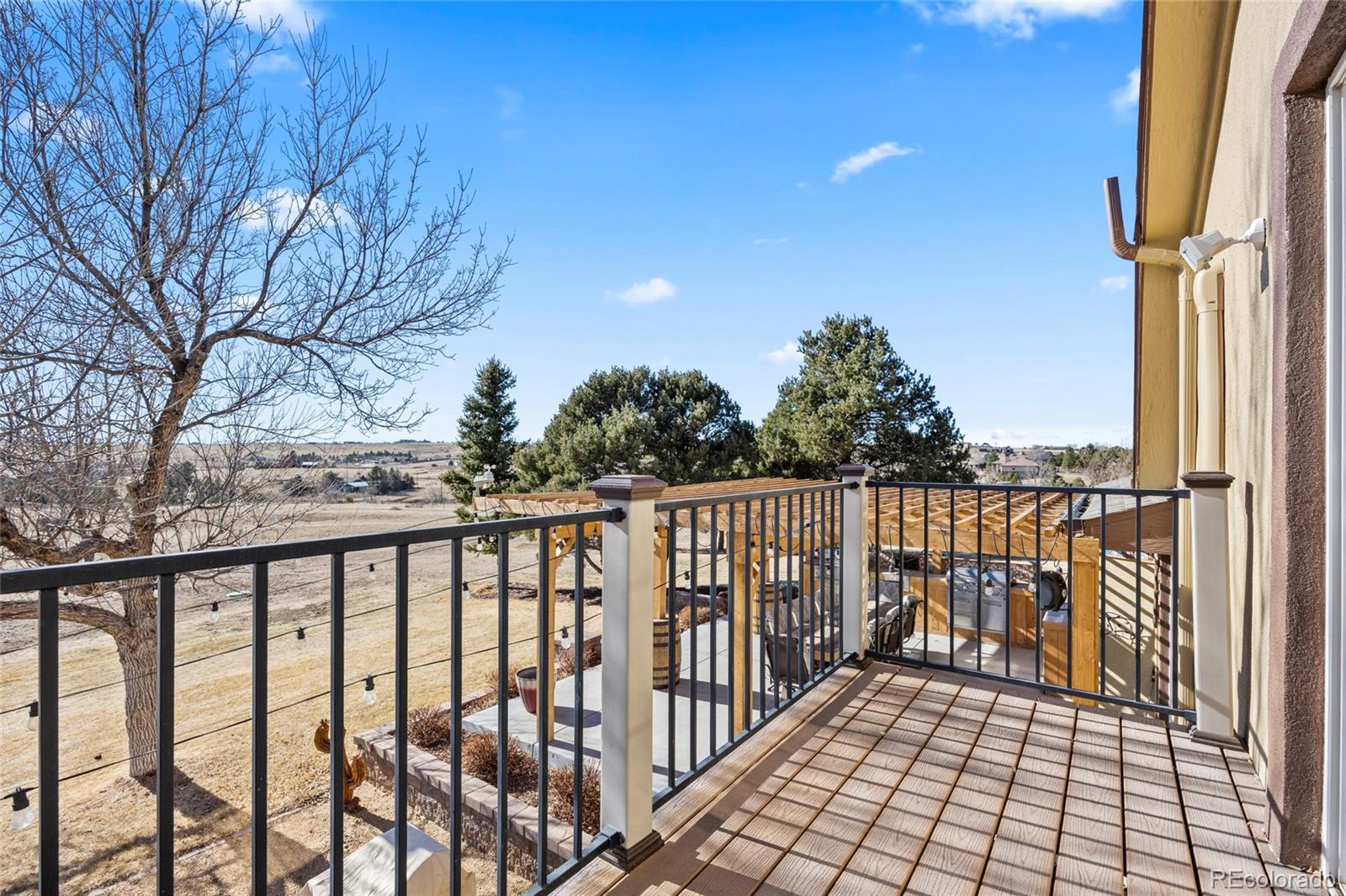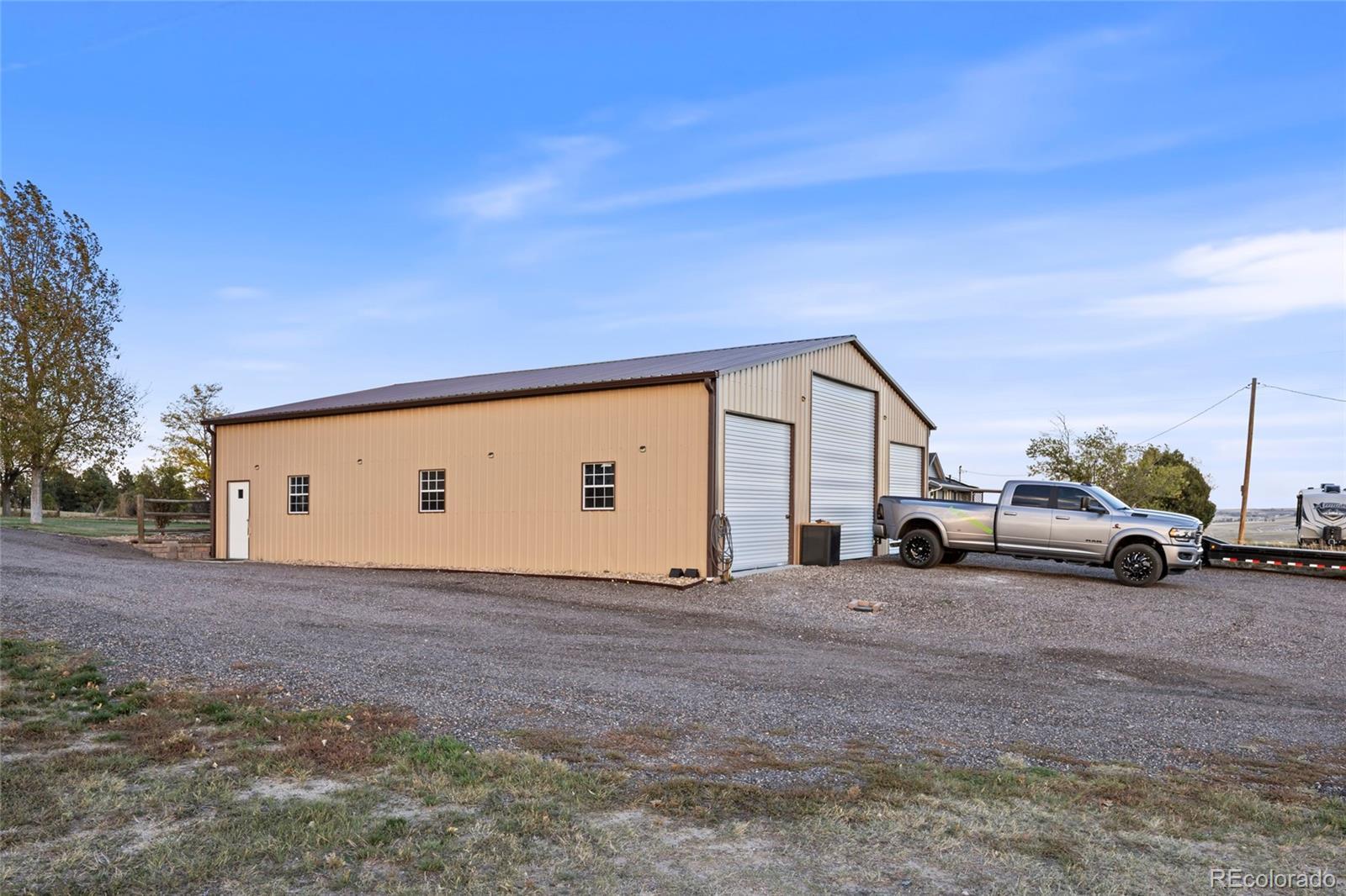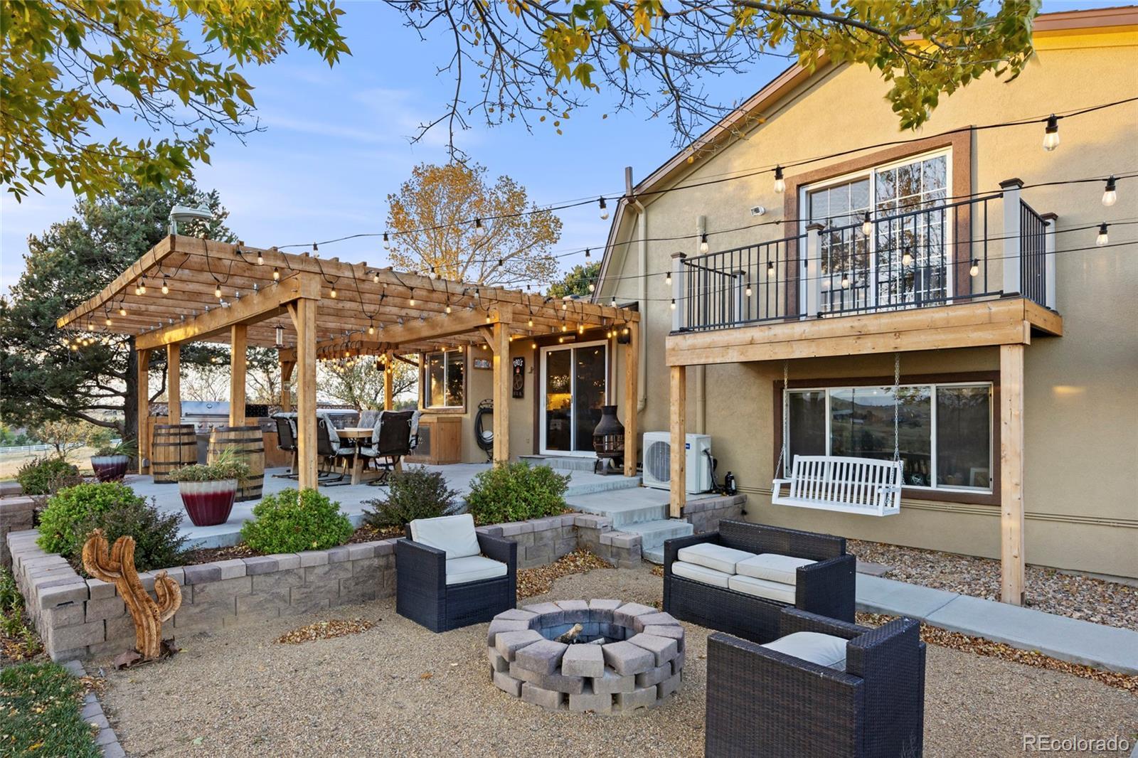 Immaculate, fully remodeled 4-bedroom, 3-bath home on 5 acres just 15 minutes from downtown Parker and Southlands area, offering breathtaking Pikes Peak mountain views!! This turn-key acreage property has been completely updated inside and out. The main level features a bright living room with extended LVP flooring and a stunning remodeled kitchen with quartz countertops, new cabinetry, tile backsplash, pantry with pullouts, butcher block counter with built-in pet feeding station, stainless steel appliances, modern open shelving, breakfast bar, and eat-in dining. Step outside to an expansive outdoor living space with covered pergola and outdoor kitchen, complete with gas plumbed grills and perfect for entertaining. The upper level showcases an oversized primary suite with private balcony to enjoy the serene views, spa-inspired bath with dual sinks, dual-head walk-in shower, and a custom walk-in closet that's anyone's dream. The lower level offers a cozy family room with updated stone fireplace, plus a bedroom and renovated ¾ bath. A finished basement adds two additional bedrooms with newer egress windows and shared ¾ bath. There's a convenient mudroom, separate laundry with utility sink, and abundant storage throughout. Ideal for RV owners, car enthusiasts, or home-based businesses, the property includes an oversized attached 2-car garage, detached 2-car garage, 2,250 sq ft metal RV/outbuilding with included 10K 2-post car lift, and a 780 sq ft barn with water and electricity—bring your horses or chickens! The property includes an RV dump and RV power hookups as well. Other features include two mini-split cooling units, new stucco and paint, newer windows and roof, new well pump, hot tub hookups and partial fencing with exception to a small section of the front of the property. Furniture and equipment may be included - call the listing agent for more info. A rare opportunity for Colorado country acreage living with NO HOA and close to town!