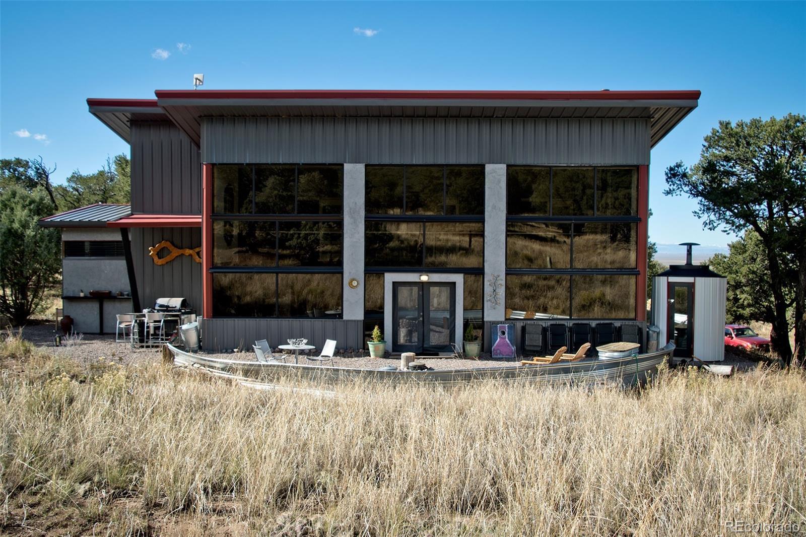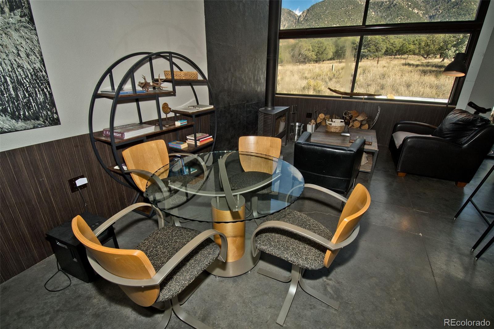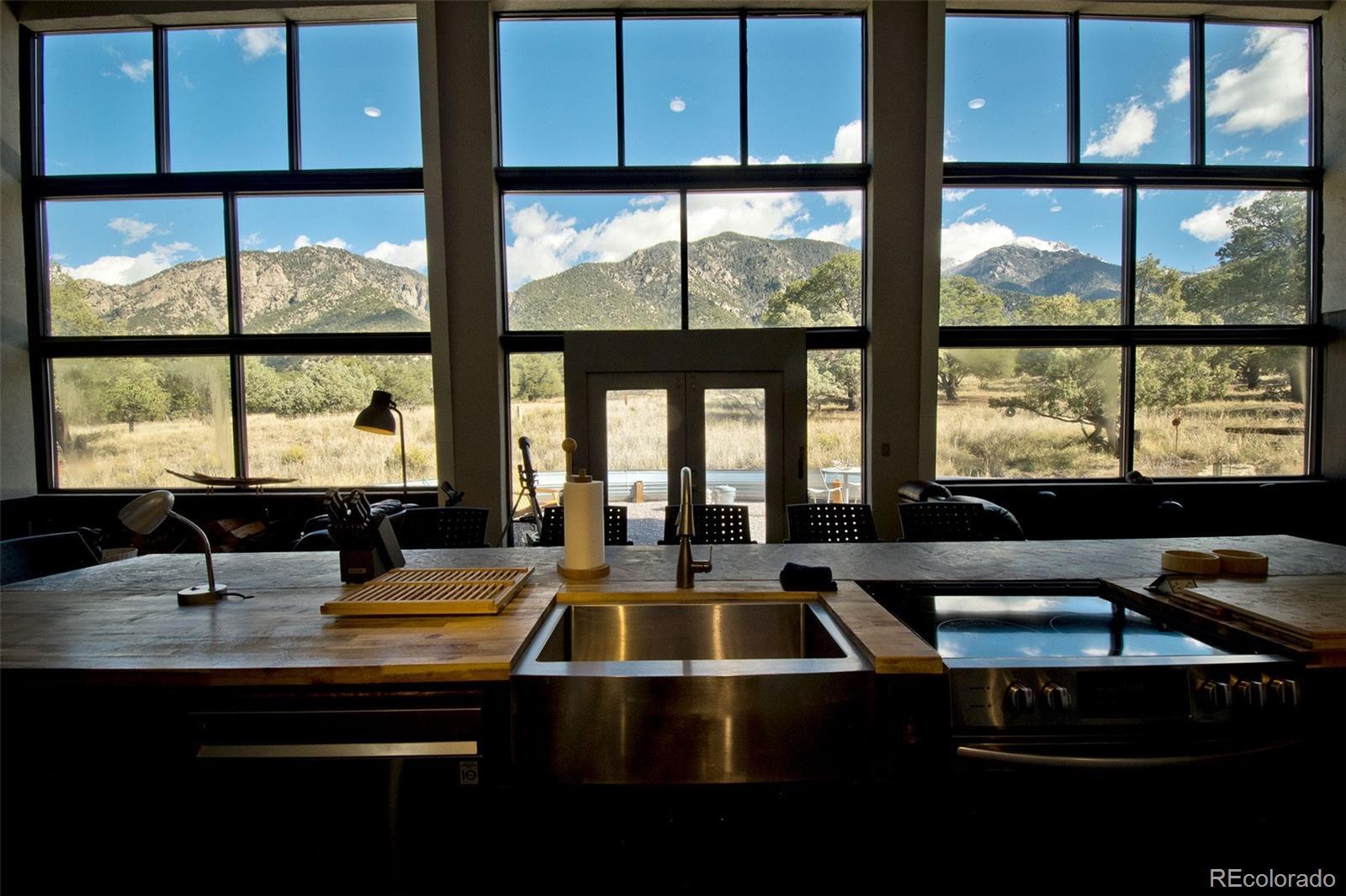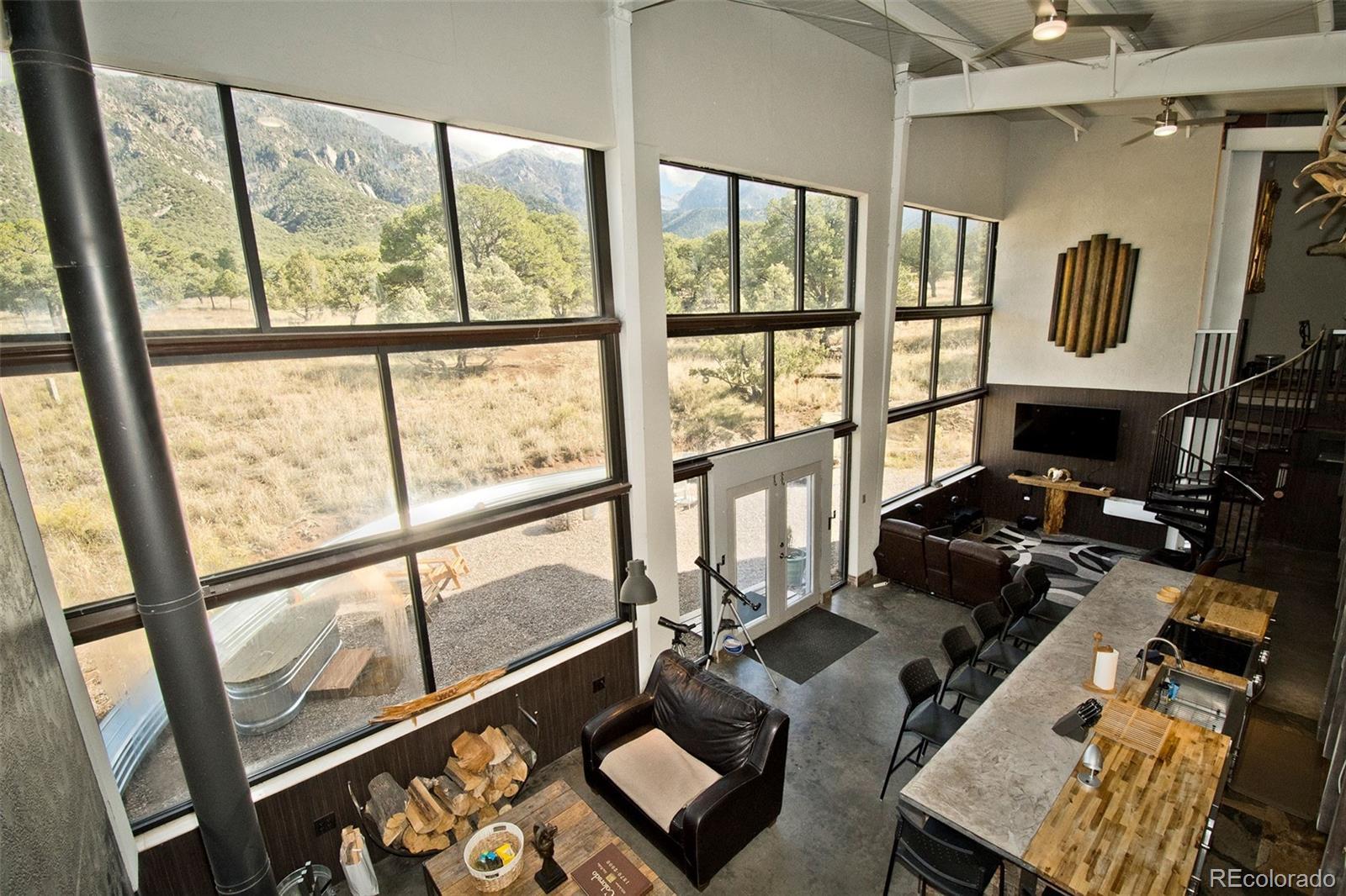 As you enter the foyer of this home, and step into the great room, with its expansive 24 ft. ceilings, and floor to ceiling windows, the views, and detailed craftsmanship, will take your breath away. The owner/builder/artists attention to detail will leave you amazed. The steel engineered construction exceeds the snow, wind requirements of the IRC, and make this home extremely fire resistant. The open floor plan, exudes comfort, and tranquility. When you are inside, with National Forest out the back door, and through the wall of windows you want to curl up by the fire and read a book. The mountains, and creek pathways of cottonwoods, adorn the back view. The modern kitchen with, a kitchen eating island and concrete counter, could accomodate 10 people, and features depth, personality, and a handcrafted aesthetic to a highly durable surface. The Norwegian free standing wood stove, can be enjoyed from the living and eating areas. 2 large bedrooms, and oversized bathroom, are on the lower level, and 2 additional bedrooms, and 1 bath on the upper level. A handcrafted wood deer head sculpture overhangs near the upstairs walkway, guiding you on your way to the bedroom sanctuaries. The upstairs is accessed by a spiral staircase, and modern track lighting throughout the great room area. Step outside to the back patio surrounded by forest, and mounatins, and take a cold plunge, and sauna, to relax your mind and body.