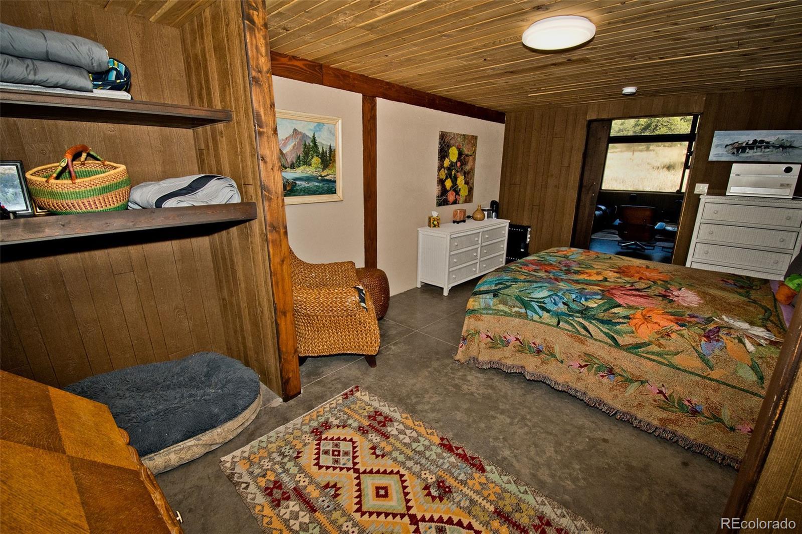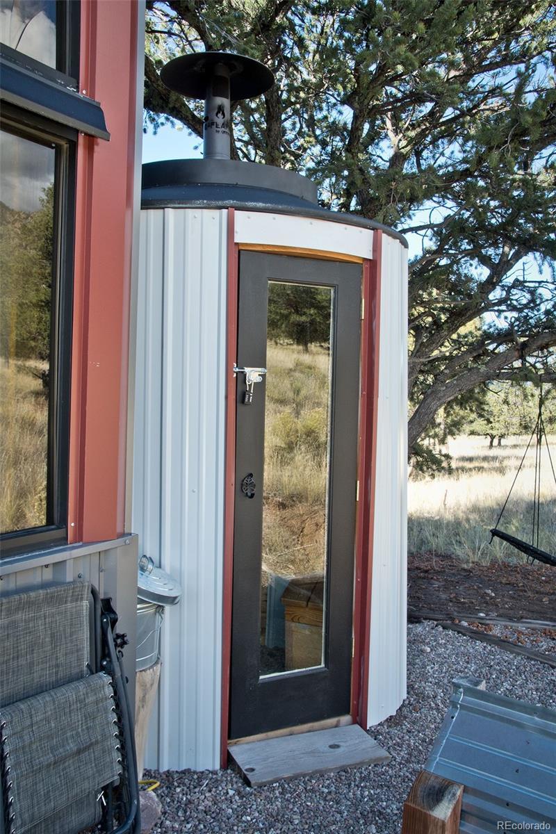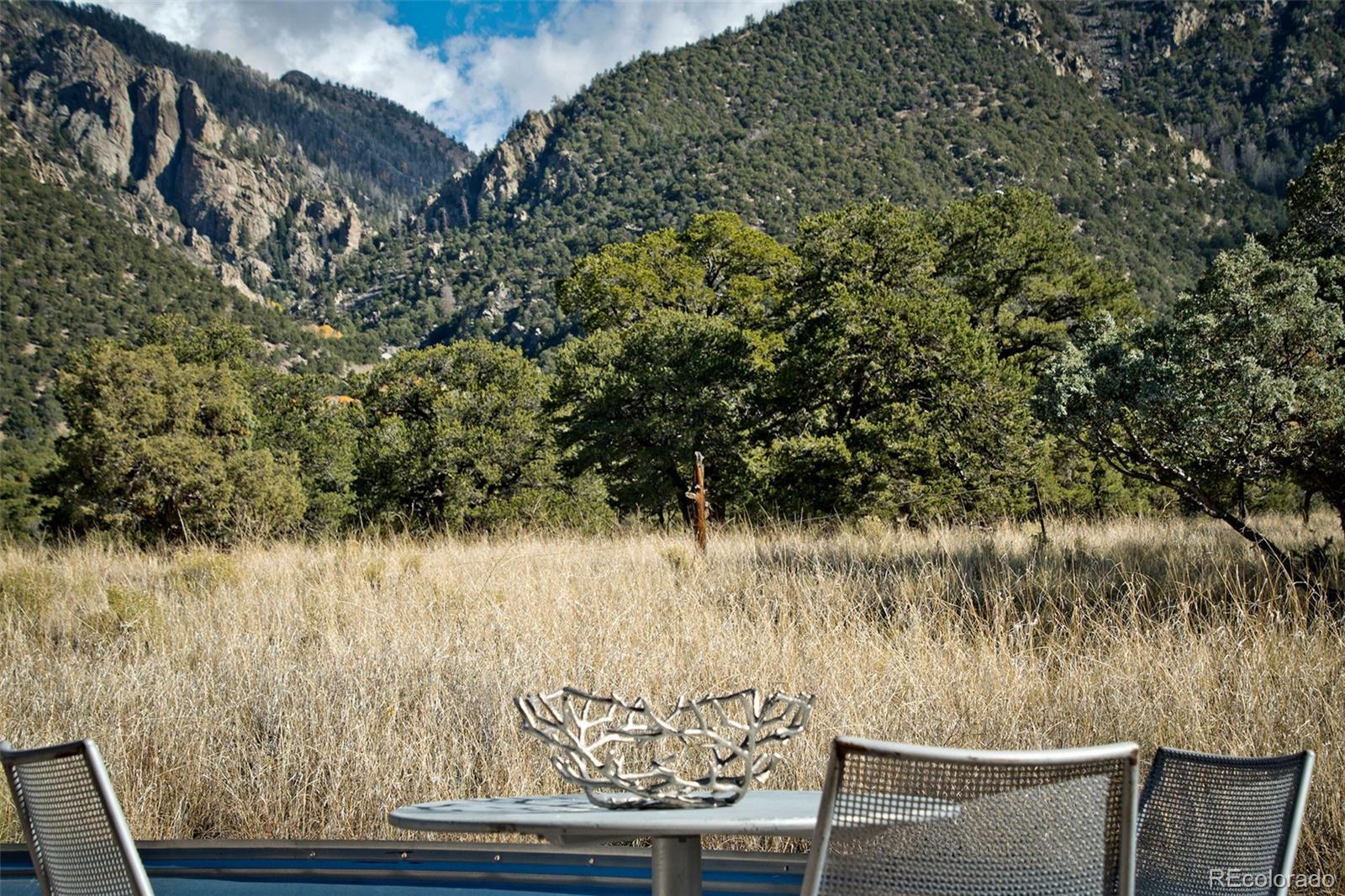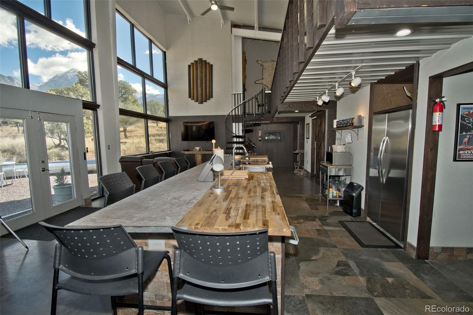As you enter the foyer of this home, and step into the great room, with its expansive 24 ft. ceilings, and floor to ceiling windows, the views, and detailed craftsmanship, will take your breath away. The owner/builder/artists attention to detail will leave you amazed. The steel engineered construction exceeds the snow, wind requirements of the IRC, and make this home extremely fire resistant. The open floor plan, exudes comfort, and tranquility. When you are inside, with National Forest out the back door, and through the wall of windows you want to curl up by the fire and read a book. The mountains, and creek pathways of cottonwoods, adorn the back view. The modern kitchen with, a kitchen eating island and concrete counter, could accomodate 10 people, and features depth, personality, and a handcrafted aesthetic to a highly durable surface. The Norwegian free standing wood stove, can be enjoyed from the living and eating areas. 2 large bedrooms, and oversized bathroom, are on the lower level, and 2 additional bedrooms, and 1 bath on the upper level. A handcrafted wood deer head sculpture overhangs near the upstairs walkway, guiding you on your way to the bedroom sanctuaries. The upstairs is accessed by a spiral staircase, and modern track lighting throughout the great room area. Step outside to the back patio surrounded by forest, and mounatins, and take a cold plunge, and sauna, to relax your mind and body.