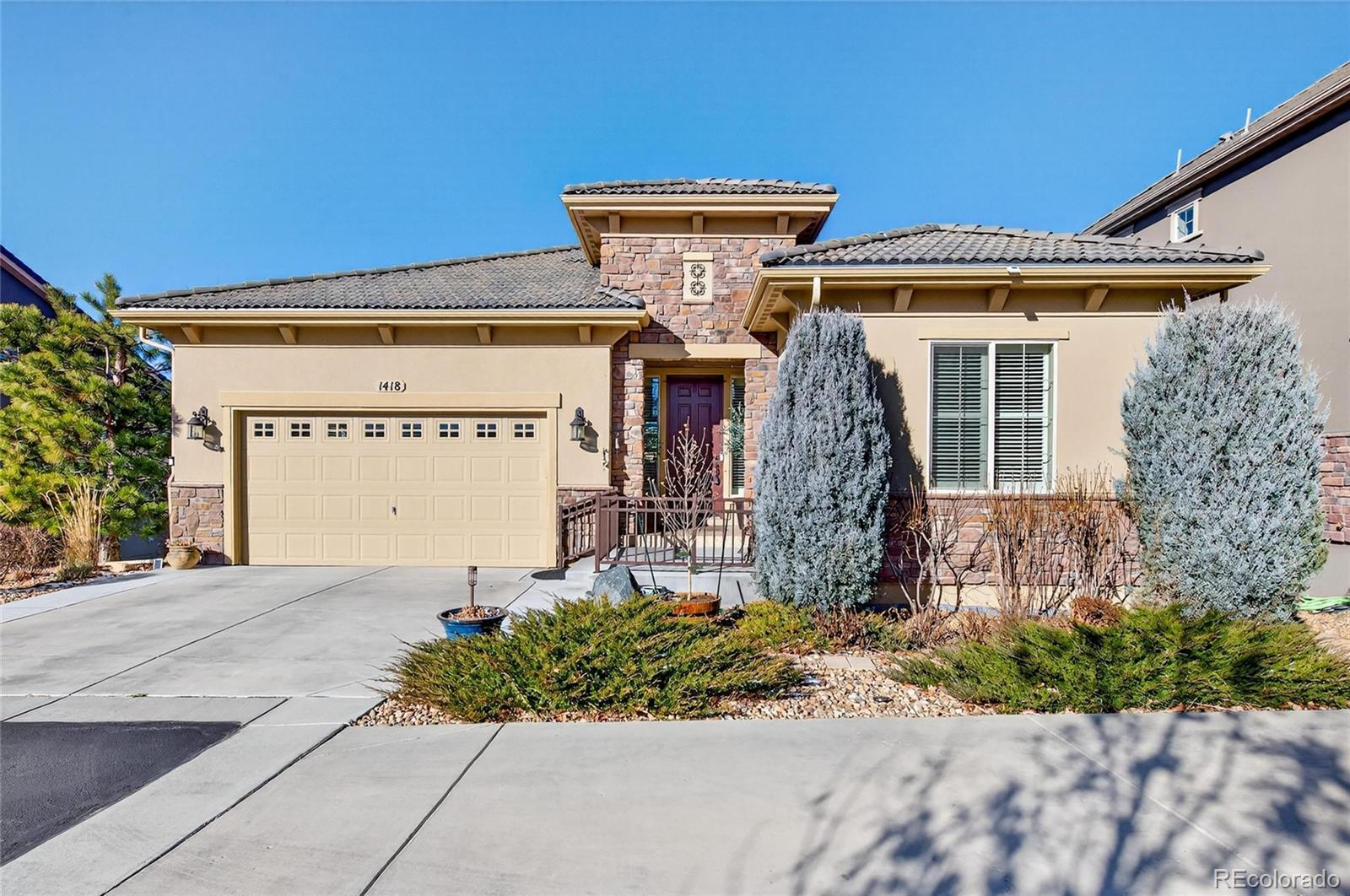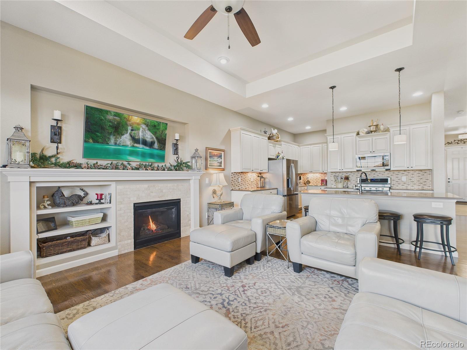 You will love his thoughtfully appointed ranch-style home w/ fantastic layout and nice views. The open floor plan is enhanced by wood flooring and an abundance of windows, creating a bright, airy atmosphere that flows easily from room to room. The kitchen is designed for both daily living and entertaining, offering an expanded island, gas cooktop, and a large walk-in pantry. It opens naturally to the living room, where a gas fireplace adds warmth and visual appeal. A flexible bonus room provides space for a home office, library, or dining room, allowing the home to adapt to your needs. The main-level primary suite is a peaceful retreat with coffered ceilings, plantation shutters, and a spa-inspired bath featuring a soaking tub and a spacious glass-enclosed shower. A second bedroom and full bathroom, along with a convenient laundry/mudroom with a utility sink just off the garage, complete the main floor. The finished walk-out basement extends the living space with a large family and entertaining area, a third bedroom, and another full bathroom. A custom wine cellar and built-in wet bar with a bar refrigerator and dishwasher create an ideal setting for hosting, while an oversized storage room provides ample space for organization. Outdoor living is a highlight, with a three-panel sliding door leading to a covered deck featuring a built-in gas fireplace. Enjoy mountain views, sunsets, and hot air balloons drifting by on summer and fall mornings. Additional features include a fully finished garage with epoxied flooring, hardwired ADT security system with video doorbell, and integrated Sonos surround sound. The HOA handles exterior landscaping and snow removal and offers access to an impressive range of amenities, including the Colorado National Golf Course, pickleball,pools, a fitness center, clubhouse, trails, and parks—all conveniently located near shopping, dining, and major highways. Come discover this GEM. WELCOME HOME!