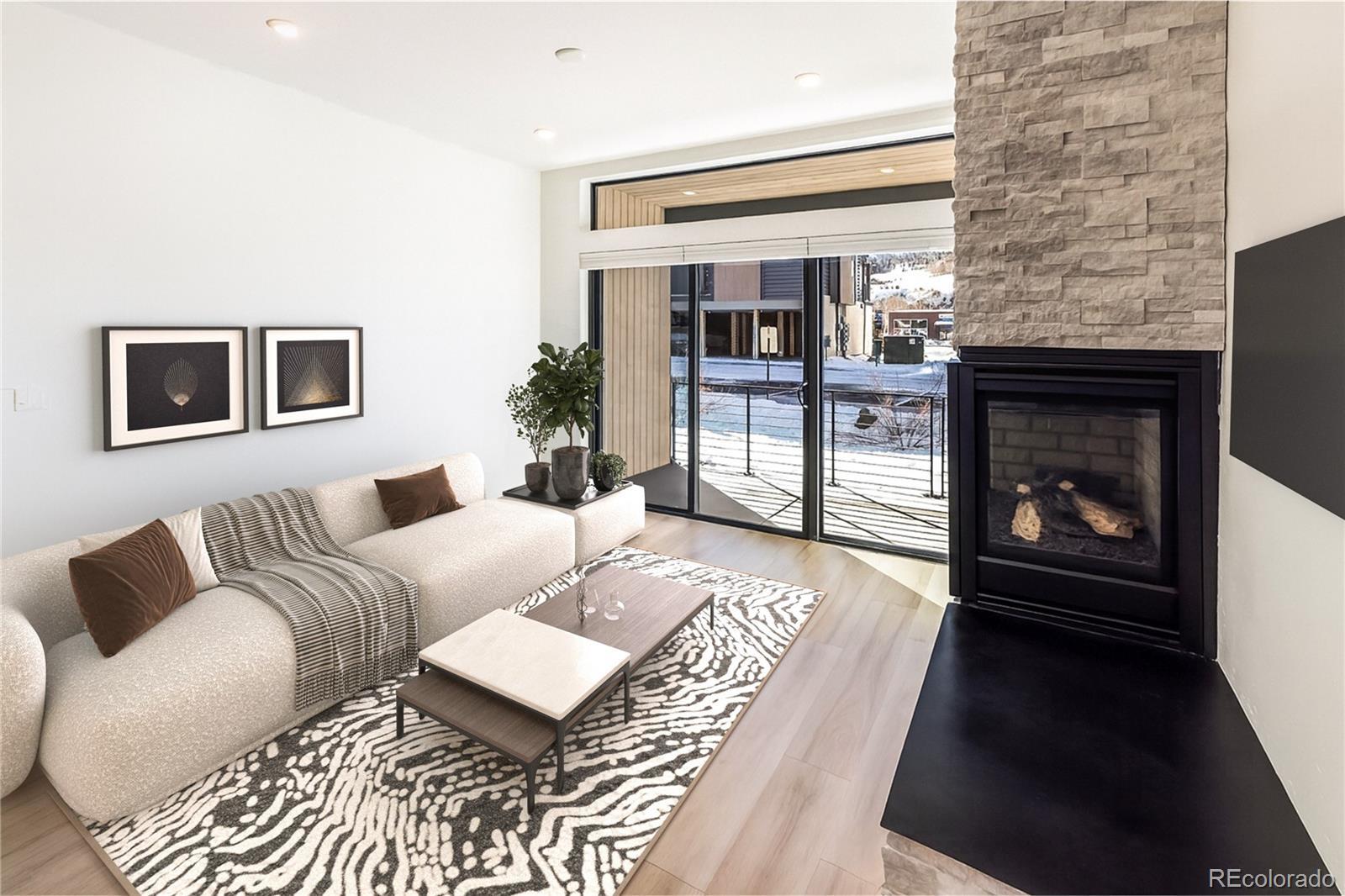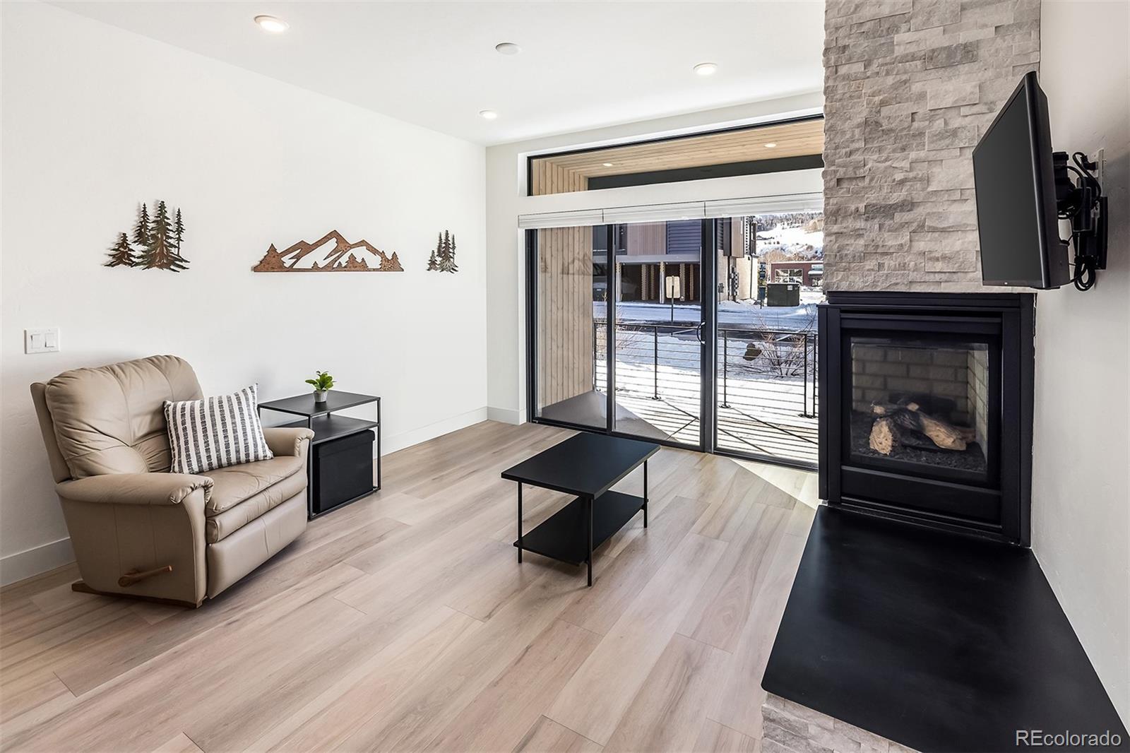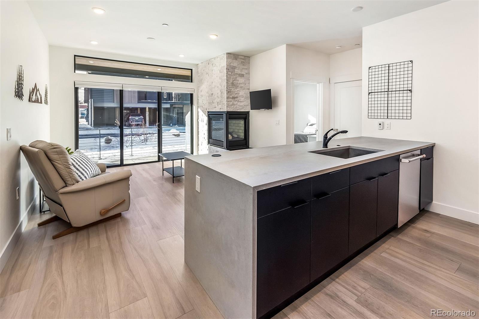 Welcome to the Rockies and your new Summit County basecamp for all your mountain adventures! Built in 2020, enjoy the modern build and finishes throughout this River West Condos. Bright wood floors and white tile contrast perfectly with the dark wood finishes of the cabinets, trim and doors. The waterfall leathered quartz countertops act a show piece in the open concept living and kitchen area. The floor to ceiling stone fireplace add to the modern style finishes, providing a warm and comfortable living area after a long day on the ski hill. Enjoy the spacious bedroom and sizable bathroom, both with matching finishes. Located within the up-and-coming town of Silverthorne, boasting growing downtown and arts culture, this property’s easy access to the bike path connects it to all the town events and county ski resorts. From modern finishes to a prime location, make this River West Condo your next home in the Rocky Mountains!
