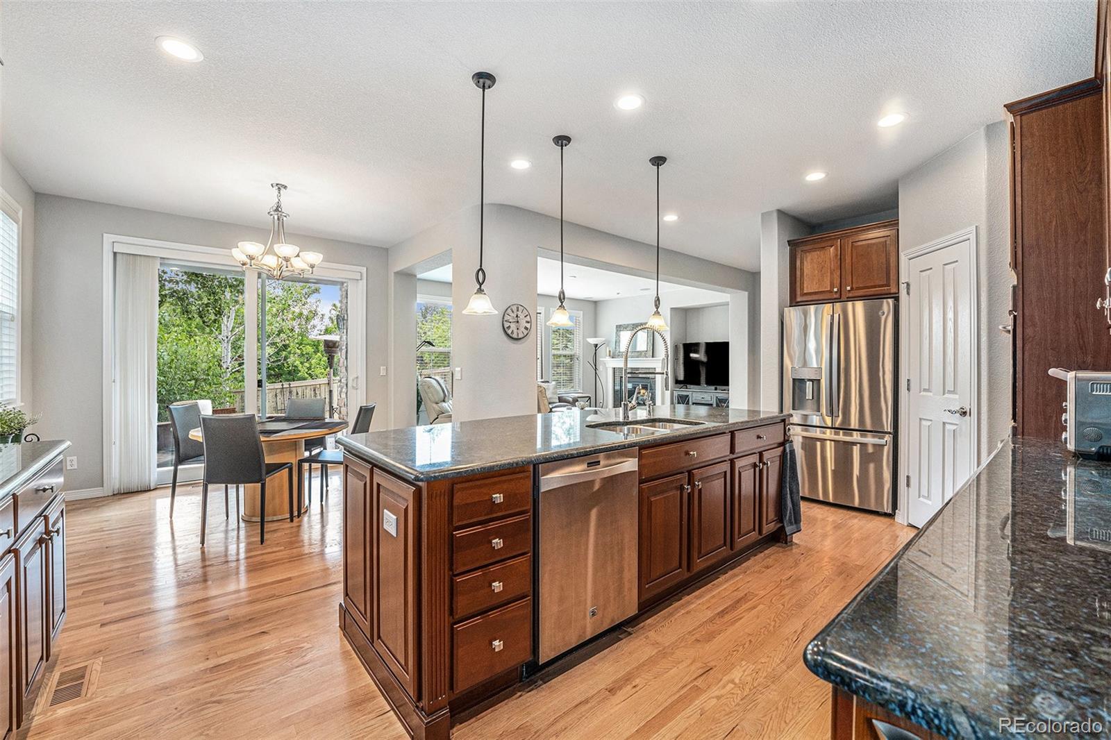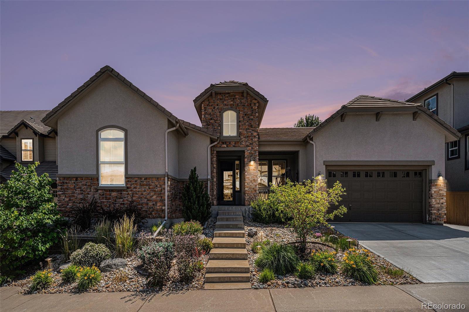 Low Maintenance Living in Highlands Ranch! Rare Main-Floor Primary Suite in The Retreat at The Hearth! Discover this stunning ranch-style home tucked into an exclusive enclave of upscale residences with a private backyard backing to a greenbelt. Artificial turf backyard, no mowing required. With 4 bedrooms, 4 baths, a fully finished basement, and a 3-car garage, this home blends comfort, elegance, and functionality. Step inside to a light-filled, open floor plan featuring hardwood floors, designer paint, and a gourmet kitchen with stainless steel appliances, gas cooktop, and an oversized center island with breakfast bar. The spacious great room, complete with fireplace and wall of windows, flows effortlessly into the formal dining room and main-floor study/living room—perfect for gatherings. The expansive main-floor primary suite is a true retreat, offering a 5-piece spa bath, and generous walk-in closet. Two additional bedrooms and a convenient laundry/mudroom complete the main level. Downstairs, the fully finished basement is an entertainer’s dream, showcasing a large rec room, media and game areas, custom wet bar with dishwasher and a private guest suite with full bath. Modern upgrades include dual high-efficiency furnaces and air conditioners, all controlled by a Nest thermostat. Outdoor living shines with a covered front porch, private backyard, patio, water feature, and peaceful greenbelt views. The oversized 3-car garage includes a service door for added convenience. New concrete driveway and sidewalks (2024). Ideally located just minutes from Park Meadows, DTC, I-25, C-470, E-470, RidgeGate, Sky Ridge Medical Center, and light rail. Enjoy walkable access to top-rated Douglas County schools, parks, sports fields, the rec center, and miles of scenic trails. Don’t miss this rare opportunity to own a retreat that perfectly balances luxury, location, and lifestyle!