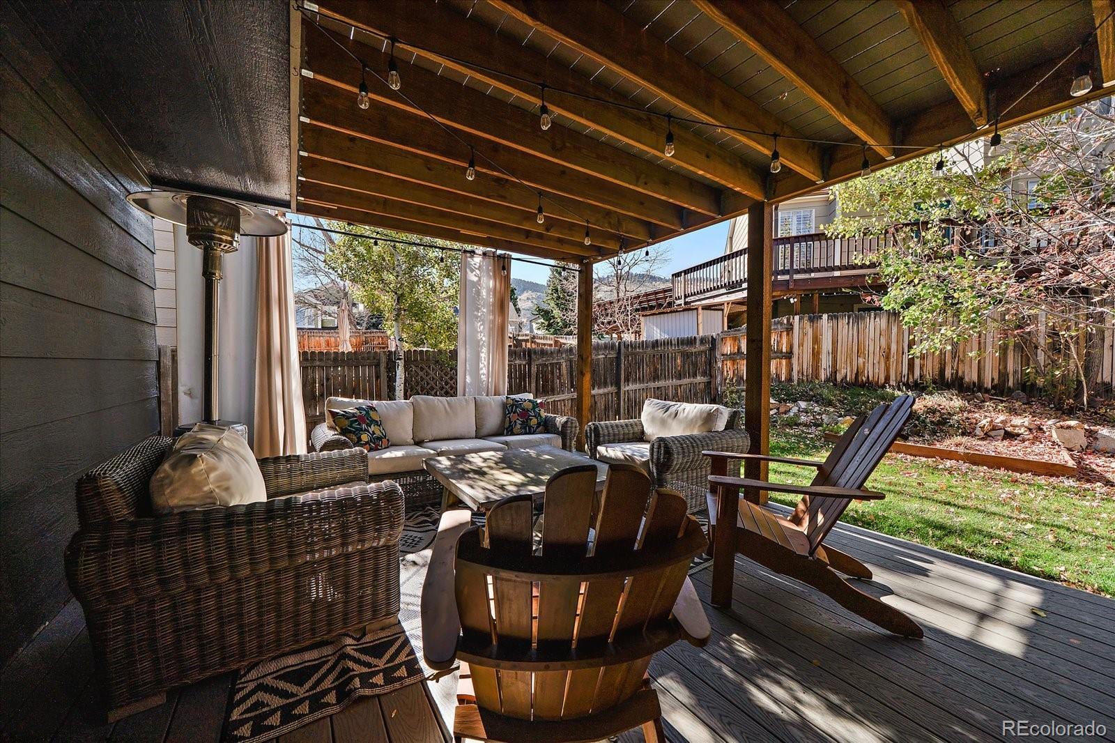 Nestled in the foothills at the base of Apex Park in one of Golden’s most sought-after neighborhoods. This warm and inviting home features open-concept living, hardwood floors and abundant natural light. Upon arrival, you’ll be taken by the home’s front porch charm and updated xeriscape landscaping that adds curb appeal with minimal upkeep. Inside, the open-concept main level creates a seamless flow that’s ideal for everyday living and entertaining. A well-appointed kitchen with stainless steel appliances opens to the dining and living areas, offering an effortless connection with family and friends. The living room feels warm and cozy with its vaulted ceiling and gas fireplace. Step through the living area’s sliding glass doors to the private, covered patio. A perfect outdoor dining room where you can fire up the grill, entertain, enjoy meals with family and friends, and enjoy year-round outdoor living. Upstairs, you’ll find an updated bathroom and two comfortable bedrooms including a generous primary suite with a walk-in closet. Adjacent the primary suite, French doors lead to the new, elevated deck affording commanding views of the foothills landscape. Venture downstairs to the finished basement with new LVP flooring where you’ll find an updated bathroom, flexible space for a third bedroom, home office, gym, media room or guest suite. The backyard provides just the right amount of privacy and space for low-maintenance living. The home’s location can’t be beat. You’ll enjoy quick access downtown to Golden with its shops and restaurants, Shelton Elementary School, Kinney Run and Apex trail systems, the School of Mines, Red Rocks Amphitheatre, Fossil Trace Golf Course, and I-70 and 6th Avenue for quick access to the mountains and Denver.