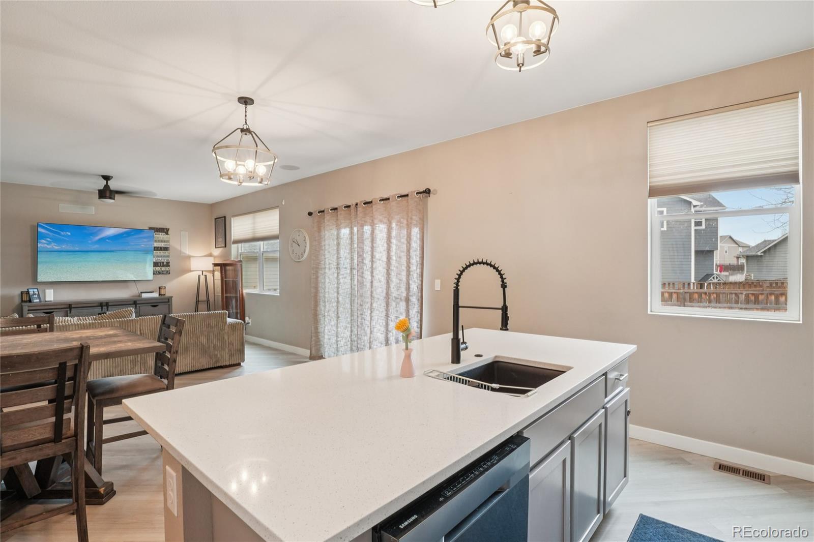 Experience the pinnacle of the Silver Peaks community in this stunning, custom-built residence. As the newest home in the neighborhood, this property stands apart with premium finishes and high-end upgrades that far exceed the local standard. The exceptional curb appeal and charming front porch offer a warm welcome, leading you into a sun-drenched flex space perfect for a formal dining room or a quiet home office. Moving down the hall past the discrete powder room, the home opens into an expansive main living area designed for effortless entertaining. Fresh paint and stylish LVP flooring flow throughout the main level, while a built-in sound system allows you to set the perfect mood for any occasion. The heart of the home is a designer kitchen outfitted with sleek quartz countertops, premium cabinetry, a spacious walk-in pantry, and a large island with breakfast bar seating. This culinary space flows naturally into the dining area, where sliding glass doors provide easy access to the backyard. For everyday convenience, the attached two-car garage is located just off the kitchen, making grocery trips and daily transitions a breeze. All four bedrooms are intentionally situated on the upper level to ensure a peaceful retreat away from the main living areas. The primary suite serves as a true sanctuary, featuring a private en-suite bath with a massive walk-in shower, a dual-sink vanity, and a generous walk-in closet. Three additional bright bedrooms, a full hallway bath, and a dedicated laundry room complete the second floor. Outside, the professional landscaping and fully fenced backyard offer a secure and private blank canvas with endless potential to create your own outdoor oasis!