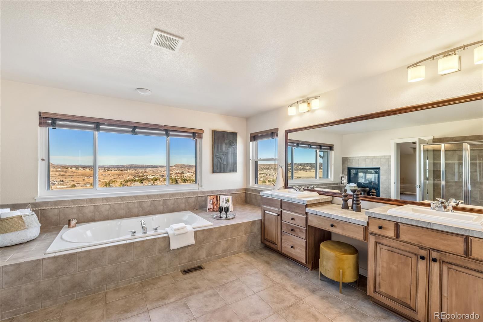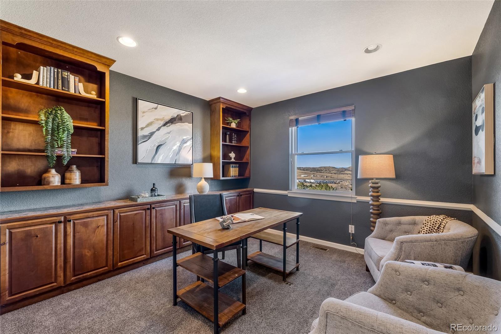 Welcome to this beautifully updated and meticulously cared-for home in the highly sought-after Plum Creek neighborhood. Come inside to an inviting formal entryway and dining room. You’re immediately welcomed by a light-filled layout with high ceilings and expansive living spaces showcasing stunning city, golf course, and mountain views. The updated kitchen flows seamlessly into the expansive living area—perfect for entertaining or everyday living—and opens to a spacious deck where you can take in breathtaking views of the city and mountains. Looking for a home office? You’ll love the built-in cabinetry that provides both function and charm. A convenient main-floor laundry room adds ease to your daily routine. Upstairs, you’ll find three bedrooms and three full bathrooms, highlighted by a spacious primary suite with vaulted ceilings and an attached bonus room—perfect for a gym, reading nook, or nursery. The true showstopper is the custom walk-in closet, designed with exceptional storage, refined finishes, and a boutique-style layout that feels both luxurious and highly functional. The primary suite is complete with a spa-like five-piece en-suite bath. Head down to the fully finished basement to discover a true entertainer’s retreat: a theater room, bar area, and additional living space. The climate-controlled wine cellar offers exceptional storage. You’ll also find a guest-friendly bedroom and bathroom, plus access to a concrete patio ideal for hosting gatherings. Curious about the updates? This home features: Furnace + AC, Tankless Water Heater: 2021; all new windows, front door & sliding glass door: 2022; all newer appliances; new carpet: 2023, Exterior paint: 2023; New roof: 12/2024. You’ll love having Emerald Park’s playground and a nearby golf course close by—plus downtown Castle Rock’s shops, restaurants, and entertainment are just minutes away. If you’re looking for a true move-in-ready home, don’t miss this turn-key opportunity in an incredible location!