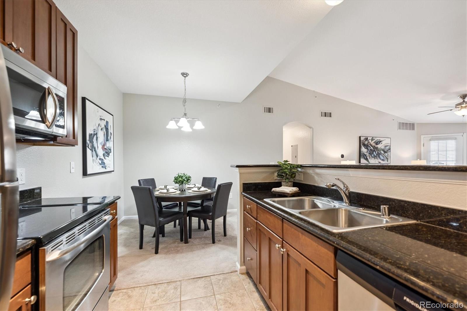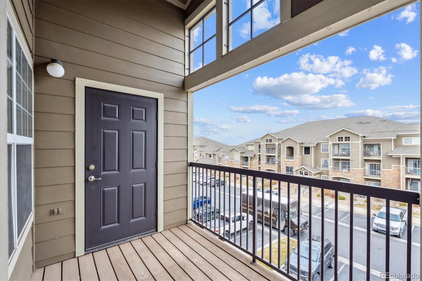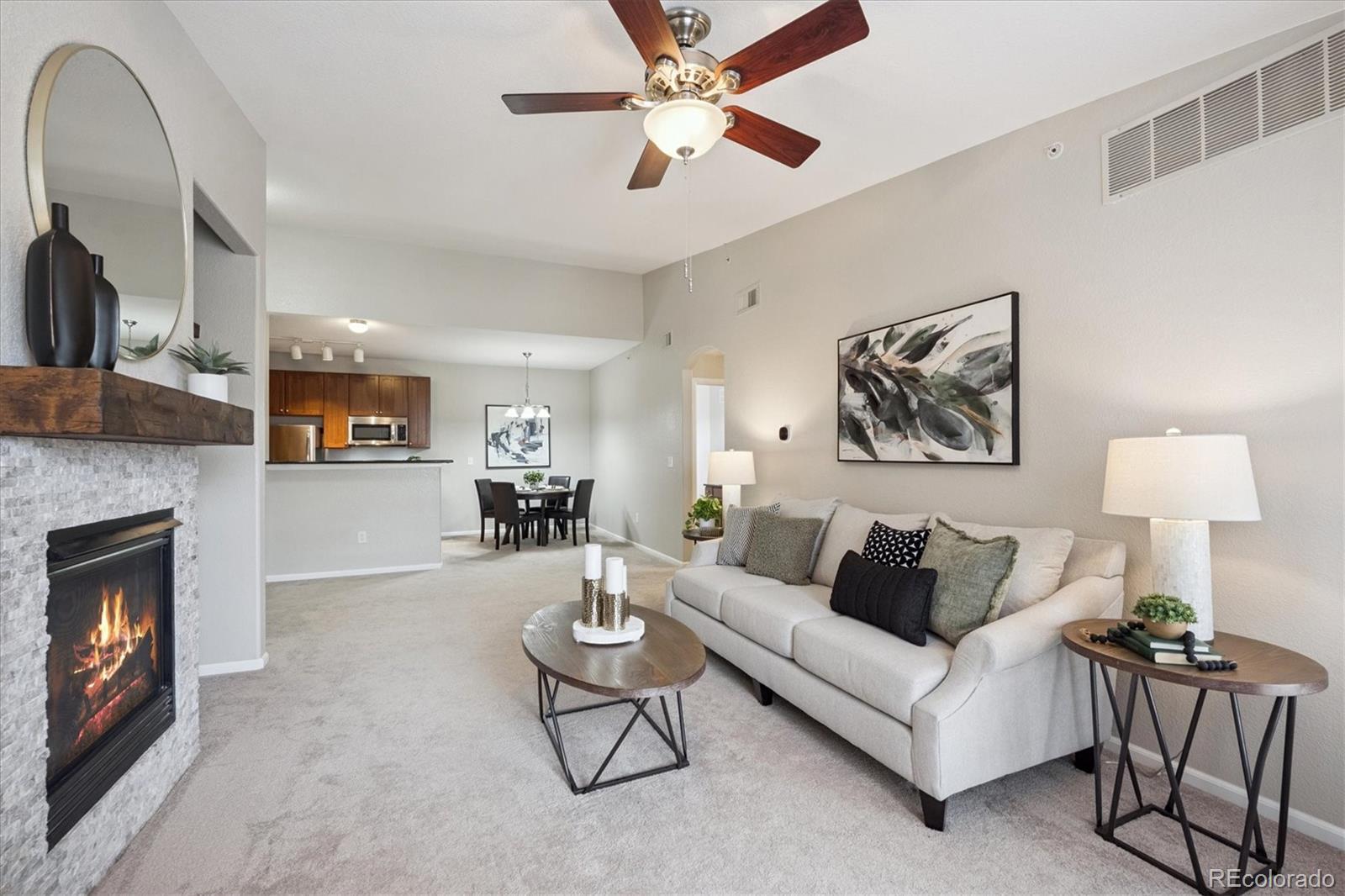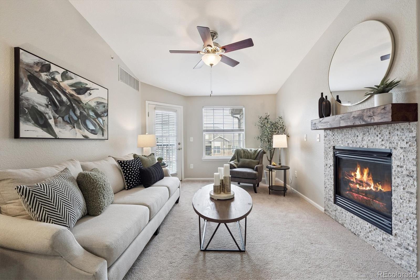 Discover comfort, style, and convenience in this beautifully maintained penthouse condominium, complete with a rare one-car detached garage. This inviting 2-bed, 2-bath home features rich cherry cabinets and granite countertops, paired with stainless steel appliances and an updated garbage disposal installed in 2021. The spacious living room centers around a freshly serviced gas fireplace and opens to a private deck—perfect for relaxing or entertaining. Major system upgrades provide peace of mind, including a new furnace and A/C in 2022, a water heater replaced in 2021, and all smoke detectors replaced in 2023. The community also benefited from new roofs throughout in 2022, adding long-term value and security. The generous primary suite stands out with direct balcony access, a large walk-in closet, and a refreshed full bathroom featuring double vanities, a soaking tub/shower with modern subway tile surround, and a linen closet. The thoughtful floor plan offers excellent flexibility—ideal for roommates, a home office, or a small family. Set within the desirable Blue Sky community, residents enjoy resort-style amenities including a swimming pool, clubhouse, fitness center, park, and playground—creating the perfect blend of comfort and lifestyle living. This rare garage-included unit is truly a standout opportunity in a well-cared-for community