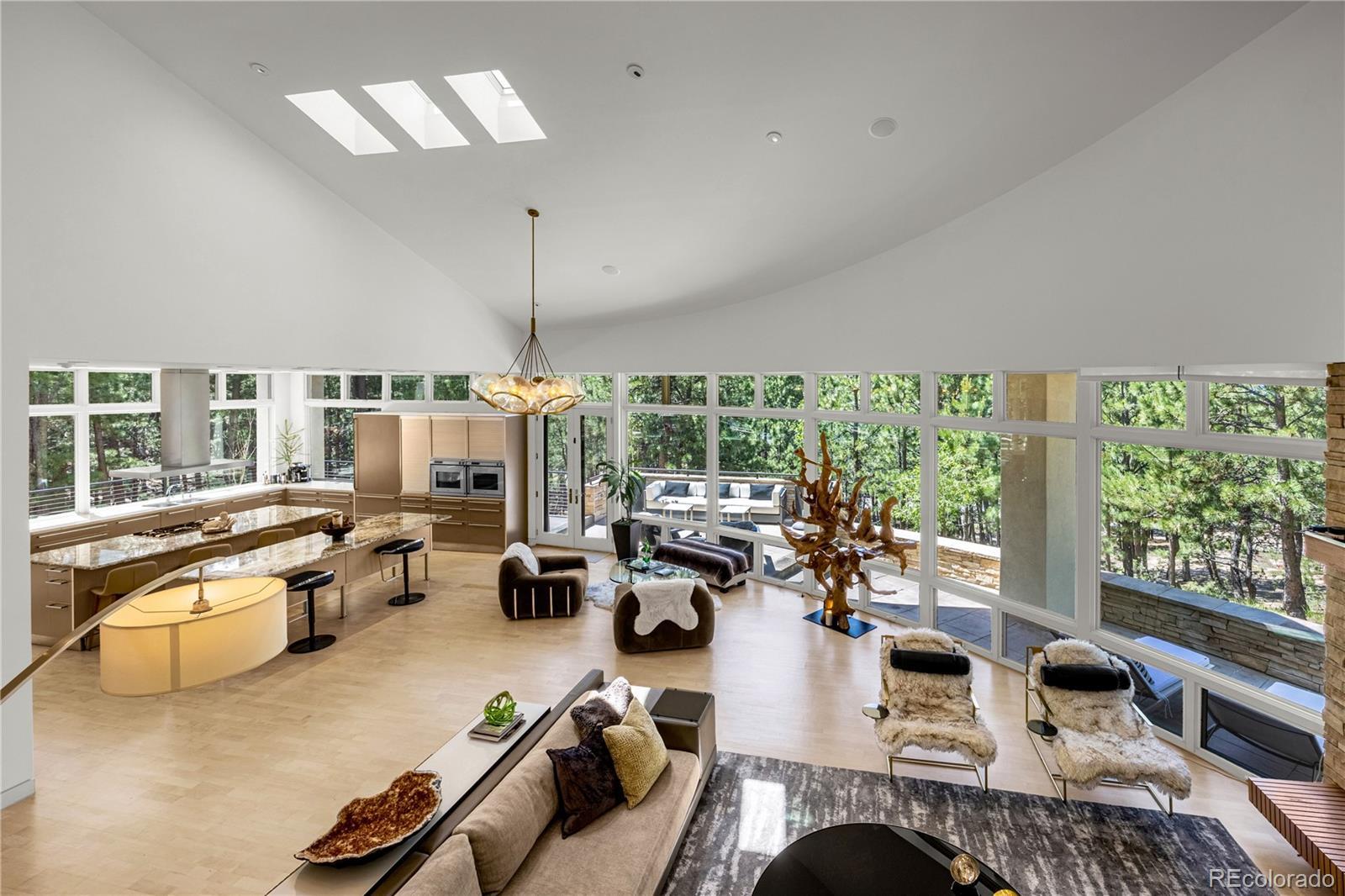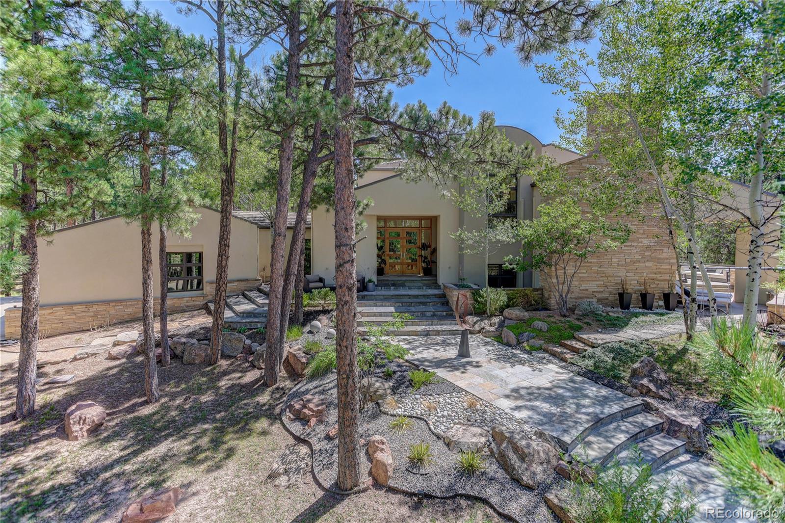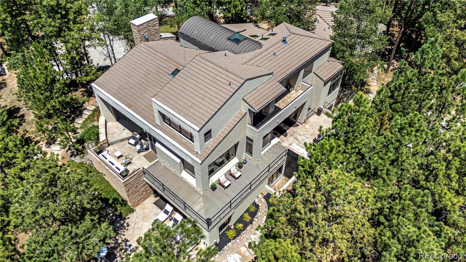 Rare Opportunity: One-of-a-Kind Colorado Contemporary Masterpiece. Modern. Engineered. Irreplaceable. This isn’t just a house. It’s a statement. A fully engineered, design-forward Colorado Contemporary crafted for those who refuse to settle for builder-grade and crave something truly exceptional. Only one lot like this. Only one home like this. And once it’s gone, it’s gone. This award-winning architectural triumph is set on 2.5 acres of forested land with unobstructed views of Pikes Peak. Designed by acclaimed architect Sears Barrett, the home is a living sculpture of light, glass, and precision. A soaring 50-foot wall of windows rises to cathedral ceilings, perfectly framing the pine canopy and Colorado sky. Crafted for those who demand preeminence, privacy, and provenance. This is a home that doesn’t chase trends...it sets them. The main level features a dual-island chef’s kitchen with German-designed Bulthaup cabinetry, Silestone and granite counters, and a world-class appliance suite: Sub-Zero, Gaggenau, Miele, Franke, and Dornbracht. Skylights and window walls flood the interior with natural light, while the custom fireplace anchors a great room that flows seamlessly to a wraparound terrace with an outdoor hearth. The entire upper level is a private owner’s retreat with two sitting areas, a see-through fireplace, spa-inspired five-piece bath with French beige limestone, and commanding views. The walk-out lower level includes a large family room, gym, and three additional en-suite bedrooms. Outdoor living spans all levels with a gourmet kitchen, multiple patios, and hot tub-ready wiring. Smart features include Lutron lighting, integrated sound, security, radiant heat, passive solar, and a heated garage with epoxy floors and custom cabinets. Capturing this property is not just an intelligent purchase. It is a privilege.