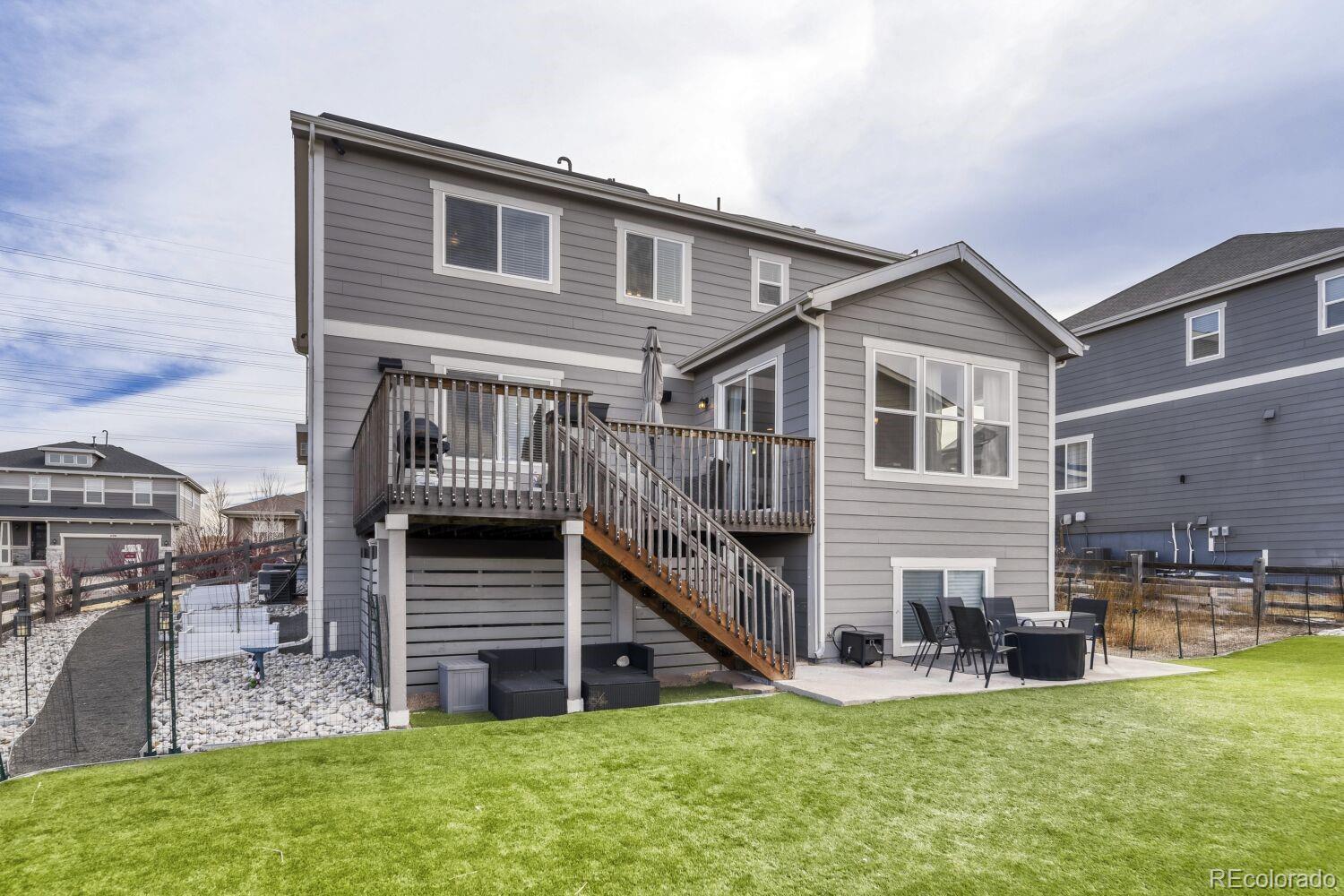 Welcome to Cherry Creek Overlook in Parker, where thoughtful design and modern comfort come together. The open-concept main floor is designed for both everyday living and effortless entertaining, highlighted by 8-foot doorways, a sun-filled sunroom, a striking 9-foot center island, and a spacious butler’s pantry with butcher block shelving. Hue smart lighting enhances the home with customizable ambiance throughout. Upstairs, a versatile loft accompanies four generously sized bedrooms and three full bathrooms, including a luxurious primary suite featuring a spa tub, glass-enclosed shower, private toilet room with built-in bidet, dual vanities, and a large walk-in closet. Energy efficiency and innovation set this home apart with owned solar panels, three Powerwall banks for backup power, and an EV charger programmed to prioritize solar energy—providing resilience during outages while helping reduce utility costs. A Lorex security system with in-home monitor and mobile access adds peace of mind. Outdoor living is equally impressive with a large elevated wood deck complete with built-in speakers, overlooking a beautifully landscaped, low-maintenance backyard featuring turf, grey river rock, mature plantings, a garden area, lower cement patio, and a versatile dog run or storage space beneath the deck. Ideally located just minutes from shopping and dining, with easy access to downtown Parker and direct connection to the Cherry Creek Trail, this home also offers the rare perk of enjoying Parker’s 4th of July fireworks from the comfort of your own property. Experience elevated living in one of Parker’s most desirable communities.