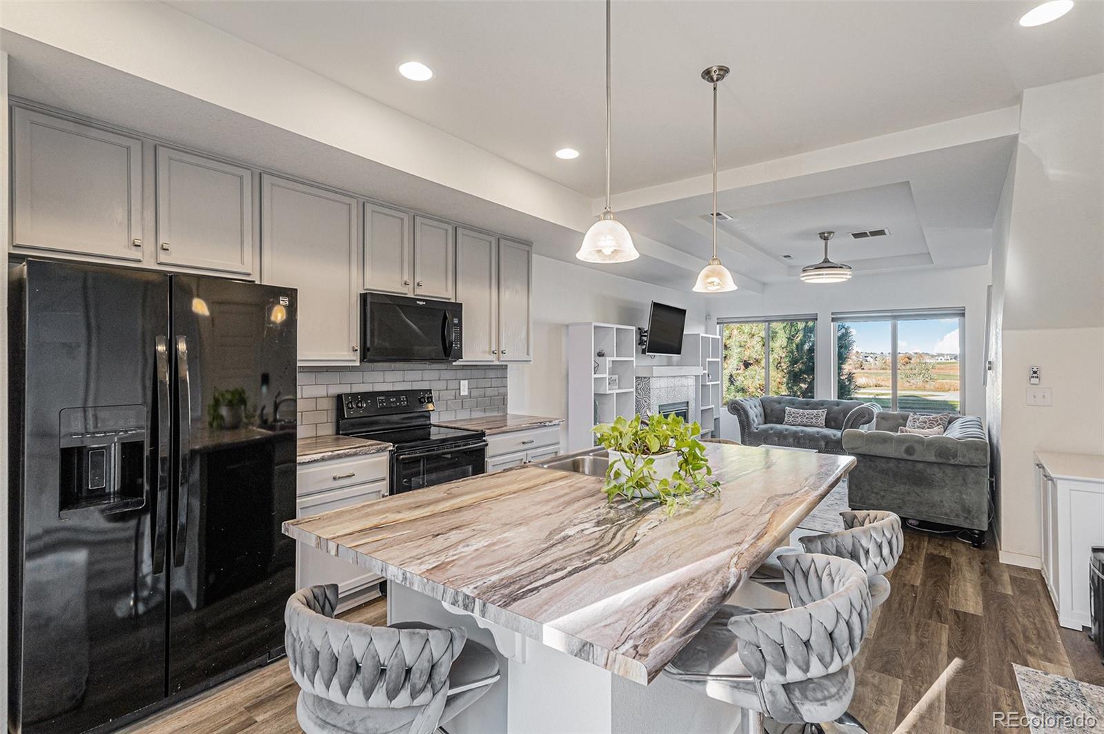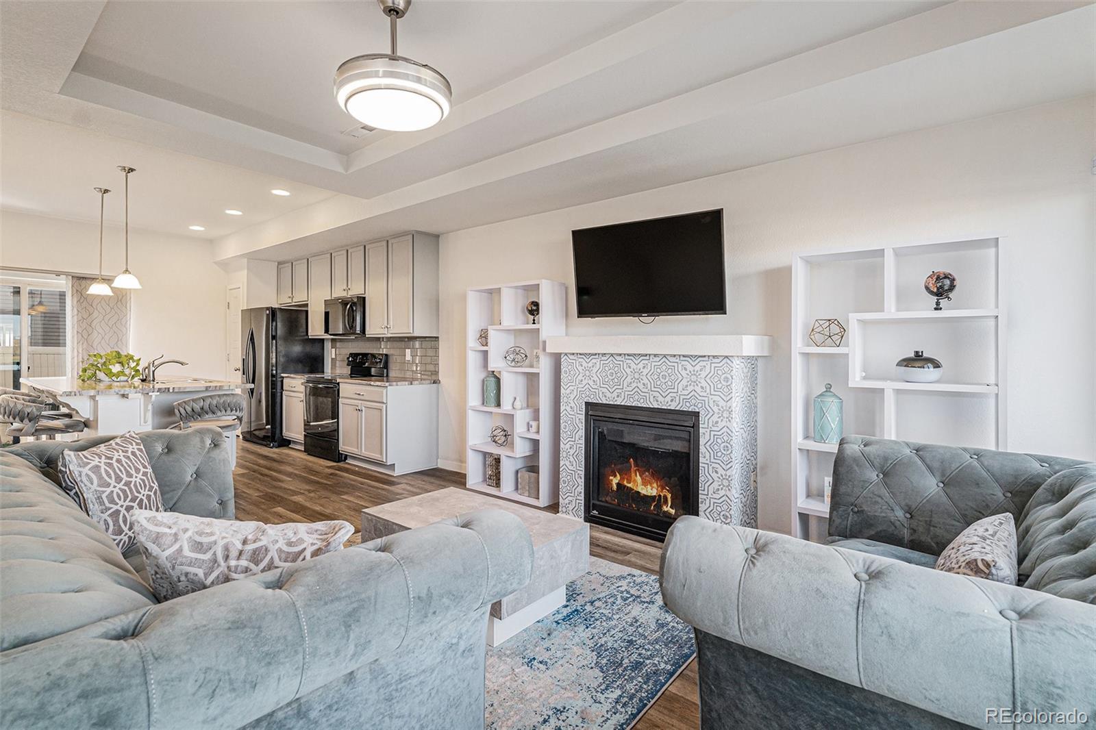 Enjoy golf course living at its finest in this well-loved, one-owner home just steps from the clubhouse and its fantastic restaurant. Built in 2016, this tri-level offers low-maintenance living and great curb appeal with a two-car attached garage, beautifully maintained front yard, and snow removal included. Recent upgrades include a brand-new roof, siding, and rain gutters, giving you peace of mind and years of worry-free ownership. This home also has leased solar for only $54/month. You’ll find three bedrooms and three baths, a cozy fireplace, and a spacious third-floor flex room with sweeping views—perfect for an office, guest space, or entertainment area. The primary suite features a private bath and walk-in closet, with two additional bedrooms nearby for convenience. Located near Town Center Park, shops, dining, and entertainment, this home also offers easy access to I-70 and E-470 for a quick commute anywhere in the metro area. Golf course views, comfort, and convenience—all in one perfect package.