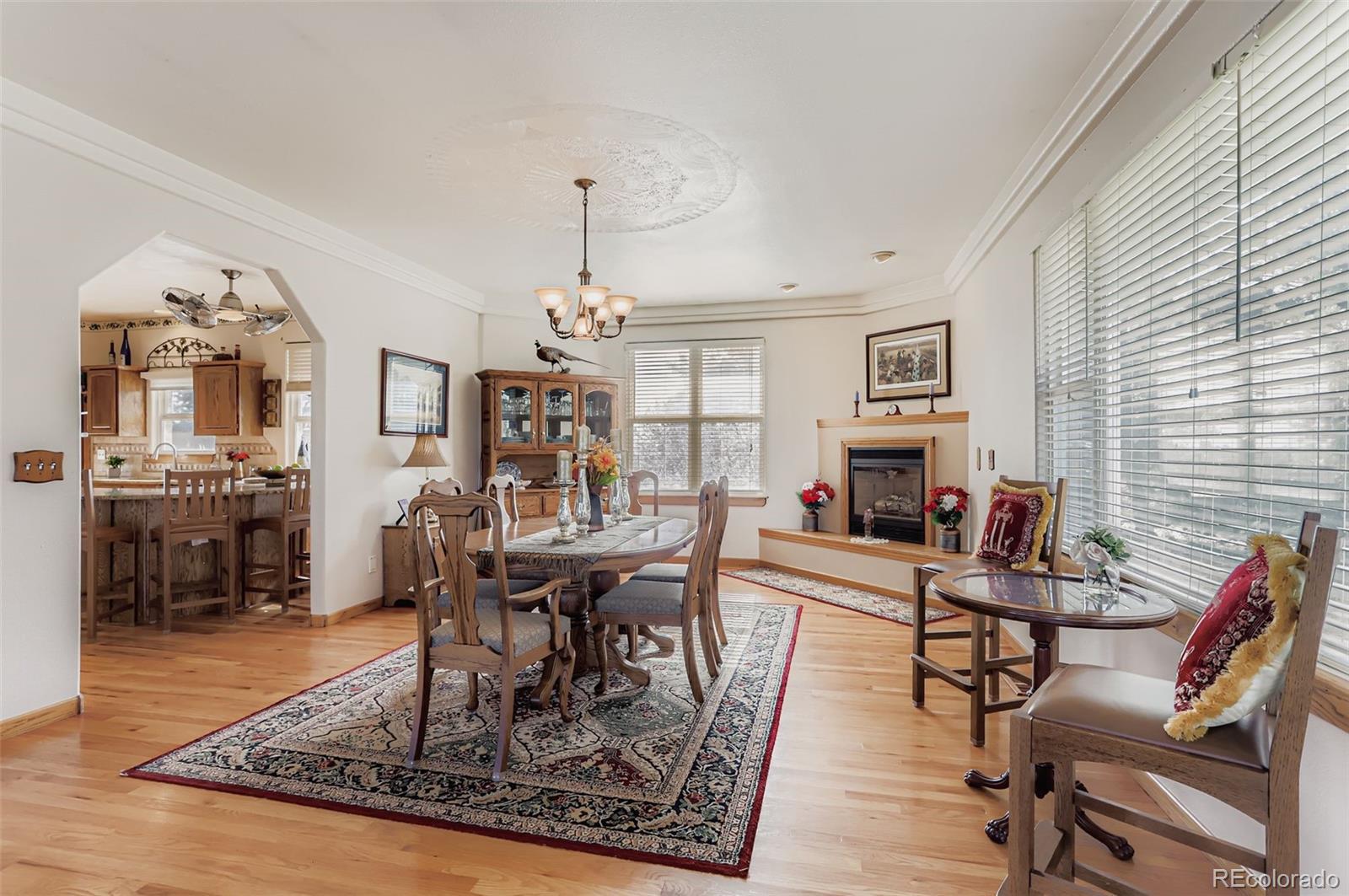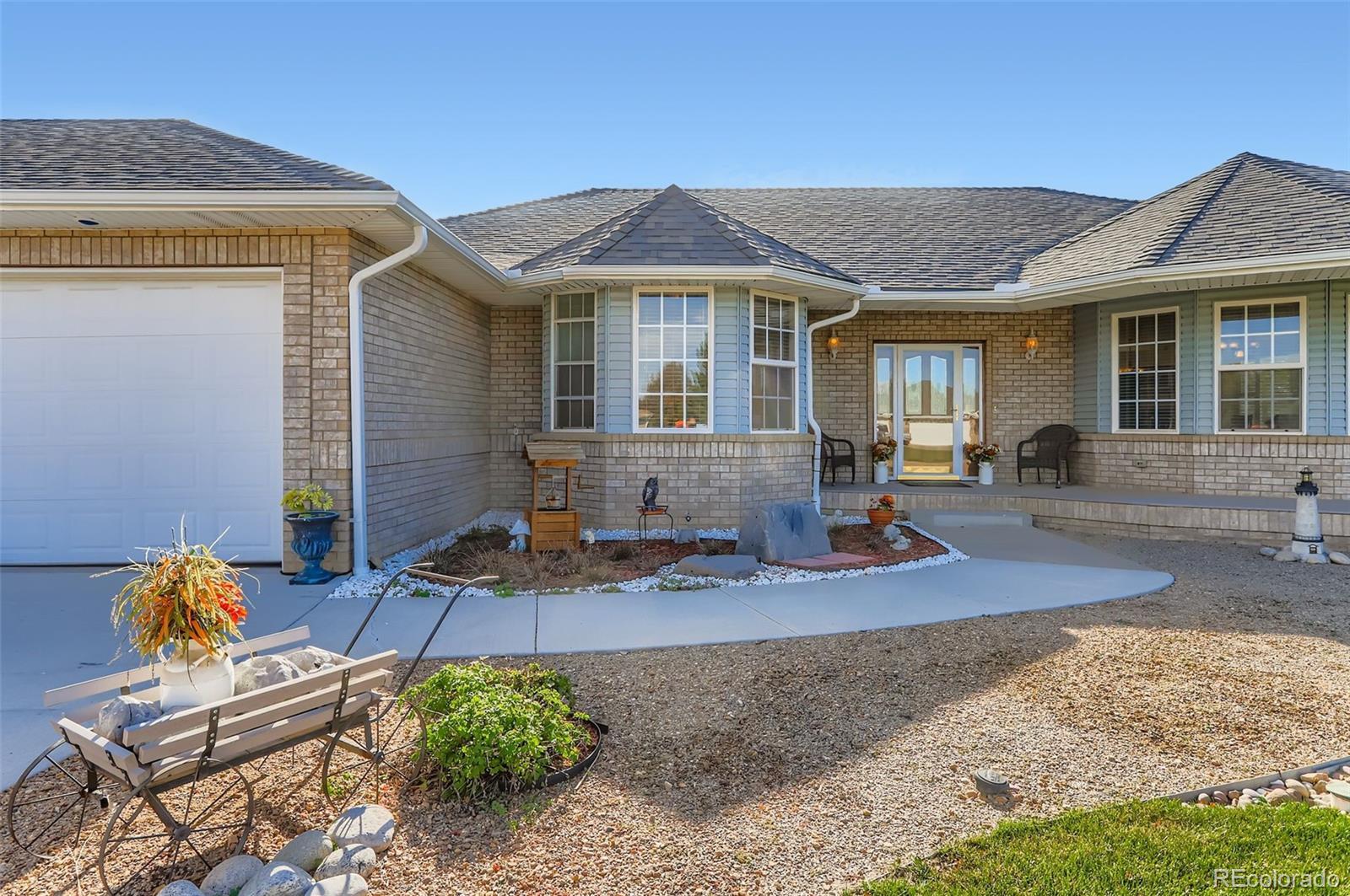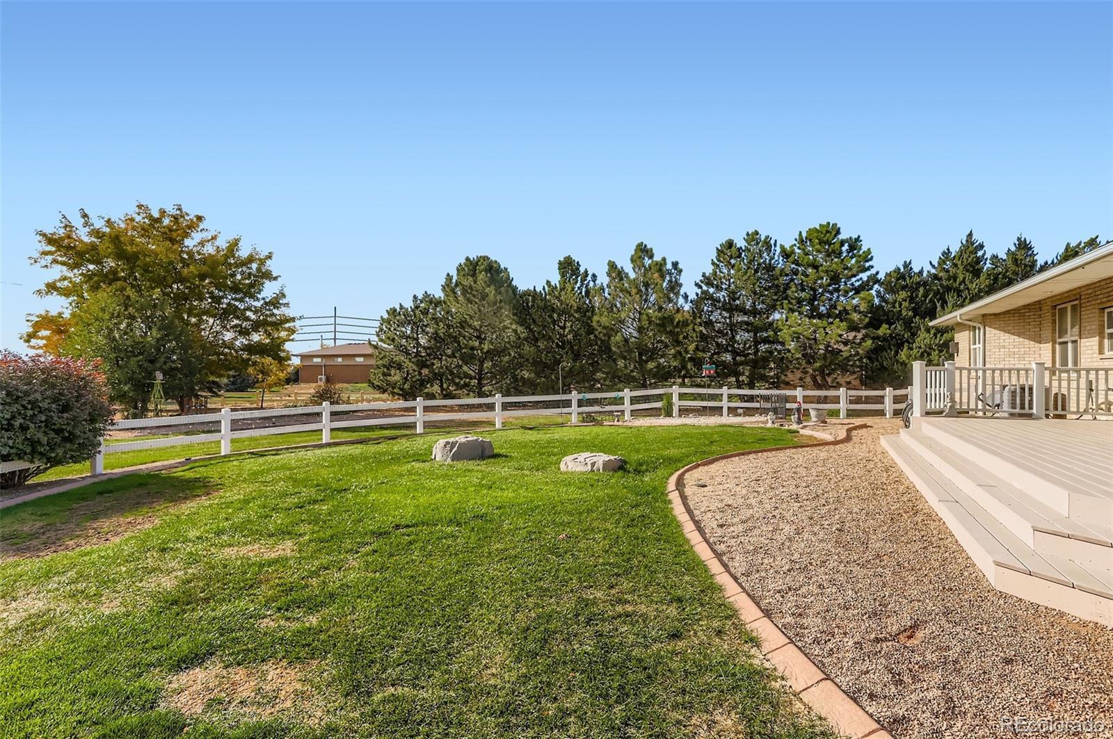 This rare and stunning ranch-style residence is set on a private acreage lot in highly desirable Grandview Estates.The meticulously curated exterior creates a warm and inviting first impression,drawing you in to explore.Designed for comfort and entertaining,the home offers an open-concept floorplan filled with natural light streaming through expansive windows,complemented by gleaming hardwood floors on the main level.The spacious great room welcomes you with a cozy fireplace and charming rounded sitting area—an ideal setting for memorable gatherings with family and friends.The kitchen is truly a chef’s dream,featuring stainless steel appliances,abundant cabinetry,a walk-in pantry,granite countertops and a generous island with a welcoming breakfast bar—perfect for casual meals or entertaining.The primary bedroom serves as a peaceful retreat,complete with a luxurious spa-like bathroom and an expansive walk-in closet.An additional bedroom,currently used as a home office, showcases rich cherrywood floors and a large bay window.A full hall bathroom features beautiful tile work and granite countertops. Conveniently located near the bedrooms,the well-appointed laundry room includes cabinetry and a utility sink to simplify everyday living.The finished basement is filled with natural light and offers exceptional versatility,featuring a spacious recreation area with surround sound and Bose speakers-ideal for movie nights or leisure activities.Two additional large bedrooms share a beautifully designed full bathroom,providing comfortable accommodations for guests or family.Step outside to enjoy fully irrigated,private, park-like landscaping and a large deck—perfect for relaxing or entertaining while taking in Colorado’s beautiful outdoors.Residents also enjoy complimentary year-round access to the private 9-hole golf course.Additional highlights include a newer roof, HVAC system,and dual water sources—adding both value and peace of mind.Tractor negotiable.