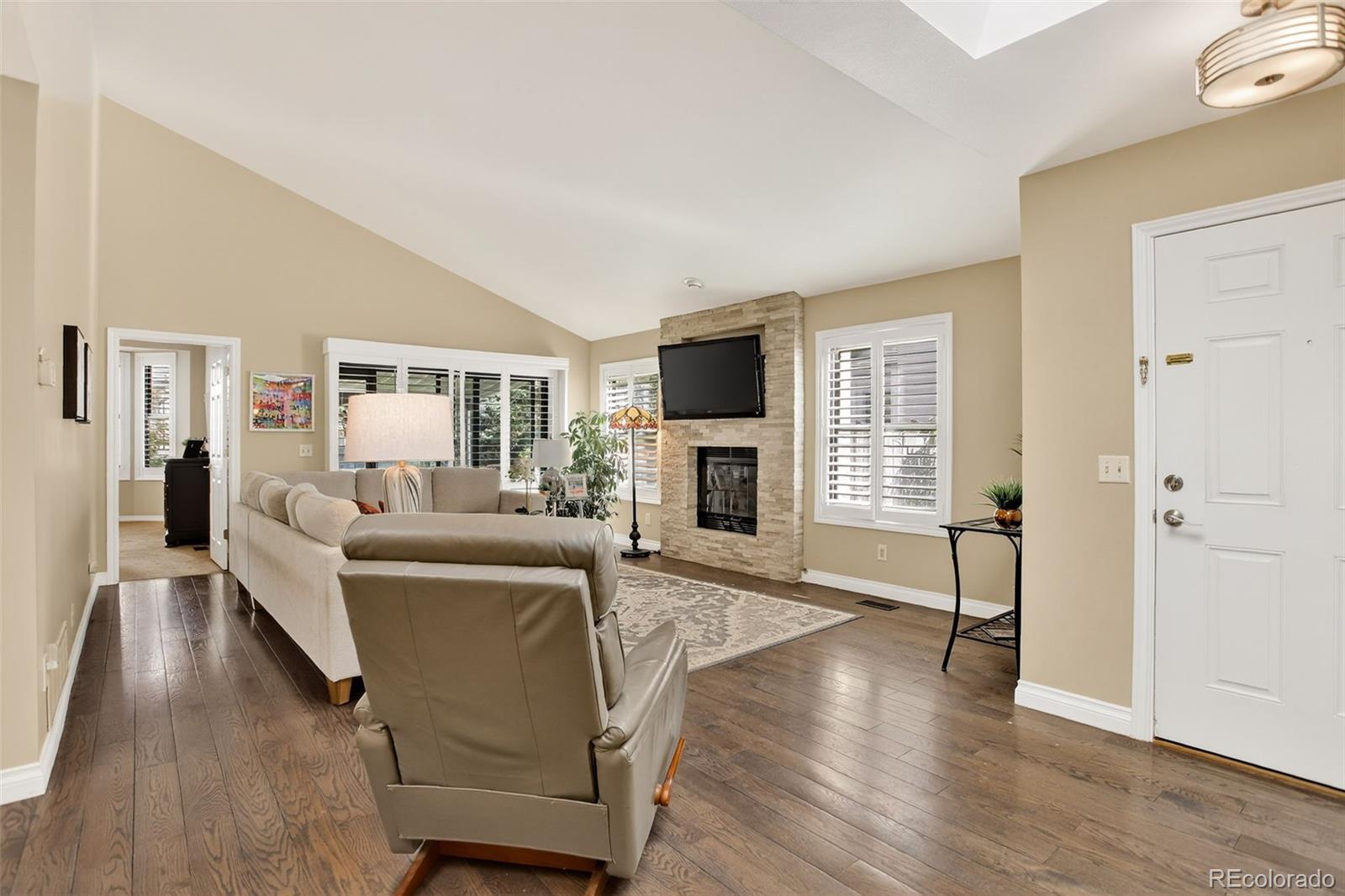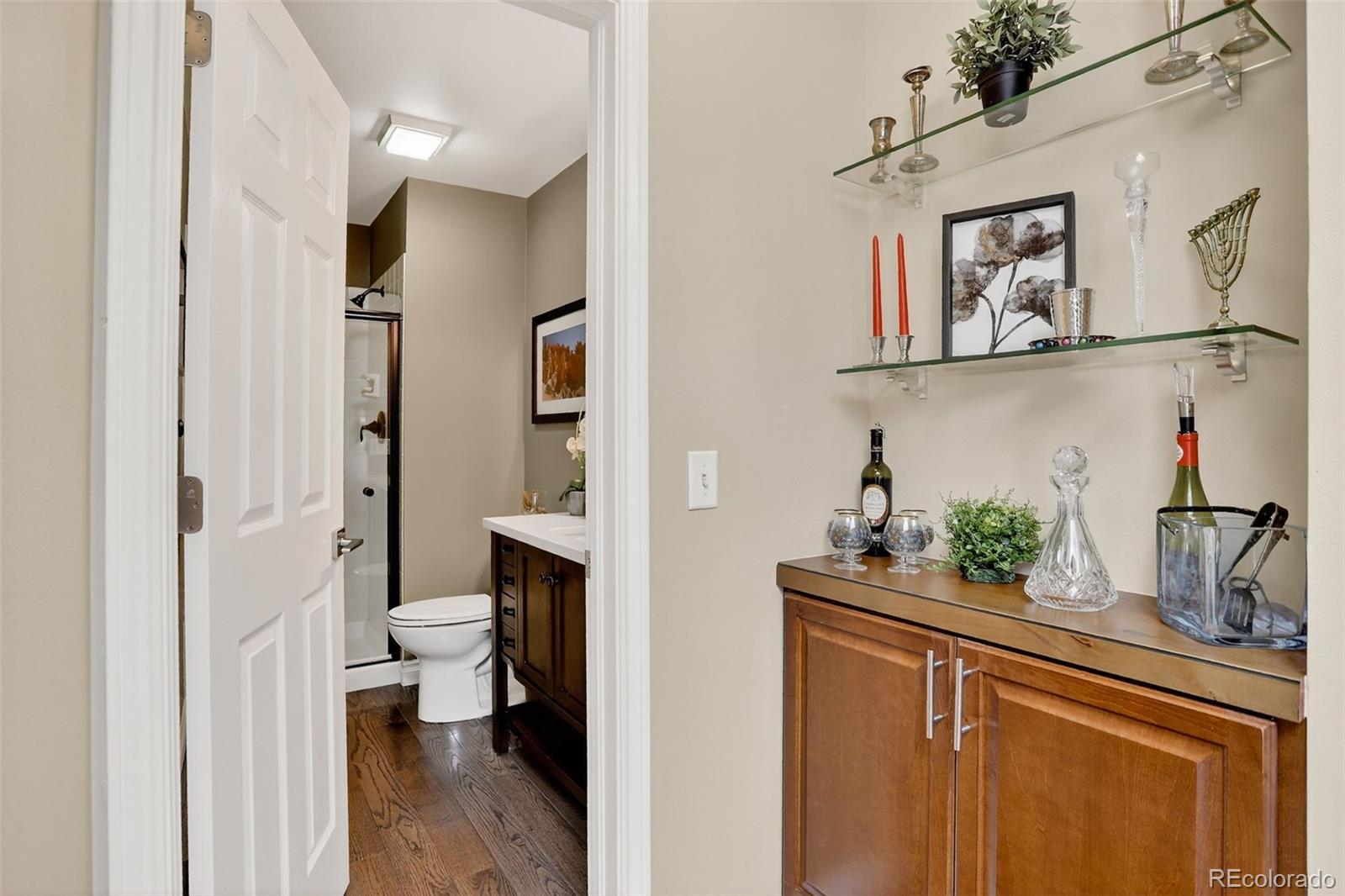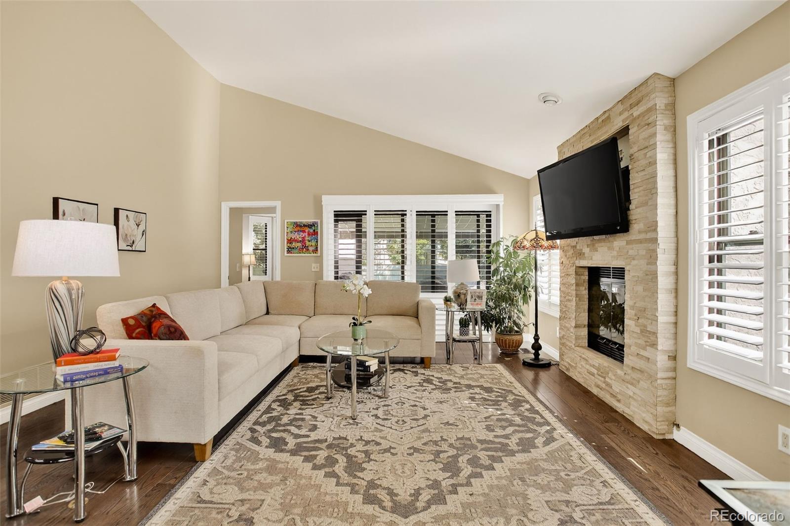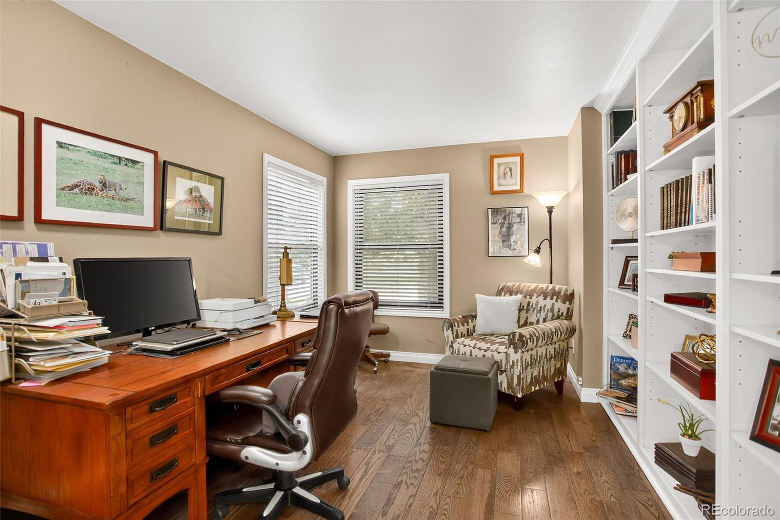 RARE FIND! Your are in luck! These main floor primary bedroom floor plans almost never become available. It is even more rare to find one as beautifully updated as this one. The warm tones of natural hardwood floors and designer colors greet you as you enter into this contemporary home. The southern exposure fills the great room with the loads of natural light that beams through the main floor's wood shutters. Working from home is enjoyable from the large main floor office featuring custom built-ins and a wonderful calming view of the front yard. Looking for a second bedroom on the main floor? The office easily converts to a bedroom complete with a closet. Wow check out the kitchen! A beautifully designed layout makes this kitchen the focal point of the home. Quartz counter tops, gas range and extra work space makes meal time a breeze. A kitchen nook, an extra large pantry and a laundry area complete the kitchen space. After a long day, retreat to your own luxury style Primary bathroom with deep soak tub and a European glass shower. Take game day to the next level in the basement rec room with a dry bar and an entertainment center. Two bedrooms and a full bath complete the space. Two car attached garage and a large unfinished storage area are an added bonus! Minutes from highway systems and the Cherry Creek Shopping makes this a 10! Showings begin Thursday Sept 25th.