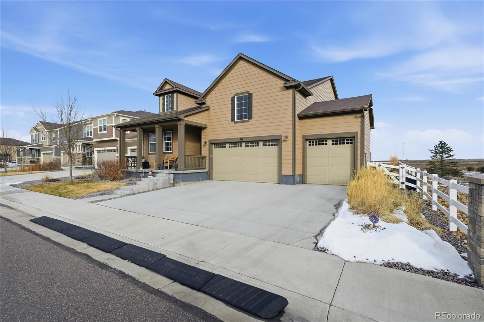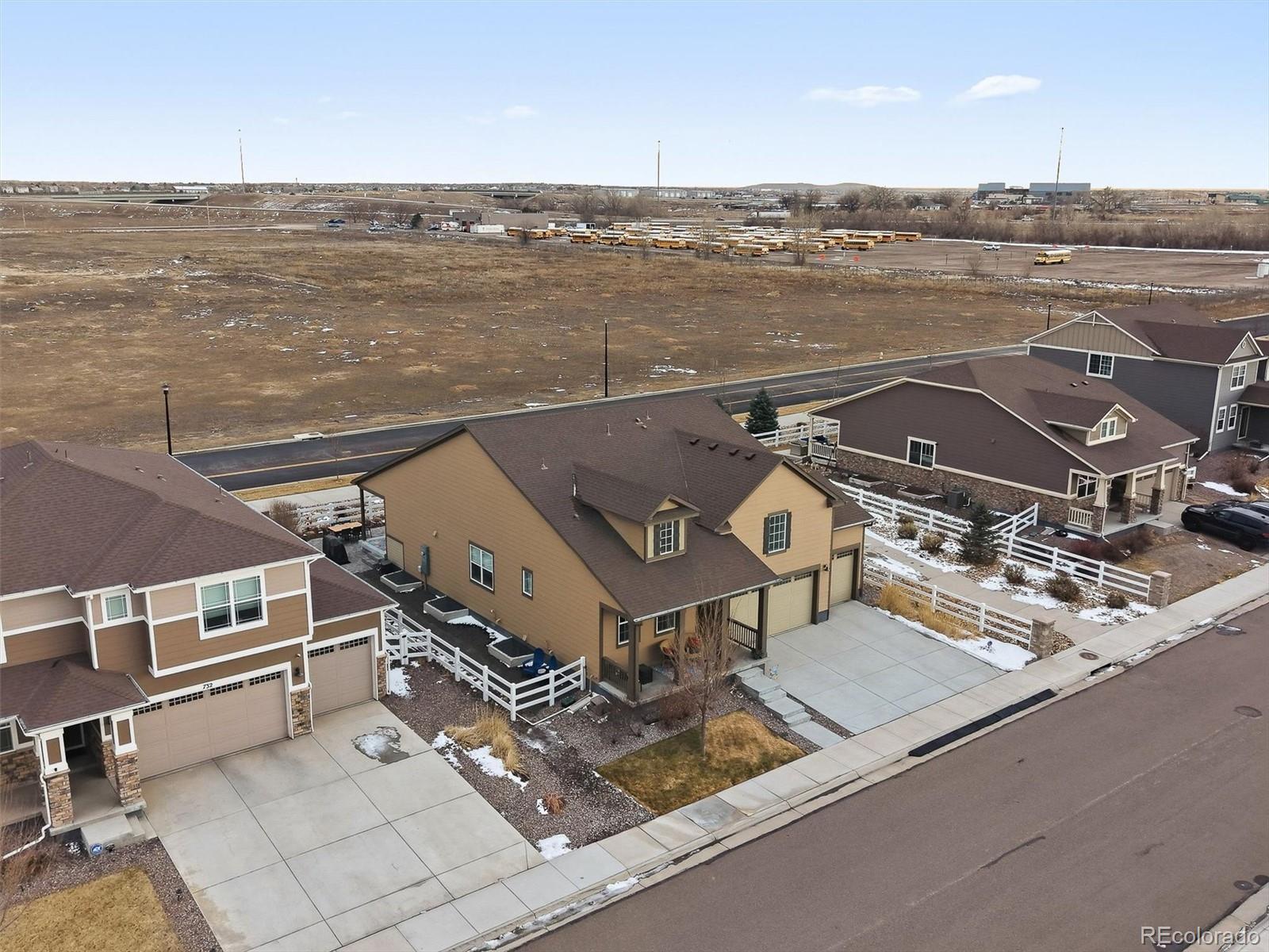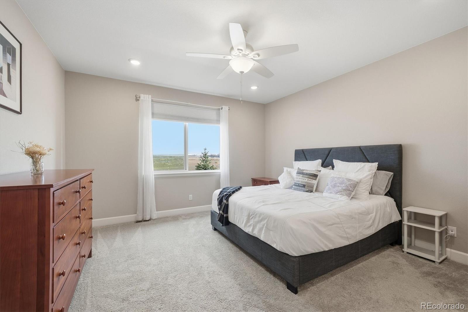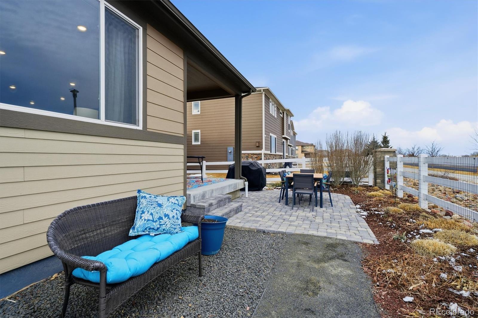 Beautiful curb appeal welcomes you to this four-year-new, move-in-ready, energy-efficient home in the desirable Brighton–Henderson area. A covered front porch leads into the foyer with luxury vinyl flooring throughout the main living areas. At the front of the home is a bedroom and a dedicated office, with a full bathroom conveniently located between them—ideal for guests, multigenerational living, or a flexible work-from-home setup. The heart of the home features a spacious kitchen with quartz countertops, gas stove, stainless steel appliances, and a large pantry. The open dining area flows seamlessly into the living room, filled with natural light from sunny windows, and offers access to the covered back patio. The fully fenced, low-maintenance xeriscaped backyard includes raised garden boxes and a firepit area, perfect for relaxing or entertaining. The primary suite is privately located at the back of the home and includes a spacious ensuite bathroom with double sinks, large walk-in shower, linen storage, and an oversized walk-in closet. Main-floor laundry is conveniently located just off the garage entry, and the oversized 3-car garage offers plenty of space for storage and projects. The mostly finished basement features a large bedroom with an oversized walk-in closet, a full bathroom, a pub-style bar area, and a tucked-away bonus room ideal for a fitness space, theater, or playroom. An unfinished area provides additional storage and mechanical space. This home is just minutes from I-76, Highway 85, and E-470, just 20 minutes to DIA or downtown Denver, and 10 minutes to light rail. Enjoy nearby shopping, dining, and outdoor recreation at Barr Lake State Park, Riverdale Recreation Area, and Rocky Mountain Arsenal. Schools, parks, tennis courts, and golf courses are all close by. Enjoy quiet country living with easy city access - morning sunrises on the back porch and evening chats with neighbors from the front porch.