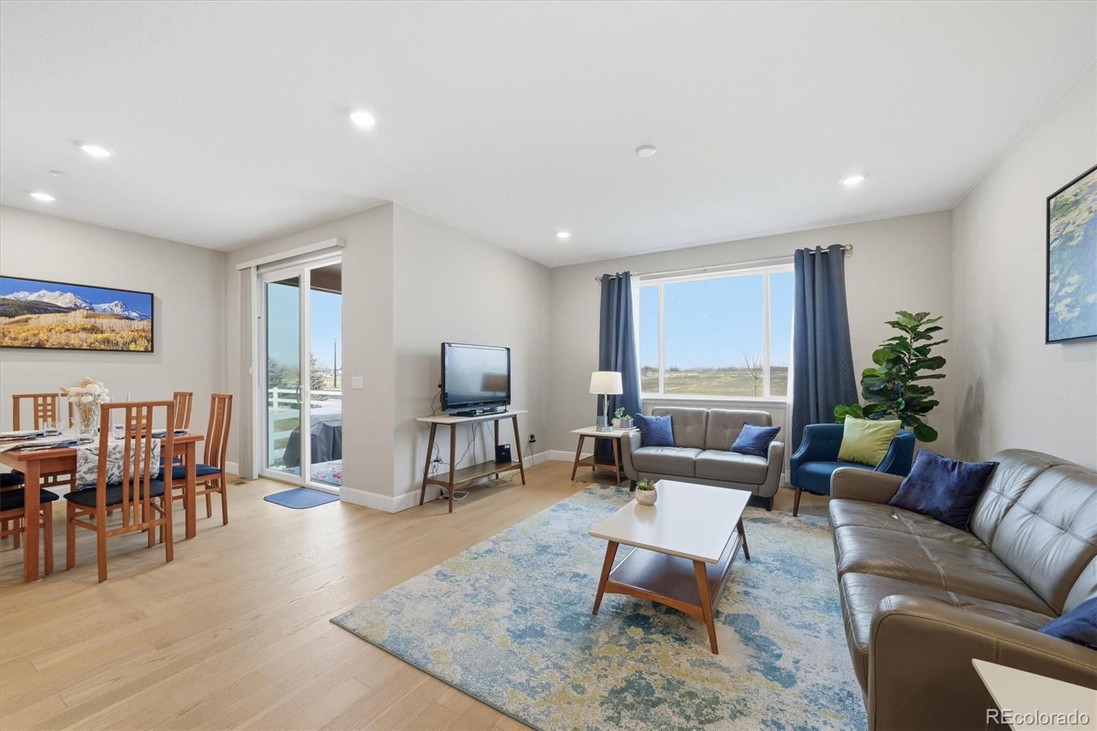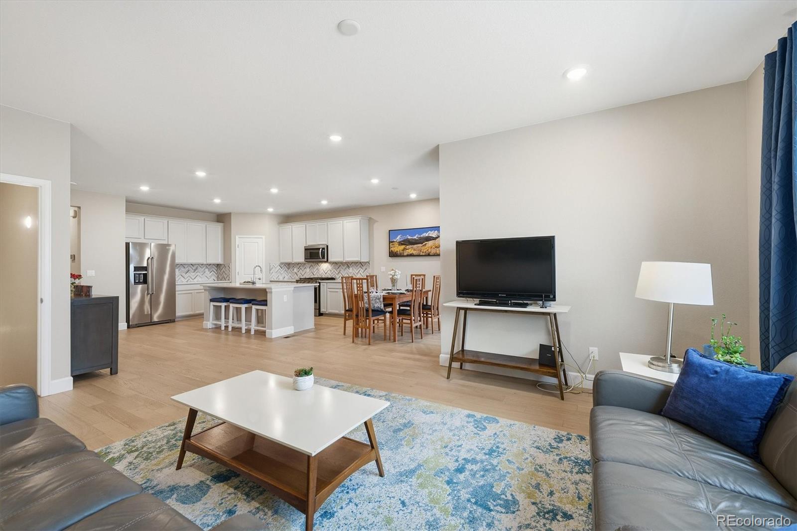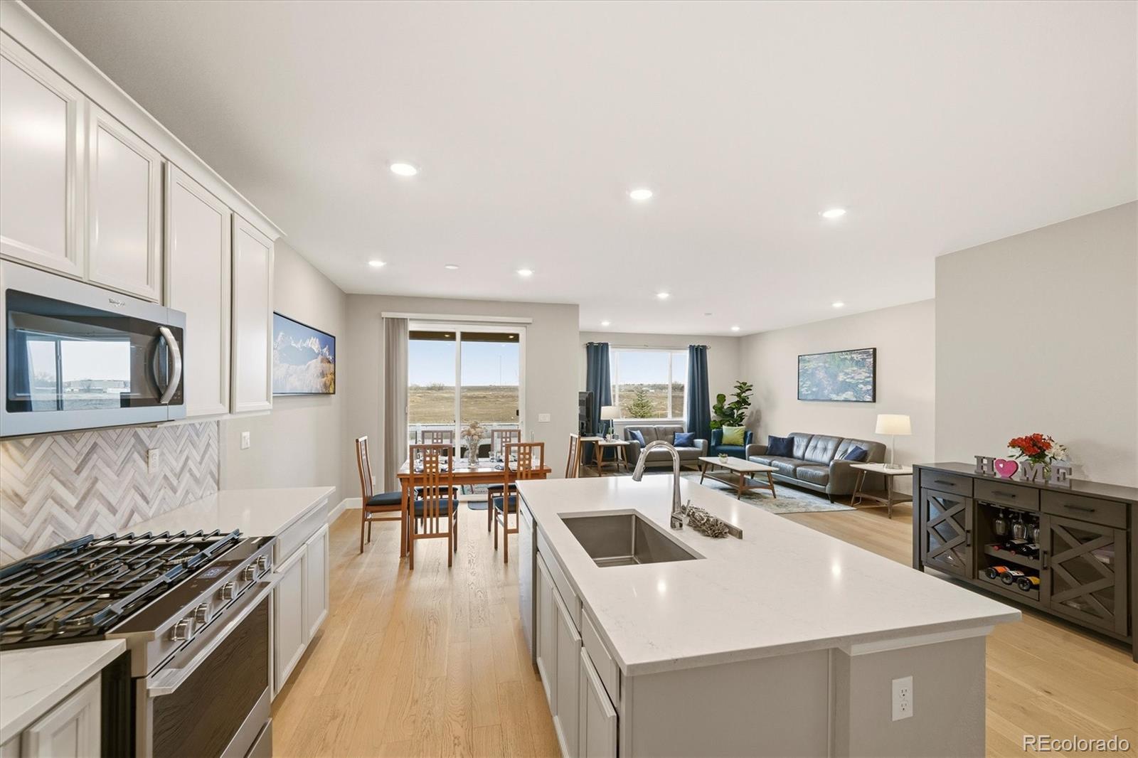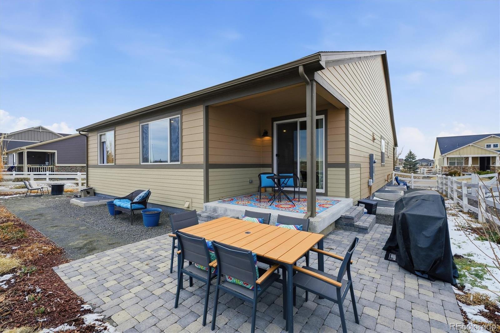 Beautiful curb appeal welcomes you to this four-year-new, move-in-ready, energy-efficient home in the desirable Brighton–Henderson area. A covered front porch leads into the foyer with luxury vinyl flooring throughout the main living areas. At the front of the home is a bedroom and a dedicated office, with a full bathroom conveniently located between them—ideal for guests, multigenerational living, or a flexible work-from-home setup. The heart of the home features a spacious kitchen with quartz countertops, gas stove, stainless steel appliances, and a large pantry. The open dining area flows seamlessly into the living room, filled with natural light from sunny windows, and offers access to the covered back patio. The fully fenced, low-maintenance xeriscaped backyard includes raised garden boxes and a firepit area, perfect for relaxing or entertaining. The primary suite is privately located at the back of the home and includes a spacious ensuite bathroom with double sinks, large walk-in shower, linen storage, and an oversized walk-in closet. Main-floor laundry is conveniently located just off the garage entry, and the oversized 3-car garage offers plenty of space for storage and projects. The mostly finished basement features a large bedroom with an oversized walk-in closet, a full bathroom, a pub-style bar area, and a tucked-away bonus room ideal for a fitness space, theater, or playroom. An unfinished area provides additional storage and mechanical space. This home is just minutes from I-76, Highway 85, and E-470, just 20 minutes to DIA or downtown Denver, and 10 minutes to light rail. Enjoy nearby shopping, dining, and outdoor recreation at Barr Lake State Park, Riverdale Recreation Area, and Rocky Mountain Arsenal. Schools, parks, tennis courts, and golf courses are all close by. Enjoy quiet country living with easy city access - morning sunrises on the back porch and evening chats with neighbors from the front porch.