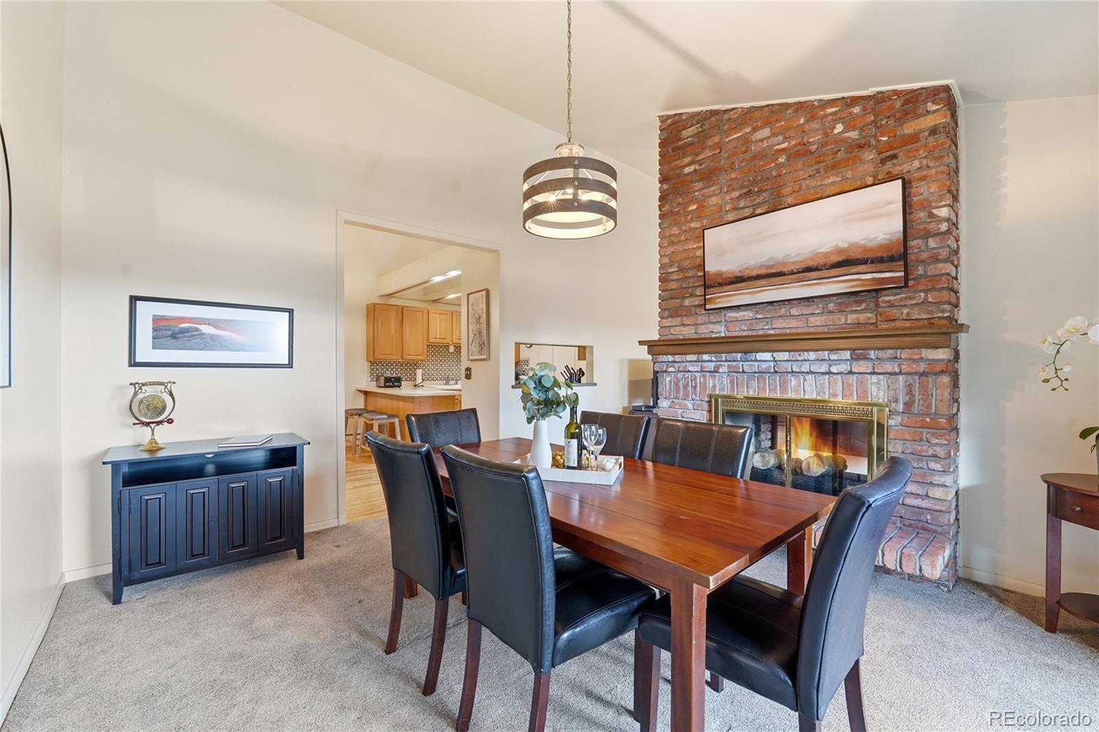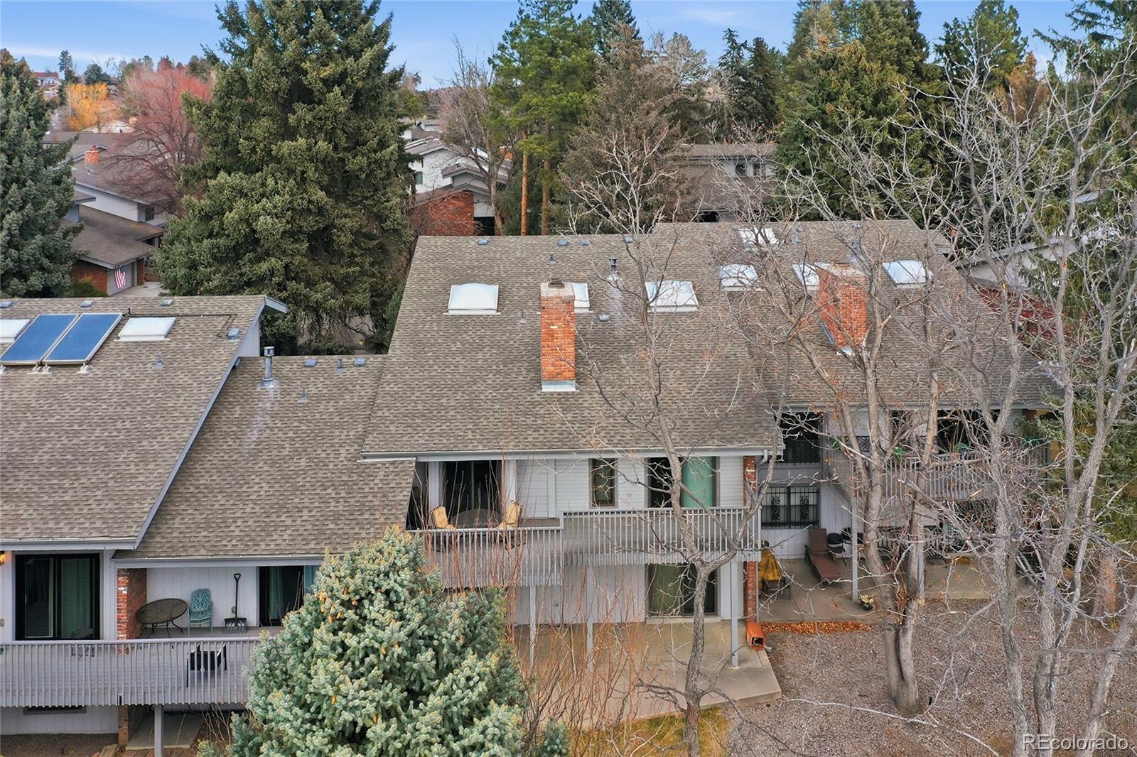 Low-maintenance townhome with mountain views and room to host in charming Forest Glen! Tucked among tall pines just steps from Peak View Park and the Bear Creek Greenbelt, this 3-bed, 3-bath townhome is designed for lock-and-leave living. Enter into a brick-accented foyer, leading upstairs to the main level. The living room is filled with natural light from vaulted ceilings and bright sliding glass doors, anchored by a two-sided gas fireplace wrapped in classic brick that connects to the formal dining room. A second set of sliding glass doors open to the expansive upper deck, where mountain views are the backdrop for sunset dinners, weekend brunches, and easy indoor–outdoor entertaining. The kitchen boasts skylights and warm wood cabinetry alongside a striking tile backsplash, generous peninsula, and an adjacent dining area for casual meals. On the upper level, retreat to a tranquil primary suite with soaring ceilings, abundant windows, a full ensuite bath with soaking tub, and a spacious walk-in closet, while a second bedroom and nearby ¾ bath with oversized walk-in shower offer space for loved ones. Downstairs, the walk-out basement expands living space, boasting a family room with direct access to the covered patio, a second gas fireplace, and wet bar, perfect for movie nights or hosting game day. A non-conforming third bedroom with built-ins, ½ bath, and finished laundry complete the level. In the backyard, the upper deck is made for hosting with a view, while the covered lower patio and yard area create a place to relax or play surrounded by mature trees and lush lawn. Centrally located near Lakewood amenities and just 15 minutes from hiking at Red Rocks or entertainment in Downtown Denver, endless recreation awaits right outside your front door.