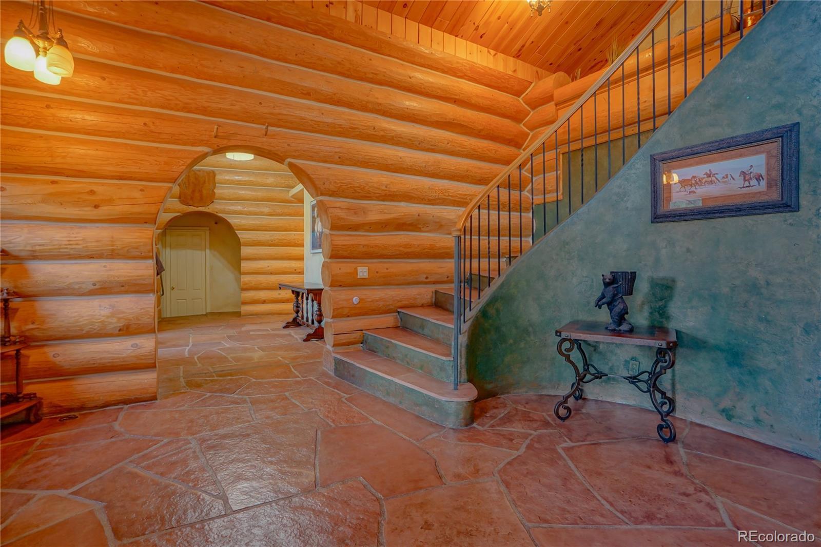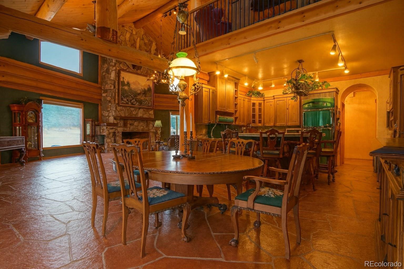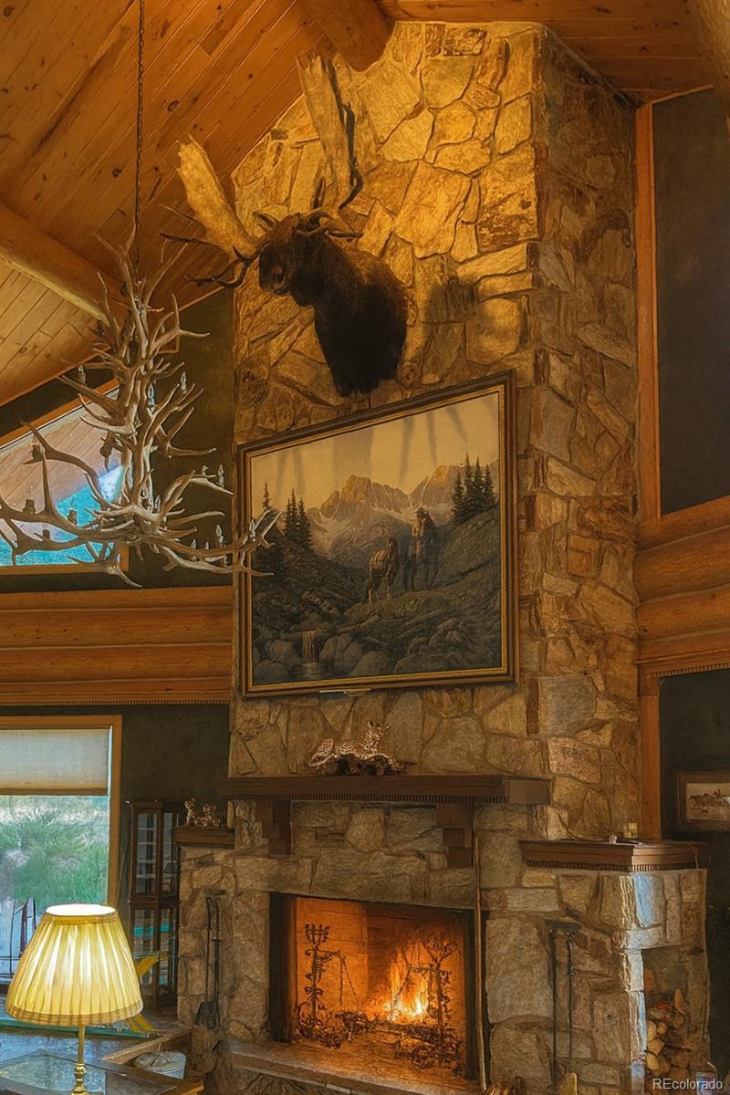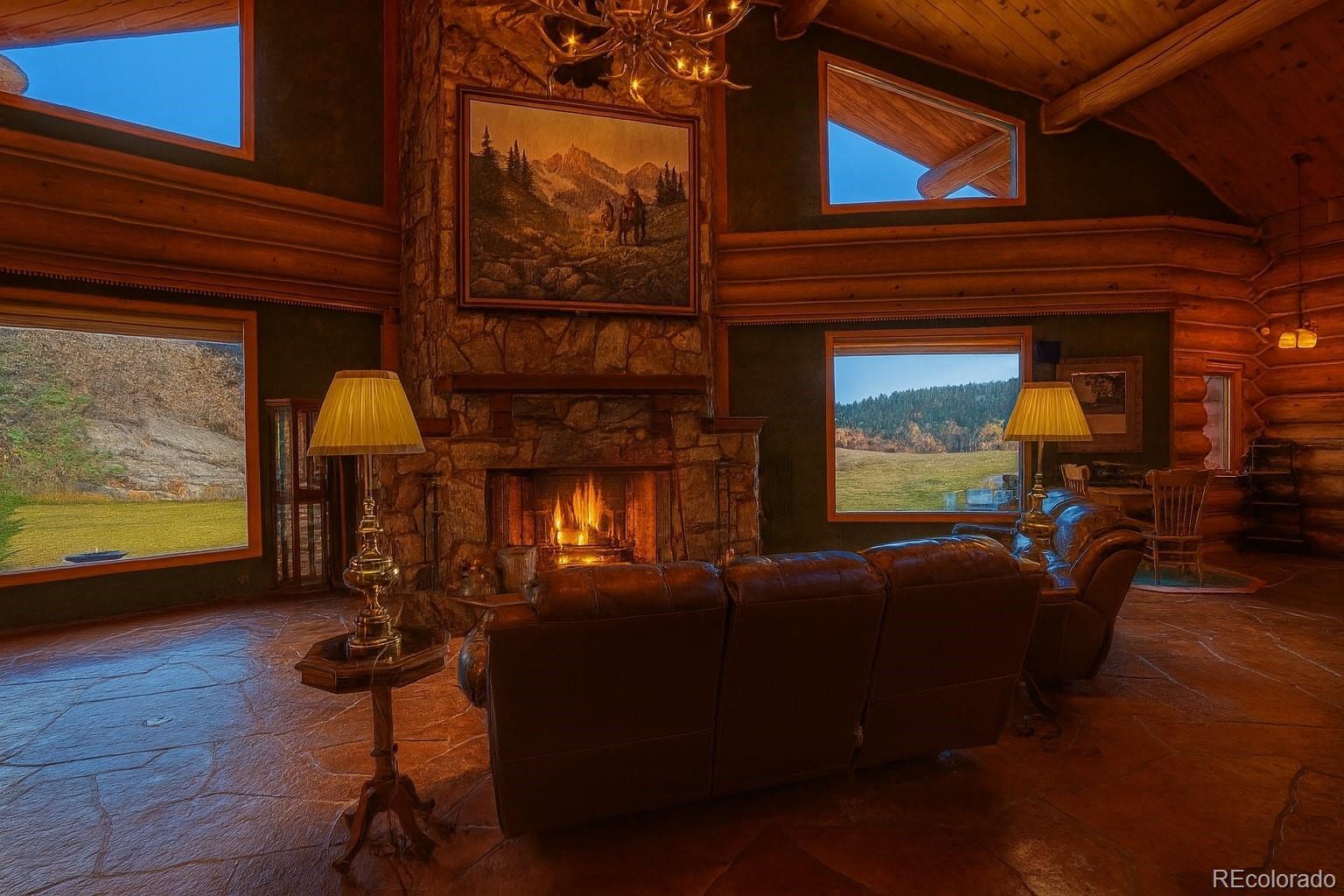 Discover a rare investment opportunity at this 35+ acre ranch, a custom trophy log, stucco, & rock home spanning 5,548 sqft with a paved driveway. Nestled along the serene Cucharas River with stunning views of the Sangre de Cristo Mountains & Cuchara Mountain Park ski area, this property offers a unique blend of rustic charm, luxury, & functionality. With its expansive grounds, horse stables, & versatile spaces, this fully furnished estate is perfect for those seeking a private retreat, equestrian haven, or a venue for special events. The heart of the home is the magnificent great room featuring a massive stone wood-burning fireplace, an antler chandelier, stone floors, and T&G ceilings. The gourmet kitchen boasts custom tile & butcherblock countertops, a Heartland refrigerator & stove, & an antique breakfast bar. Throughout the home, T&G ceilings, log vigas and in-floor radiant heat create a cozy yet sophisticated ambiance, complemented by antique furnishings in select rooms and striking rock outcroppings visible on the property. The master bedroom is a sanctuary with an en-suite 5 piece bath - a walk-in shower, Jacuzzi tub, dual vanities, & elegant marble floors. Two additional bedrooms in home, including one with its own en-suite full bath, offer ample space for family or guests. Upstairs a spacious recreation room awaits, complete with an antique bar, pool table, gun safe closet, and a ¾ bath. A separate apartment above the attached 4-car garage features T&G ceilings, electric heat, a kitchen, dining area, living room, bedroom, full bath, & large walk-in storage, providing ideal accommodations for guests or staff. The property’s outdoor amenities are equally impressive, with horse stables featuring two tack rooms, a man-made wildlife pond, & dike wall marking the east boundary. A detached 1,500 sqft 4-car garage includes a large workshop, a finished trophy room, & piped water, offering endless possibilities for hobbies or business ventures.