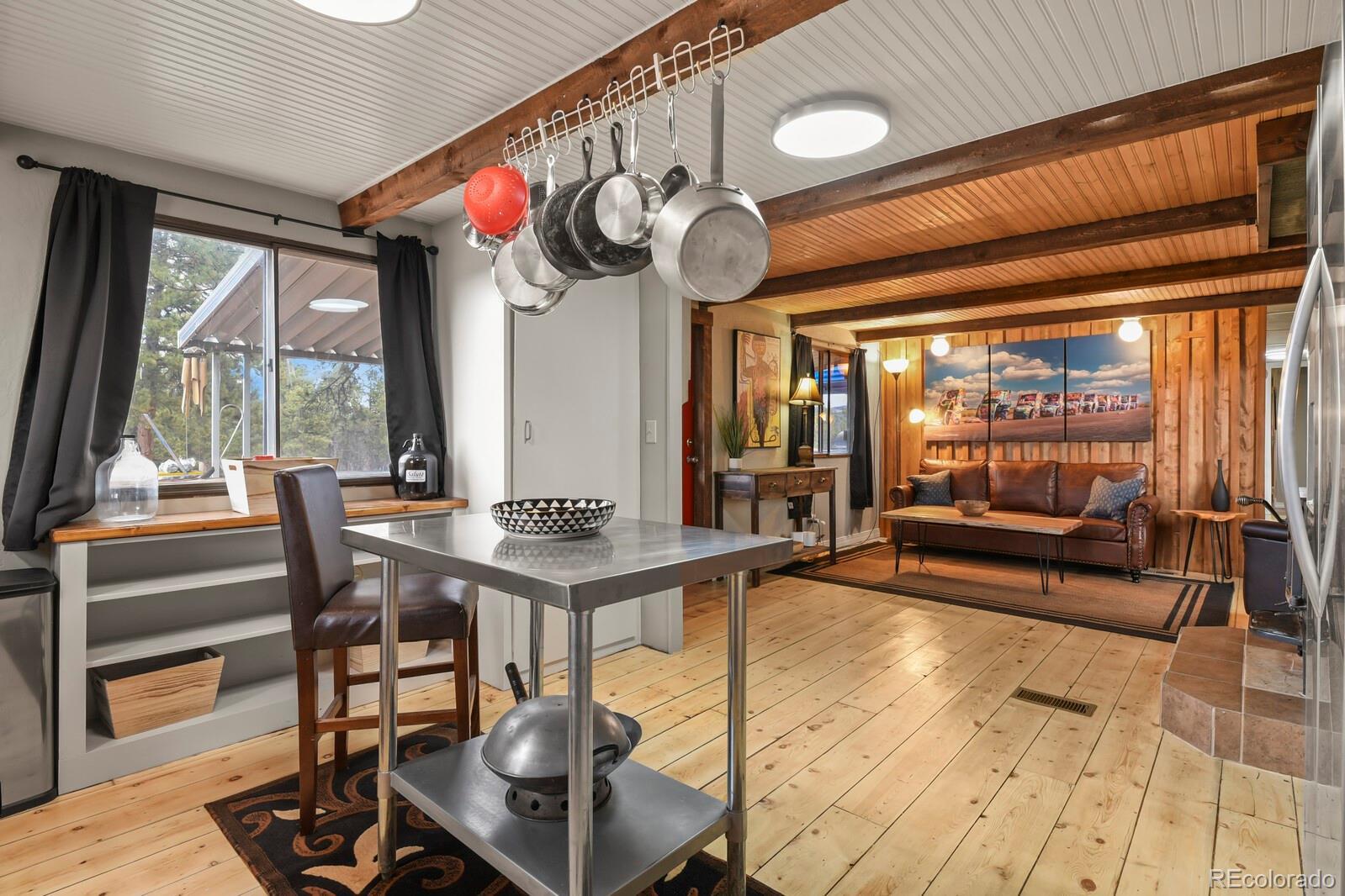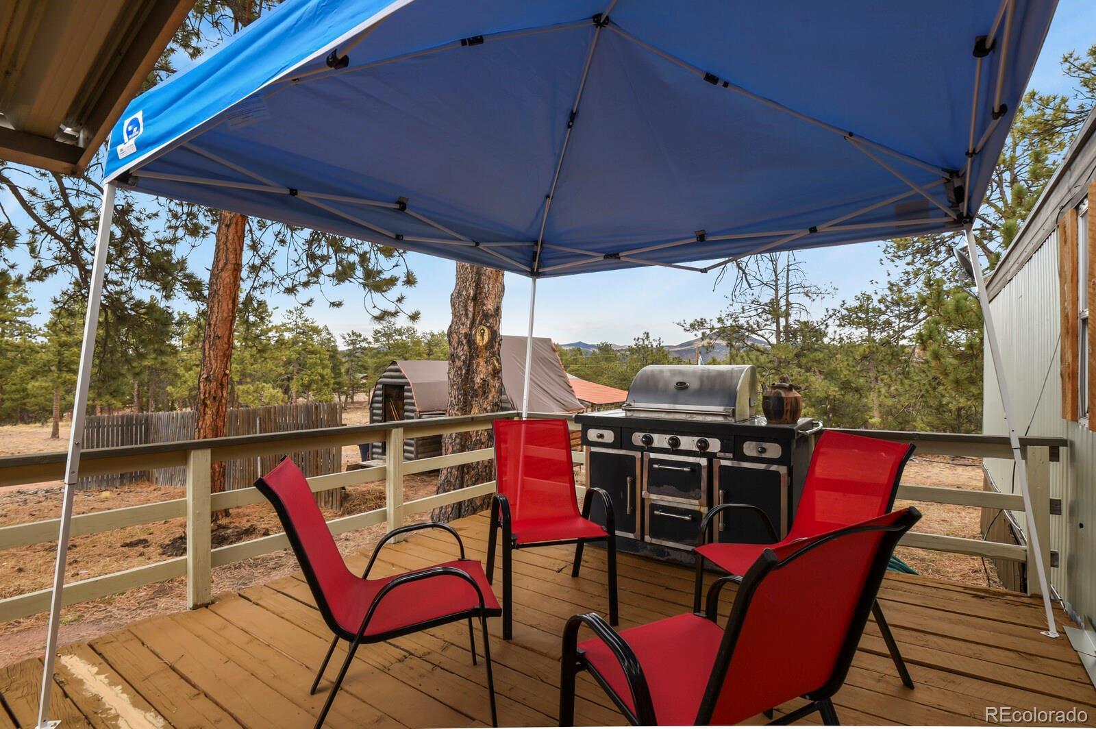 Your Colorado mountain retreat awaits! Nestled on two beautiful acres with a gentle mountain backdrop (and a Pikes Peak view!), natural rock outcroppings, and peaceful surroundings, this inviting home blends updated comfort with a true sense of simplicity and ease. Step inside to a welcoming open layout featuring a bright sunroom, ideal for morning coffee, plant-filled afternoons, or extra guest space. The home has been mostly updated and comes fully furnished—right down to housewares—so you can move right in and start enjoying mountain life. The kitchen offers stainless steel appliances, refreshed cabinets and countertops, and a kitchen island with a pot rack. The wood burning stove for chilly mountain evenings comes with two cords of wood to get you started. There are two bedrooms and one full bath, wood floors, as well as a top-notch whole-house water softener and filtration system. Outdoors, relax on the covered deck, take in the fresh mountain air, or explore your two acres of peaceful land accented by trees and rock outcroppings. You’ll love the three carports, storage sheds, and circular driveway with easy access and plenty of parking. No HOA means the freedom to create your mountain lifestyle your way—whether full-time living, a weekend getaway, or a furnished rental opportunity. Come see the view, feel the peace, and make this mountain gem your own.