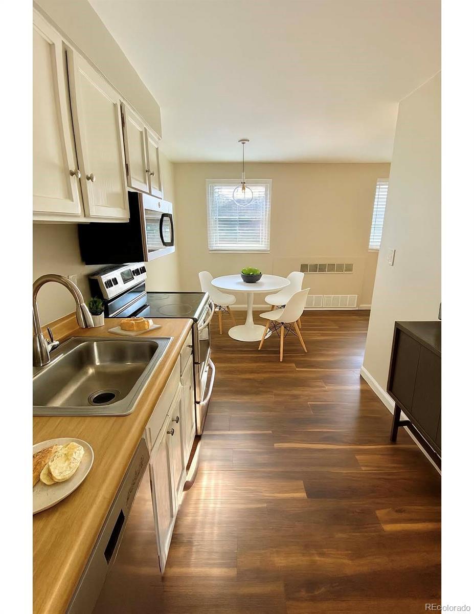 Seller to provide $5,000 towards Buyer's closing costs! Updated corner South and West facing, spacious 2 bedroom/1 bath condo ready for immediate move-in! Freshly painted! New stainless refrigerator and new oven! Vinyl plank wood floors in kitchen and living room w/ extra sound proofing barrier, carpet in bedrooms, newer stainless dishwasher and microwave and newer light fixtures. 1 reserved parking spot #22 and reserved storage unit#302. Washer/Dryer right outside apartment door as well as additional machines in lower level of building. Condo windows face South and West and the unit overlooks the pool. Additional amenities throughout the property include outdoor grills, fitness room and sauna. This is a great condo on a quiet block! Only 2 blocks to Cheeseman Park, Botanical Gardens, 12th Street retail, and Carla Madison Rec Center. HOA has already made many improvements including completion of new roof in 2025!