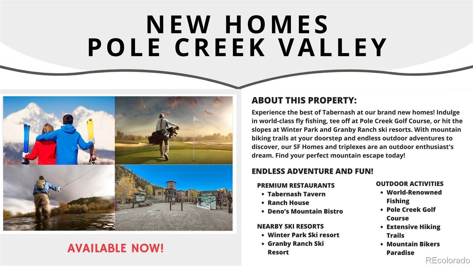 **$15K Seller Concession for Interest Rate Buydown or Closing Costs! Vistas at Pole Creek offers premier mountain modern homes located in the vibrant community of Tabernash, CO. These homes offer a mix of two and three-story designs, including ranch-style units, all perfectly positioned to capture stunning panoramic mountain views. Residents enjoy seamless access to year-round activities with Winter Park and Granby Ranch ski resorts nearby, as well as Pole Creek Golf Course. Each home is designed with a focus on modern luxury and comfort, featuring spacious interiors, finished basements, and high-end finishes. Expansive outdoor living spaces provide ideal settings for relaxation or hosting gatherings.