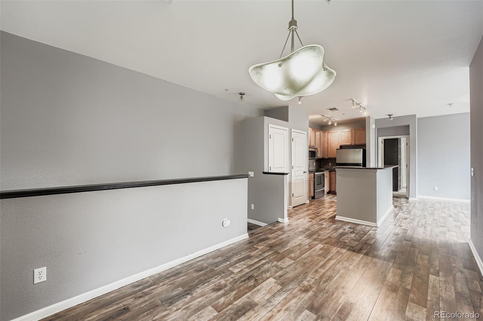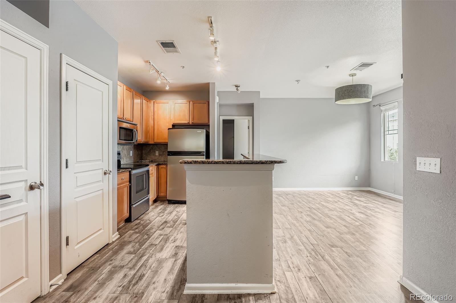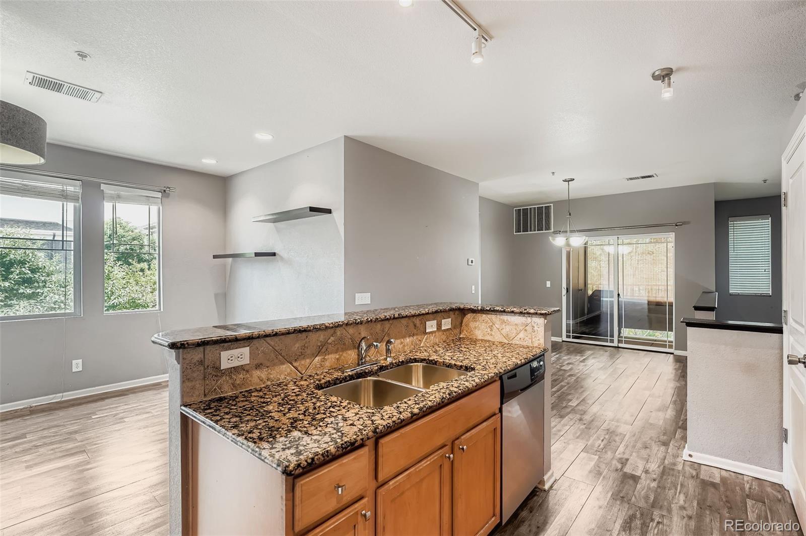 Gorgeous Condominium with Modern Elegance and Natural Light Welcome to this beautifully designed and charming condominium, offering high ceilings and an abundance of natural light in every room. From the moment you step inside, you'll feel the warmth and openness of a home built for comfort, connection, and style. The kitchen is a standout feature, boasting granite countertops, stainless steel appliances, a large center island, and an open bar seating area that flows seamlessly into the living room. It's the perfect space for entertaining, where guests can relax on the couch while the chef prepares meals in a kitchen designed to inspire. Durable laminate wood flooring runs throughout the main level, enhancing the modern aesthetic and complementing the soft, inviting tones of the walls and lighting. The floor plan is thoughtfully designed with the spacious master suite positioned on one side of the home and the beautiful guest suite on the other, offering both privacy and functionality. The master bedroom is a true retreat, featuring high ceilings, two tall windows that fill the space with natural light, and a stunning dimmable chandelier that adds an elegant touch. The ensuite bath includes a generous walk-in closet, a built-in armoire, and a luxurious oval Roman soaking tub—the perfect sanctuary to unwind and restore at the end of the day. This home also includes a full-sized Affinity stackable washer and dryer, and a private enclosed patio ideal for grilling, lounging, or enjoying sunny afternoons. The attached one-car garage provides added convenience and keeps your vehicle protected year-round. Located in a community with wonderful amenities, residents can enjoy the pool and hot tub, an on-site playground, and the nearby expanded dog park at Cheyenne Arapahoe Park. If you’re searching for a home filled with sunshine, space, and modern comfort—this one is truly special. Welcome home.