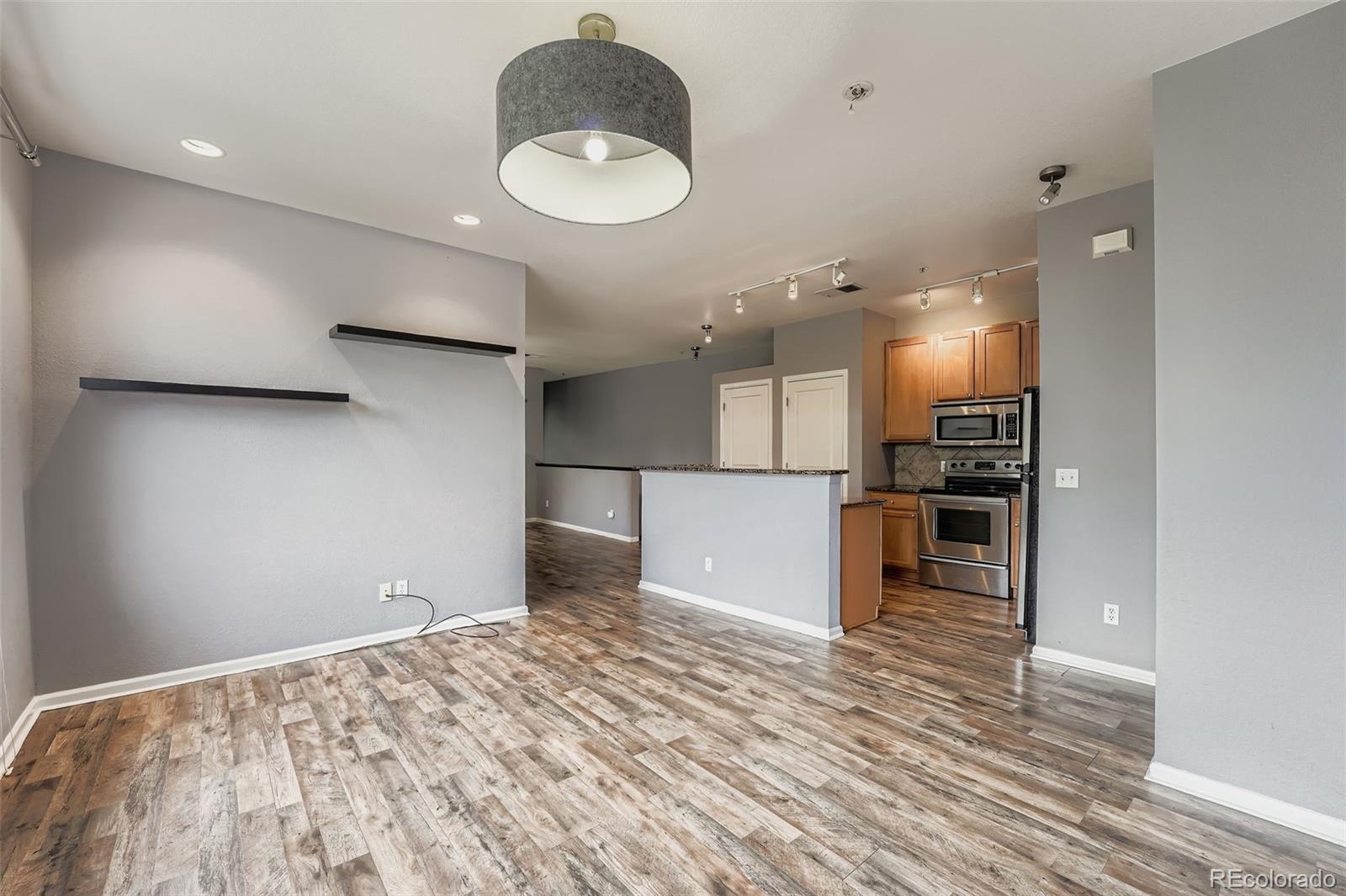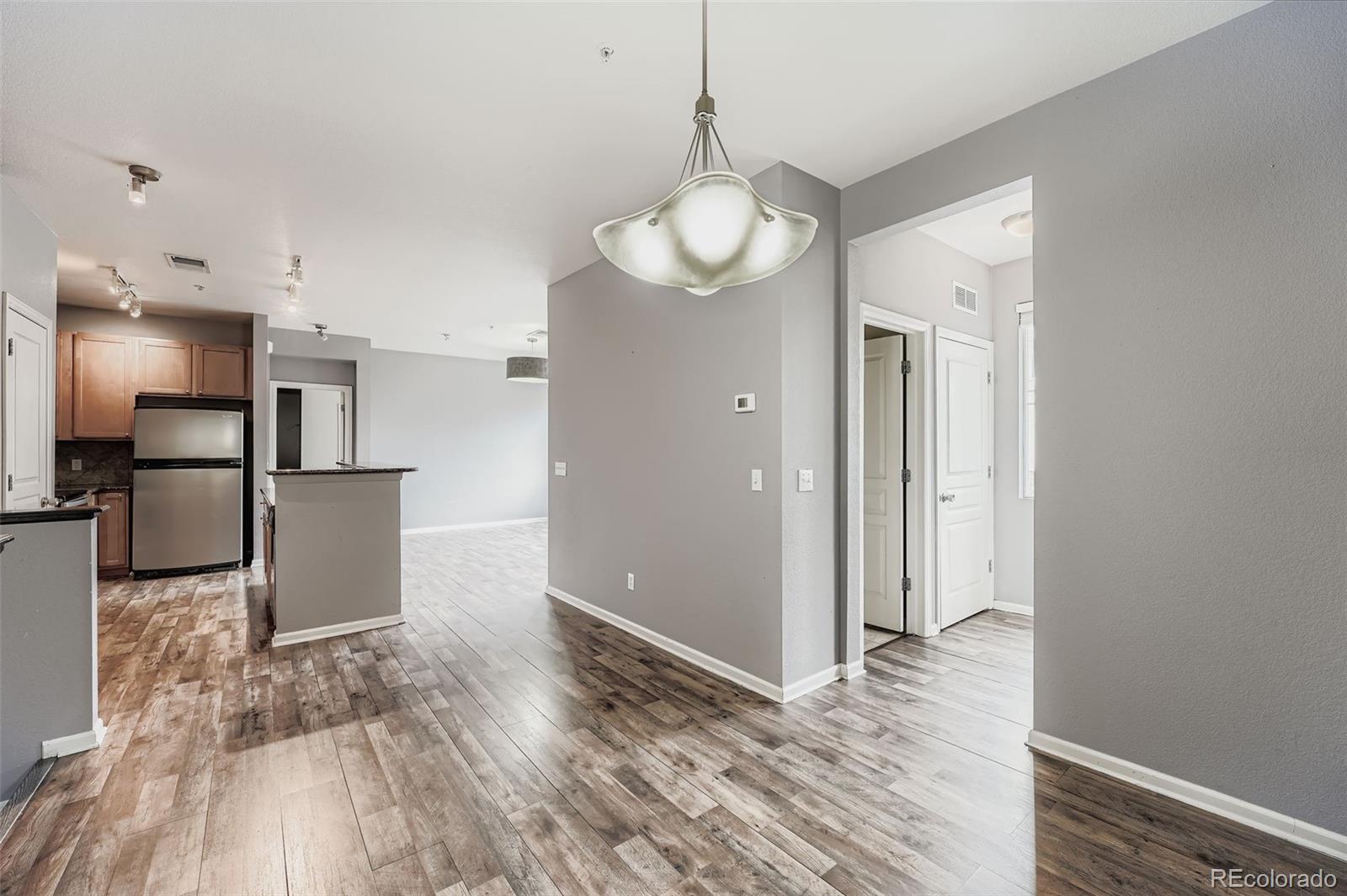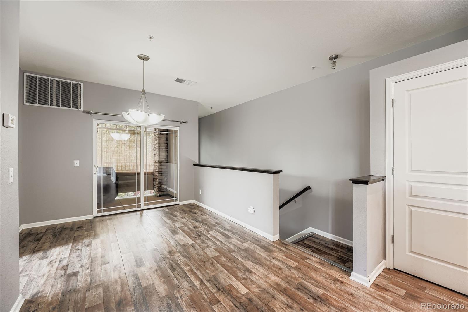 Gorgeous Condominium with Modern Elegance and Natural Light Welcome to this beautifully designed and charming condominium, offering high ceilings and an abundance of natural light in every room. From the moment you step inside, you'll feel the warmth and openness of a home built for comfort, connection, and style. The kitchen is a standout feature, boasting granite countertops, stainless steel appliances, a large center island, and an open bar seating area that flows seamlessly into the living room. It's the perfect space for entertaining, where guests can relax on the couch while the chef prepares meals in a kitchen designed to inspire. Durable laminate wood flooring runs throughout the main level, enhancing the modern aesthetic and complementing the soft, inviting tones of the walls and lighting. The floor plan is thoughtfully designed with the spacious master suite positioned on one side of the home and the beautiful guest suite on the other, offering both privacy and functionality. The master bedroom is a true retreat, featuring high ceilings, two tall windows that fill the space with natural light, and a stunning dimmable chandelier that adds an elegant touch. The ensuite bath includes a generous walk-in closet, a built-in armoire, and a luxurious oval Roman soaking tub—the perfect sanctuary to unwind and restore at the end of the day. This home also includes a full-sized Affinity stackable washer and dryer, and a private enclosed patio ideal for grilling, lounging, or enjoying sunny afternoons. The attached one-car garage provides added convenience and keeps your vehicle protected year-round. Located in a community with wonderful amenities, residents can enjoy the pool and hot tub, an on-site playground, and the nearby expanded dog park at Cheyenne Arapahoe Park. If you’re searching for a home filled with sunshine, space, and modern comfort—this one is truly special. Welcome home.