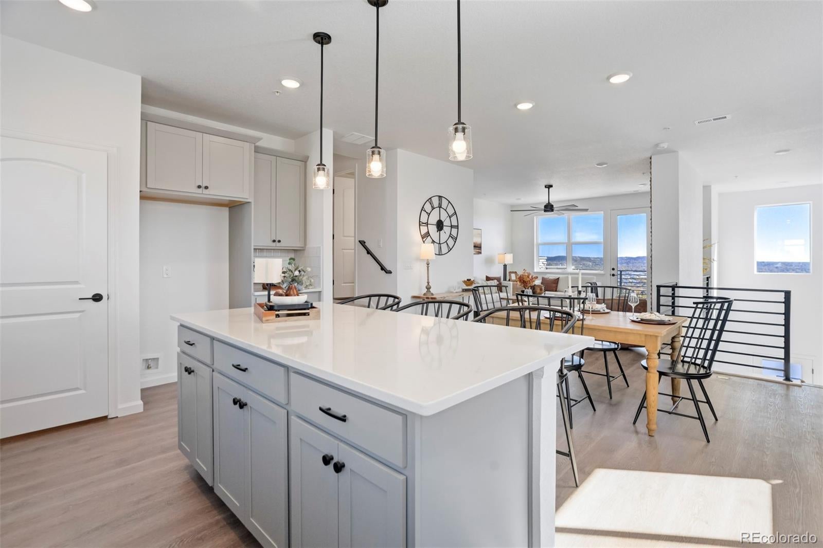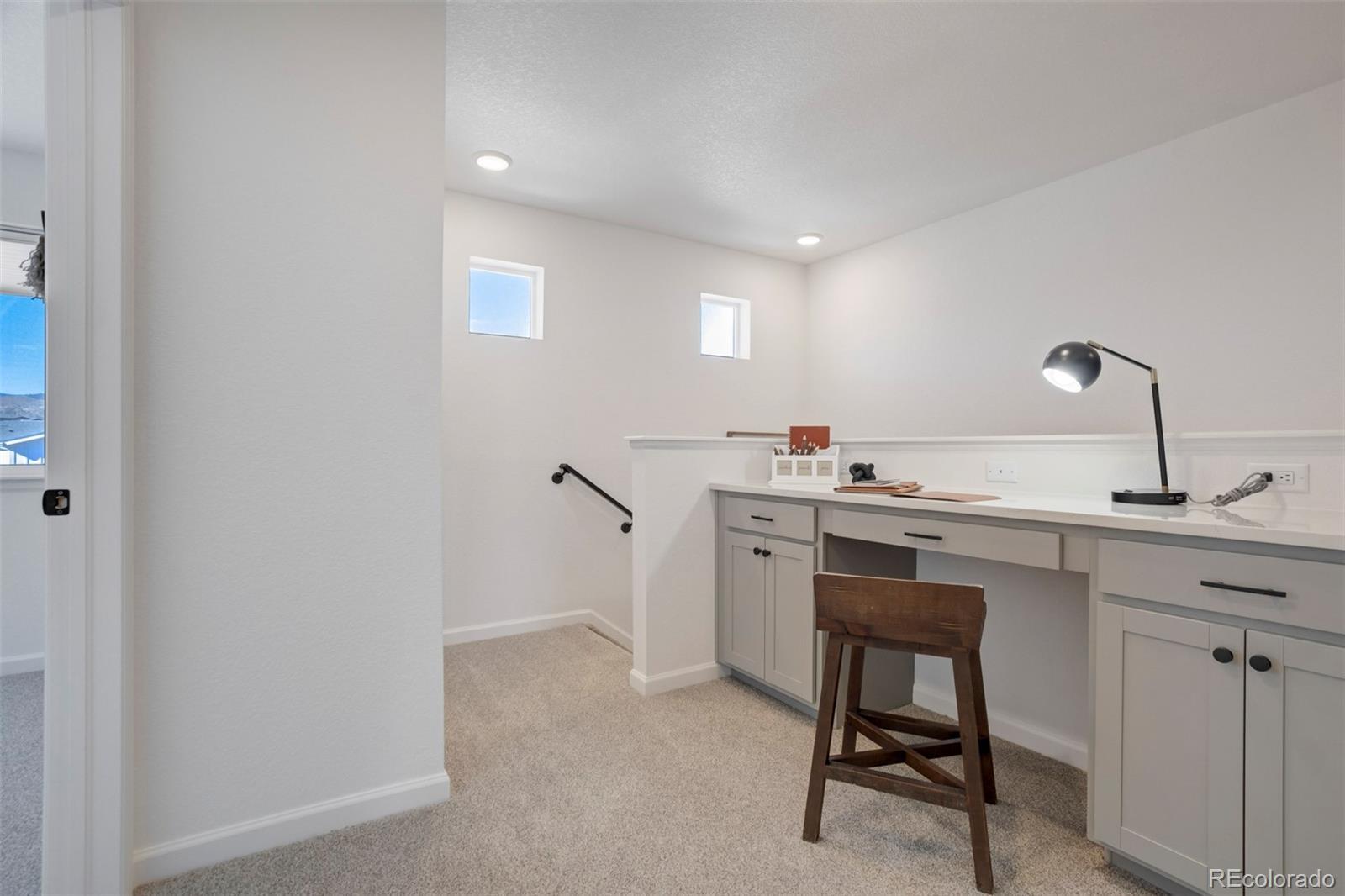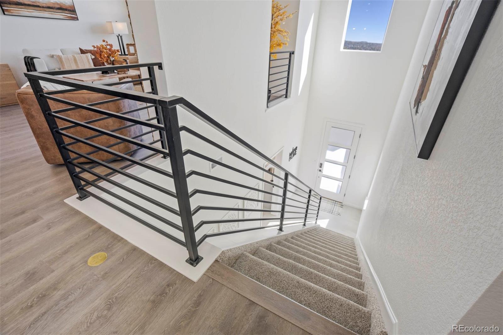 This stunning 3-story home sits on the prime lot & is packed with upgrades — offering sweeping city & mountain views! Step inside to find light, neutral tones, fresh interior paint & an open-concept main level designed for effortless entertaining. The largest floorpan includes a spacious kitchen which shines with large island, custom soft-close cabinetry, quartz counters, granite sink, walk-in pantry with 110 outlet & premium Café appliances (range & microwave) — perfect for the home chef. From the main level, step out onto your walkout deck & take in the open space & breathtaking city views — the ideal spot to unwind or entertain as the sun sets over the city. Upstairs, a cozy nook/desk makes a great home office or study area, while the primary suite features a large picture window, walk-in closet & a beautifully upgraded bath with tiled shower, handheld nozzle, & backlit mirrors. 2 additional bedrooms and a full bath complete the upper level. The lower level offers incredible flexibility with a 2nd primary suite featuring its own living area, kitchenette & private bath — perfect for guests, multi-generational living or income potential! Every detail has been thoughtfully upgraded, including: Soft-close cabinetry throughout Finished, insulated garage w/ epoxy-coated floor, storage racks, & EV wiring First-floor tile flooring, luxury LVP, upgraded carpet & pad throughout Powder-coated custom stair rail Ceiling fans 2 Laundry areas Tankless hot water heater & 14 SEER HVAC Top-down/bottom-up blinds throughout Custom driftwood tile wall in living room Backlit mirrors in ½ bath & primary Exterior lights on photo cell/auto switching & added matching balcony light Transferable warranty included! Forget yard work — just relax & enjoy or explore the nearby walking path that leads to a city-built dog park. All this, just minutes from Garden of the Gods, restaurants, shopping & only 8 minutes to downtown Colorado Springs!