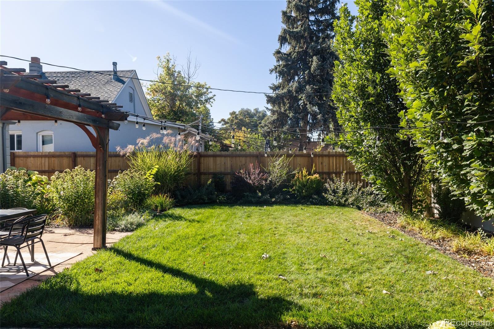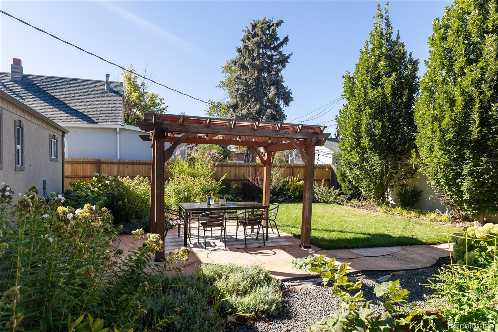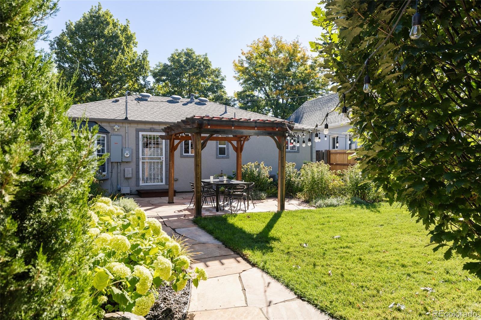 Step into this beautifully remodeled home in the heart of Berkeley Highlands. The open living area welcomes you with well-cared-for hardwood floors and coved ceilings, creating a space that feels both timeless and fresh. The contemporary kitchen features quartz countertops, a breakfast bar, custom cabinetry with a walk-in pantry, stainless steel appliances, and a sleek tile backsplash—perfectly connected to the living space for effortless entertaining. The main floor primary suite offers a spacious retreat with an ensuite bathroom with large shower and double vanity with quartz counters and Abundant natural light from a large picture window with built-in seating overlooking the backyard. Two additional bedrooms and a second full bath complete the main level. Outside, discover a private oasis on a double lot with a custom flagstone patio, mature oak trees, perennial gardens with mature hydrangeas, a pergola, and string lights—complete with automated drip irrigation and a raised vegetable bed. Recent updates include a newer roof and whole-house fan for added comfort. The property also includes airstream parking, an oversized two-car detached garage built in 2015 with pull-down attic storage, and a storage shed. Just blocks from Berkeley Lake Park, neighborhood favorites like sushi, coffee, and wine bars, plus the vibrant shops and restaurants on Tennyson Street, this home blends thoughtful design with a prime location and easy access to I-70 for weekend mountain getaways.