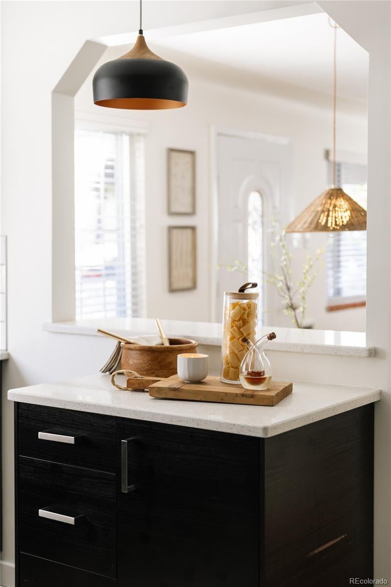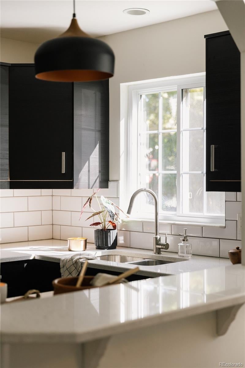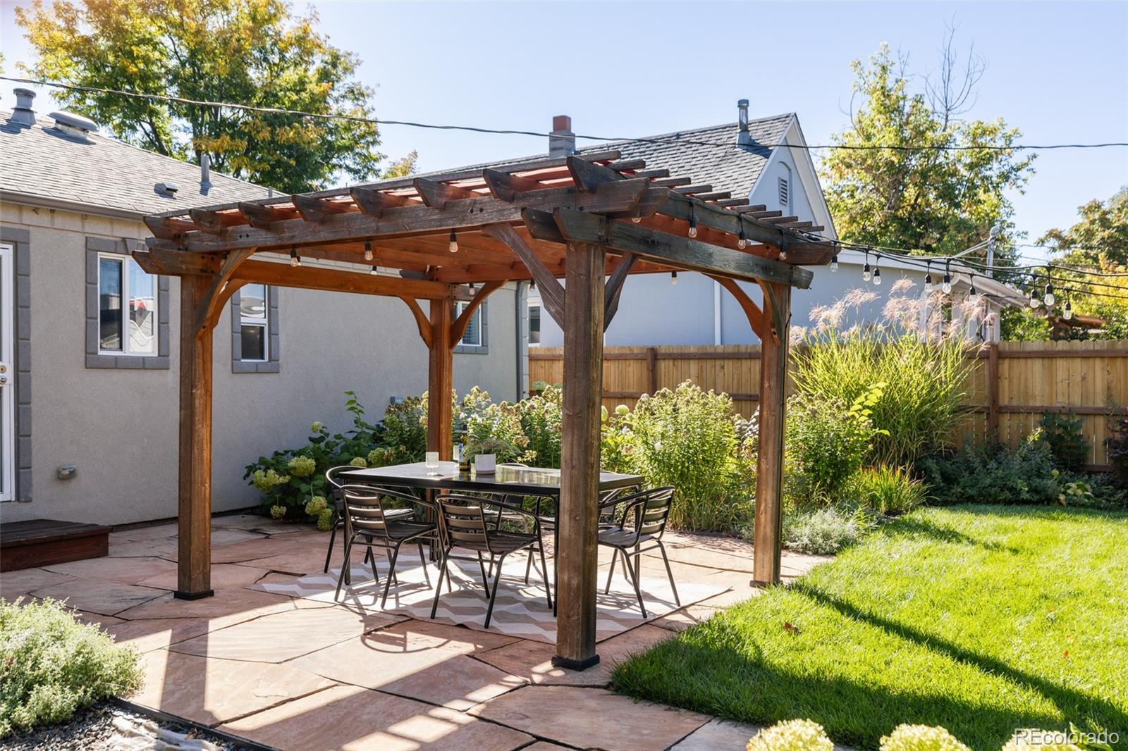 Step into this beautifully remodeled home in the heart of Berkeley Highlands. The open living area welcomes you with well-cared-for hardwood floors and coved ceilings, creating a space that feels both timeless and fresh. The contemporary kitchen features quartz countertops, a breakfast bar, custom cabinetry with a walk-in pantry, stainless steel appliances, and a sleek tile backsplash—perfectly connected to the living space for effortless entertaining. The main floor primary suite offers a spacious retreat with an ensuite bathroom with large shower and double vanity with quartz counters and Abundant natural light from a large picture window with built-in seating overlooking the backyard. Two additional bedrooms and a second full bath complete the main level. Outside, discover a private oasis on a double lot with a custom flagstone patio, mature oak trees, perennial gardens with mature hydrangeas, a pergola, and string lights—complete with automated drip irrigation and a raised vegetable bed. Recent updates include a newer roof and whole-house fan for added comfort. The property also includes airstream parking, an oversized two-car detached garage built in 2015 with pull-down attic storage, and a storage shed. Just blocks from Berkeley Lake Park, neighborhood favorites like sushi, coffee, and wine bars, plus the vibrant shops and restaurants on Tennyson Street, this home blends thoughtful design with a prime location and easy access to I-70 for weekend mountain getaways.