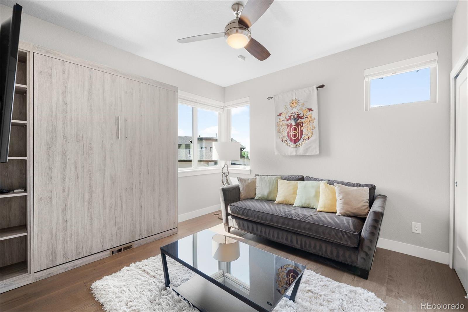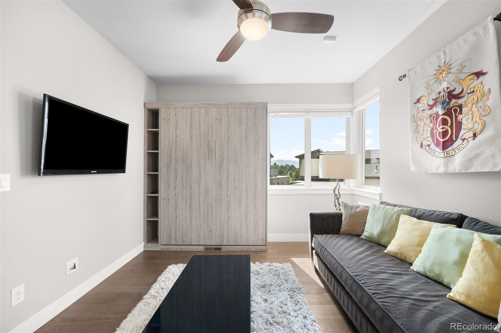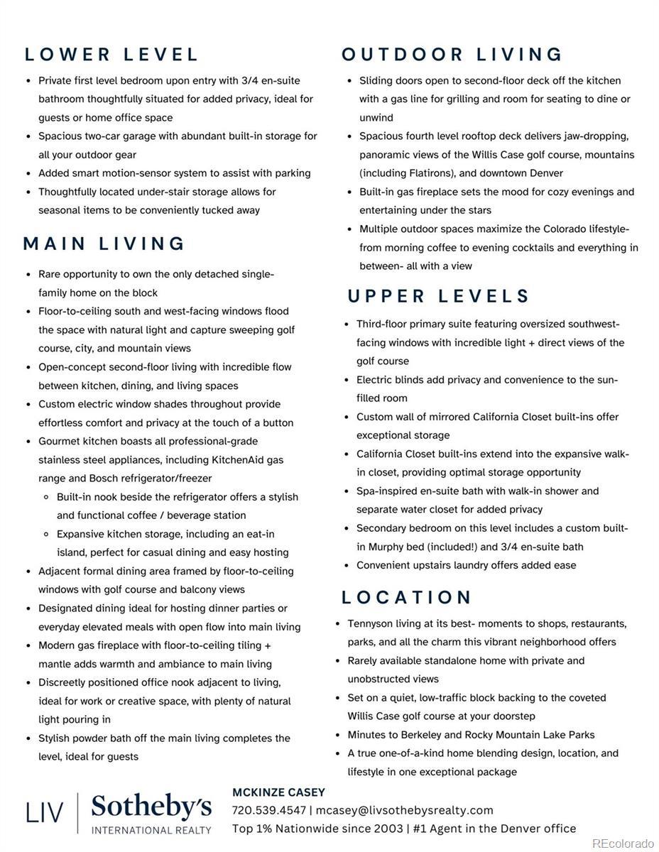 Rare detached single-family home, this gem offers privacy along with 360 degrees of breathtaking mountain and golf course views and an ultra-functional, design-forward layout across four levels of living. A main floor bedroom with an ensuite bath offers flexibility for guests or a home office. The oversized two-car garage makes use of the space with custom built-ins providing storage galore - perfect for the four-season Colorado explorations, easily accessible on the first floor, and includes a handy backup sensor to alert you when you are fully parked. The second floor open-concept living space with kitchen, dining, and living room is flooded with natural light from floor-to-ceiling Western windows, with electric window coverings, showcasing the one-of-a-kind mountain/golf course views. Off the main level is the first outdoor living opportunity with a private balcony, offering a gas line for grilling and ideal for dining al fresco. The kitchen boasts a gas range, generous kitchen storage, and a thoughtfully tucked-away office nook, making daily living and hosting feel seamless. The third level has conveniently located laundry room to benefit the two additional spacious bedrooms, including a dreamy primary suite with oversized Southwest-facing windows, a spa-like ensuite with walk-in shower, and a massive custom walk-in closet. The secondary bedroom is equally impressive, complete with a built-in custom Murphy bed (included) and 3/4 ensuite bath. Crowning the home is a jaw-dropping rooftop deck designed for maximum impact-with panoramic mountain and golf course views, a built-in gas fireplace, and ample space for entertaining under the Colorado sky. Framed by sweeping golf course views and just moments from all the energy and charm of Tennyson Street, this home offers the ultimate in privacy, location, and lifestyle that’s impossible to replicate.