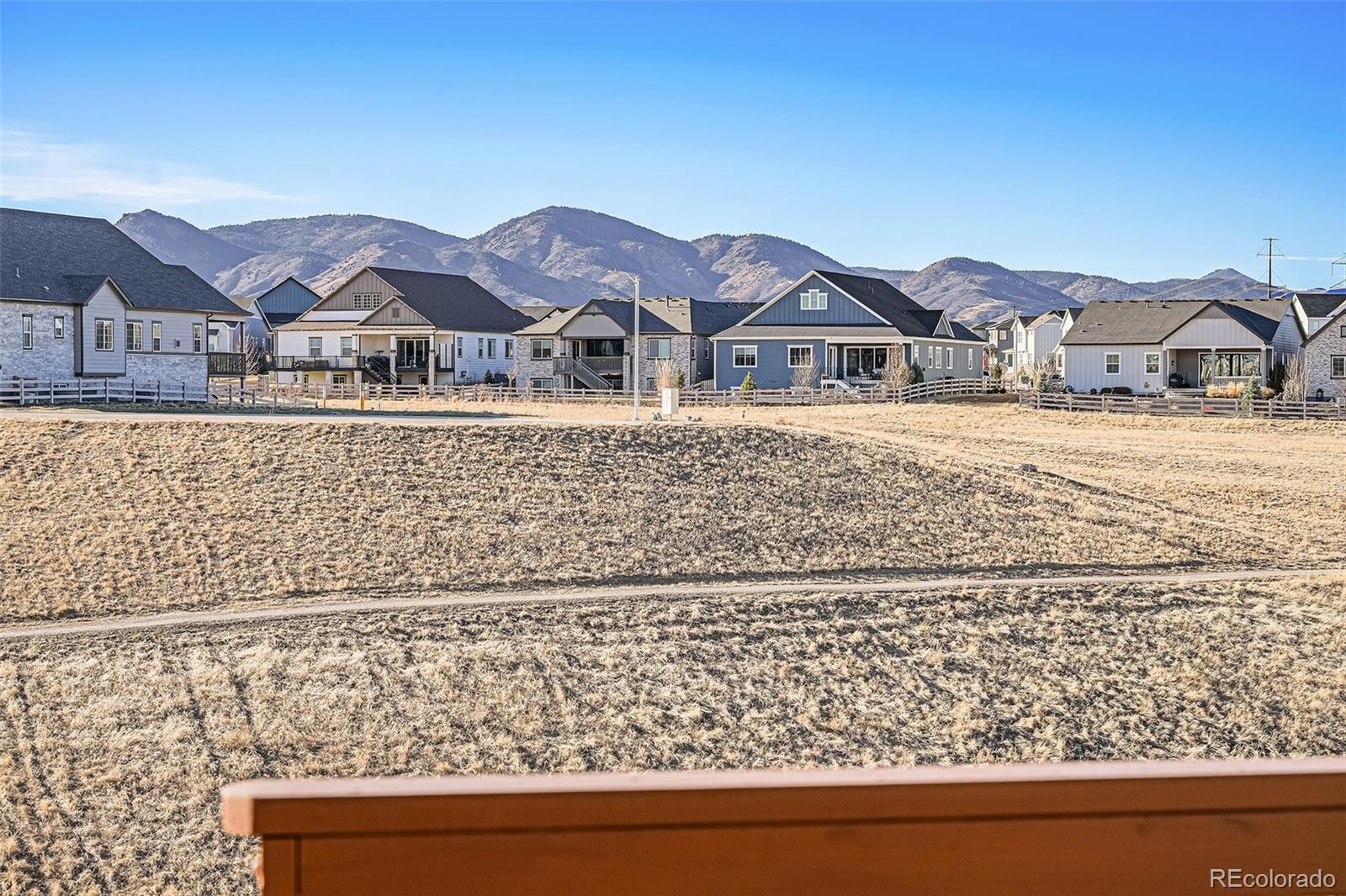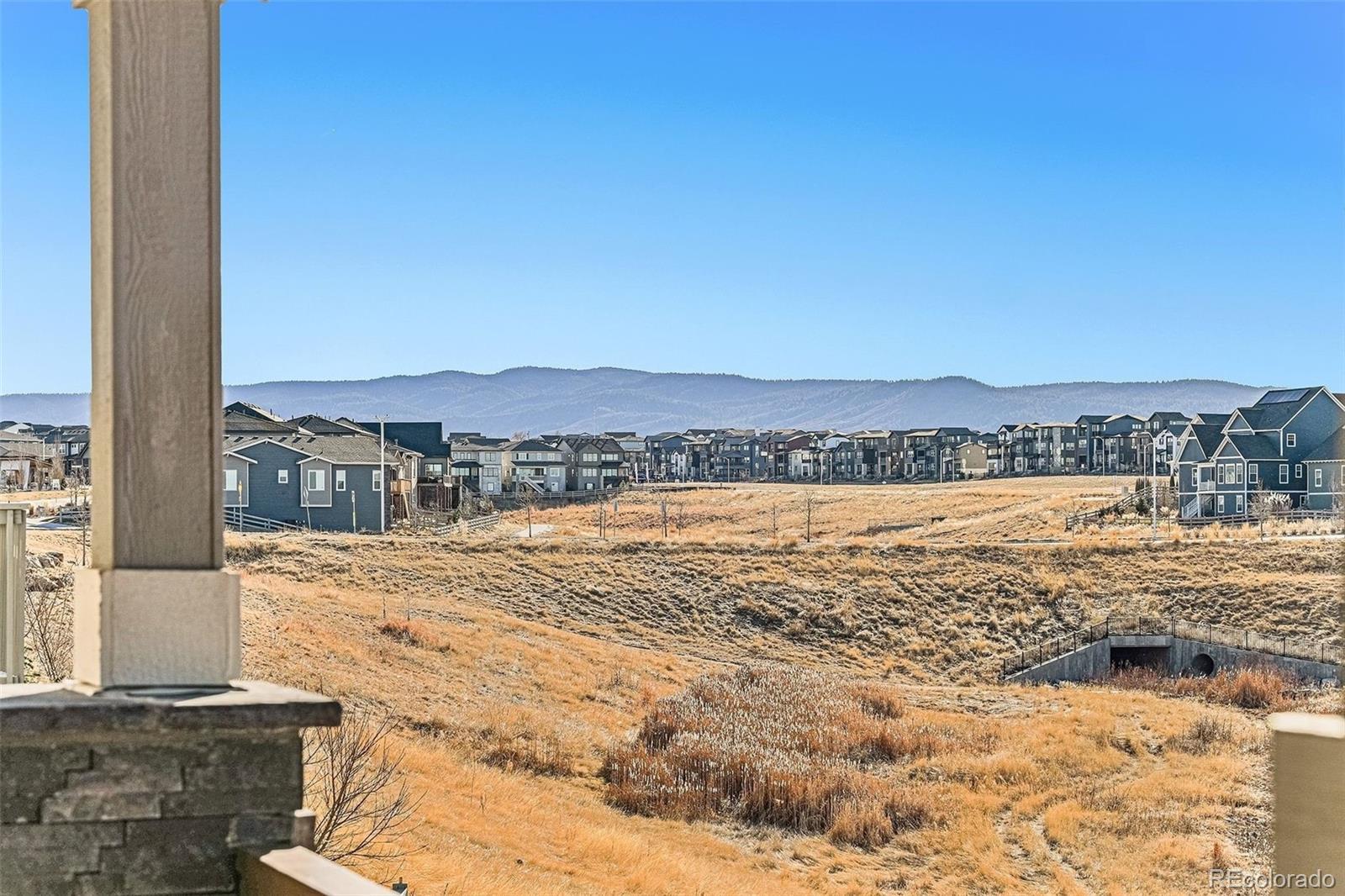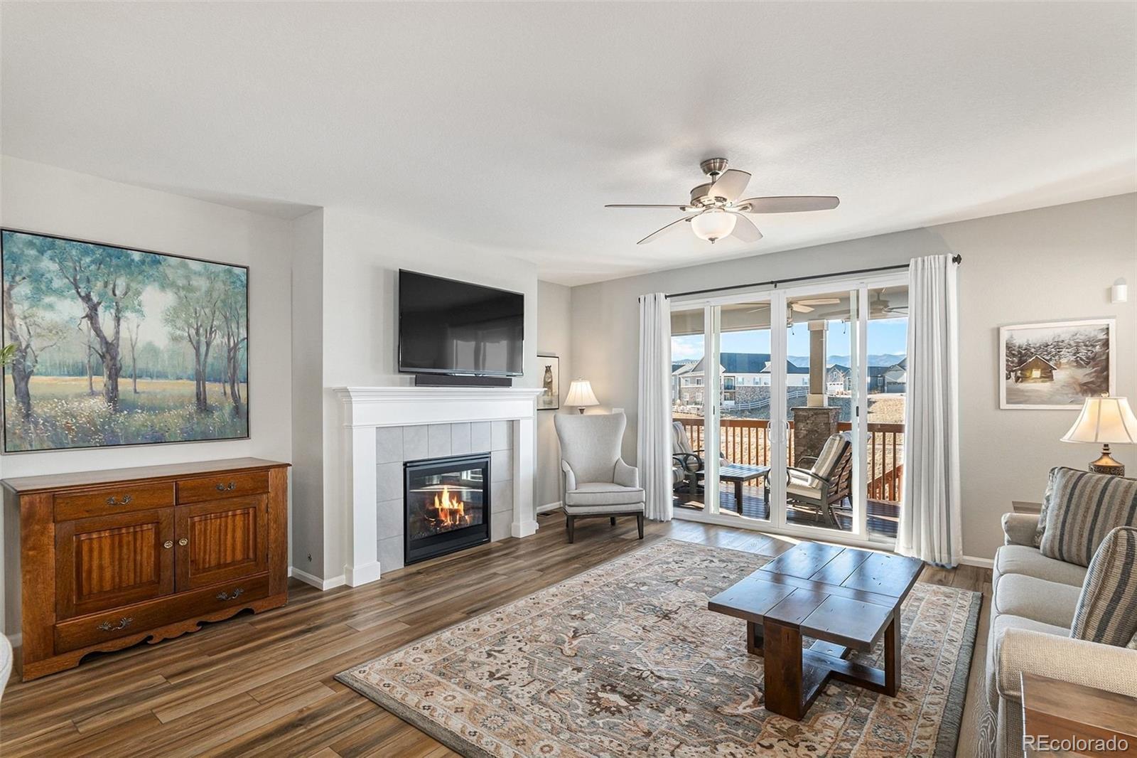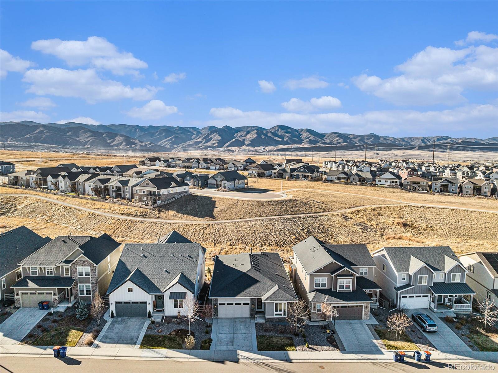 Nestled against a backdrop of breathtaking mountain views, this impeccably designed luxury home is positioned on a premium lot backing to open space, that captures sweeping vistas and a serene sense of tranquility. A bright foyer welcomes you into the open-concept great room, dining area, and kitchen, filled with natural light from oversized windows and a 10’ sliding glass door opening to the expansive upper deck. The gourmet kitchen features a gas cooktop, stainless steel hood, white cabinetry, granite countertops, tile backsplash, and an island sink, making it ideal for both entertaining and everyday living. The spacious primary bedroom offers room for a comfortable seating area, creating a relaxing retreat for morning reading or unwinding in the evening. The primary ensuite features double vanities, an oversized tiled shower with seating, and upscale finishes. Two additional bedrooms, a full bath, and a laundry room with cabinetry and a sink complete the main level. The finished walk-out basement is designed for additional entertaining, featuring a wet bar perfect for game nights, movie evenings, or hosting guests. This level also includes two bedrooms, a bathroom with a walk-in shower, and ample storage, offering flexible living options. Additional upgrades include custom light fixtures, ceiling fans throughout including exterior spaces, smart home features, added electrical, additional windows, a heated garage, and durable epoxy flooring. Outdoor living shines with a fenced backyard, extended driveway, rear walkway, turf landscaping, a Rachio-controlled irrigation system, and inviting patio and deck spaces. With direct access to open space, the setting offers exceptional privacy. Enjoy sunset views, cozy evenings by the fireplace, and entertaining in style within the vibrant and expanding Sterling Ranch community, known for trails, community events, and convenient access to shopping, dining, and outdoor recreation.