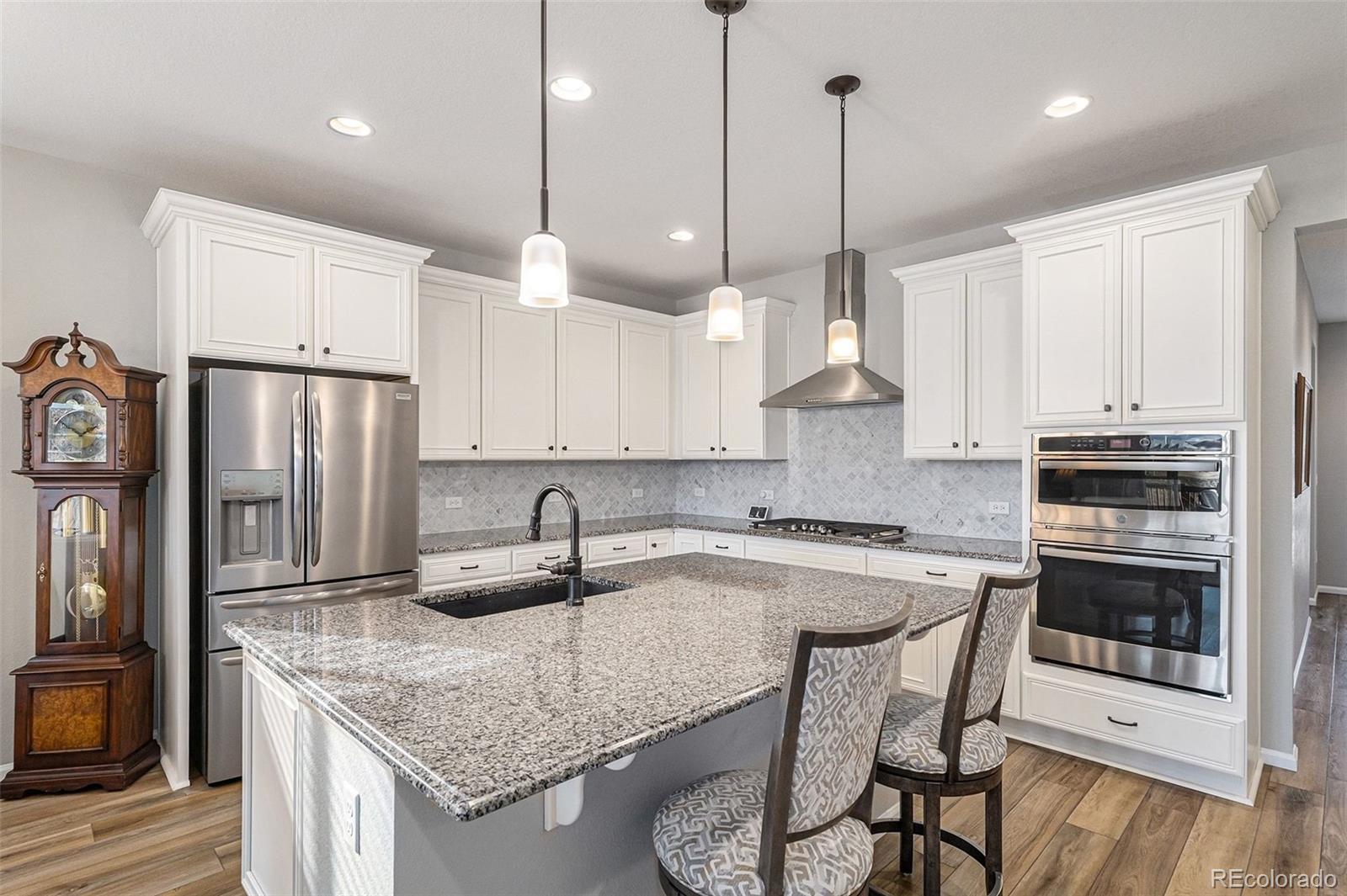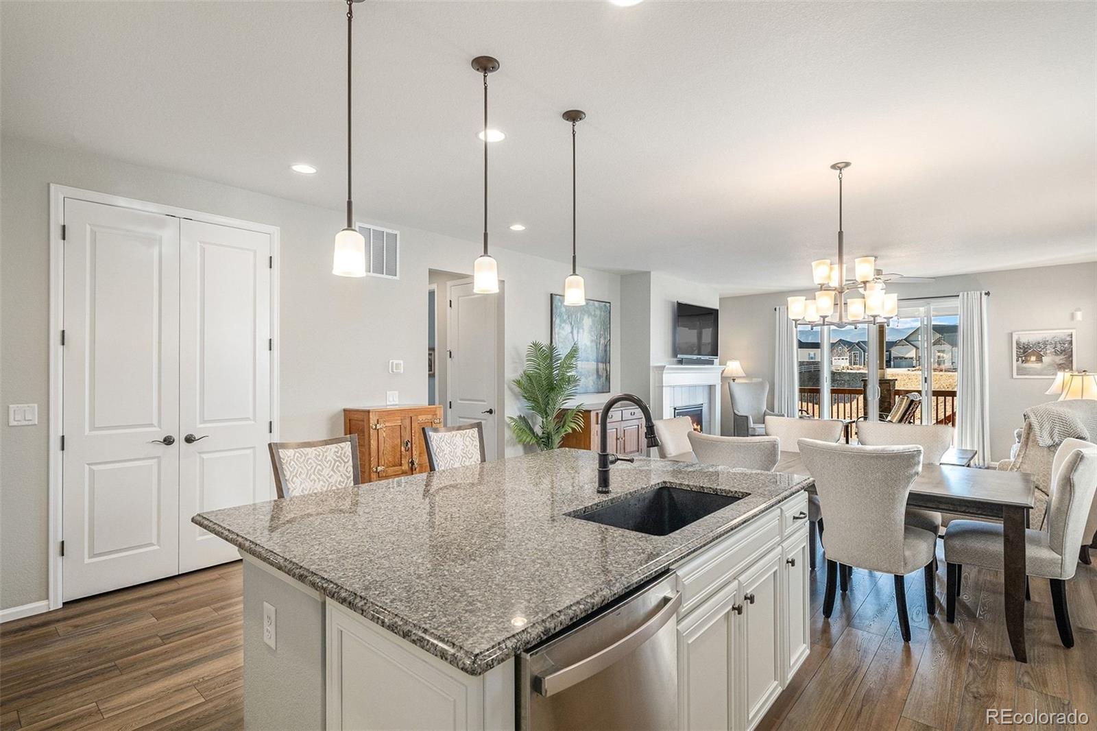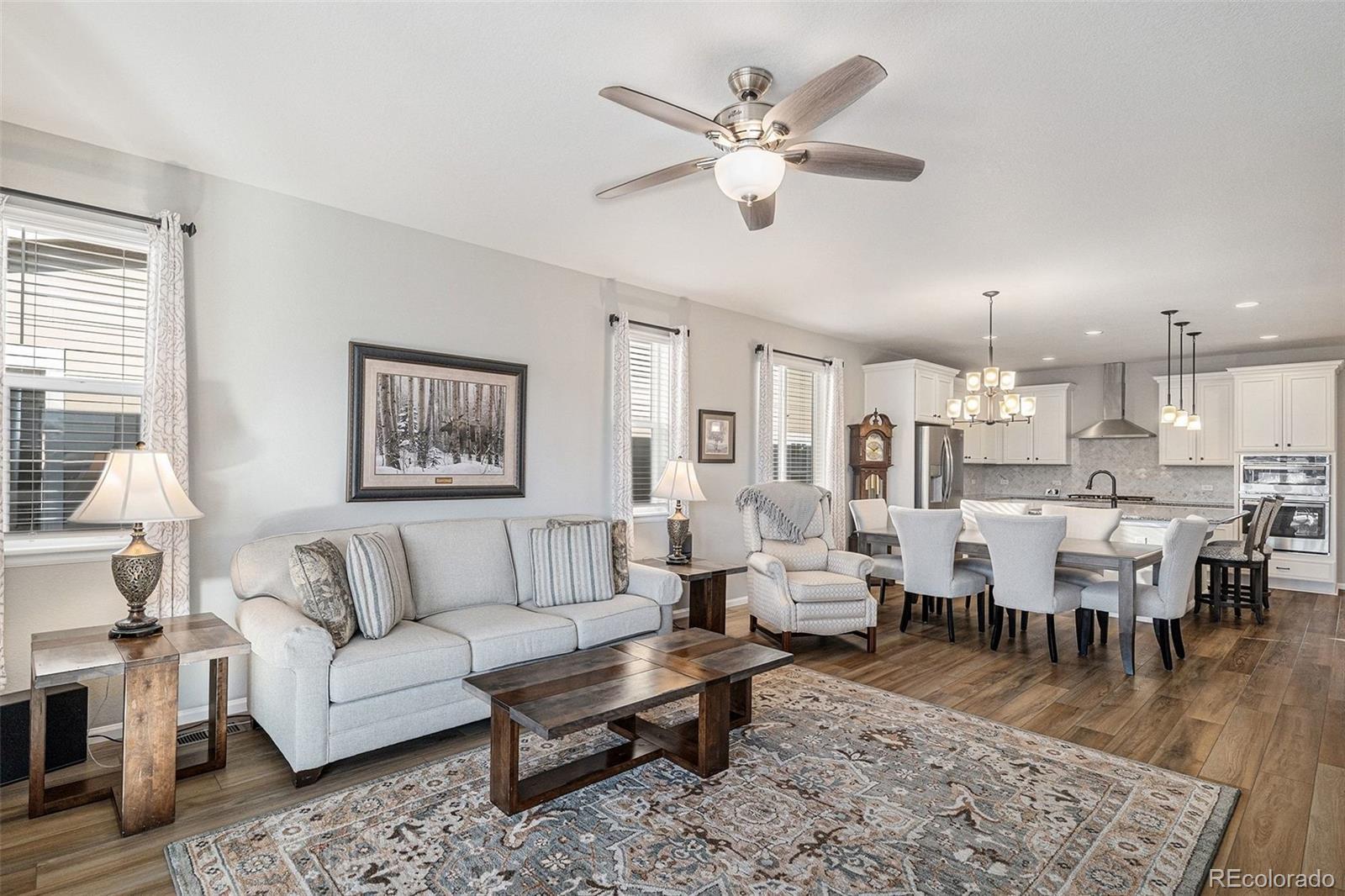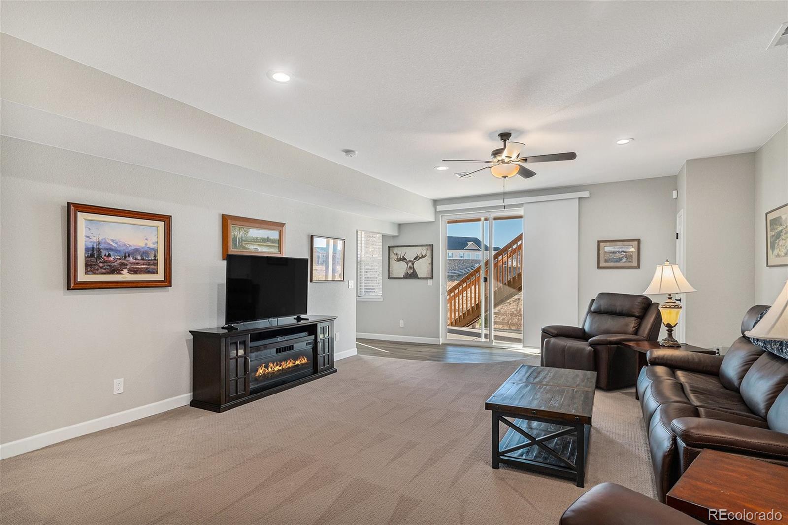 Nestled against a backdrop of breathtaking mountain views, this impeccably designed luxury home is positioned on a premium lot backing to open space, that captures sweeping vistas and a serene sense of tranquility. A bright foyer welcomes you into the open-concept great room, dining area, and kitchen, filled with natural light from oversized windows and a 10’ sliding glass door opening to the expansive upper deck. The gourmet kitchen features a gas cooktop, stainless steel hood, white cabinetry, granite countertops, tile backsplash, and an island sink, making it ideal for both entertaining and everyday living. The spacious primary bedroom offers room for a comfortable seating area, creating a relaxing retreat for morning reading or unwinding in the evening. The primary ensuite features double vanities, an oversized tiled shower with seating, and upscale finishes. Two additional bedrooms, a full bath, and a laundry room with cabinetry and a sink complete the main level. The finished walk-out basement is designed for additional entertaining, featuring a wet bar perfect for game nights, movie evenings, or hosting guests. This level also includes two bedrooms, a bathroom with a walk-in shower, and ample storage, offering flexible living options. Additional upgrades include custom light fixtures, ceiling fans throughout including exterior spaces, smart home features, added electrical, additional windows, a heated garage, and durable epoxy flooring. Outdoor living shines with a fenced backyard, extended driveway, rear walkway, turf landscaping, a Rachio-controlled irrigation system, and inviting patio and deck spaces. With direct access to open space, the setting offers exceptional privacy. Enjoy sunset views, cozy evenings by the fireplace, and entertaining in style within the vibrant and expanding Sterling Ranch community, known for trails, community events, and convenient access to shopping, dining, and outdoor recreation.