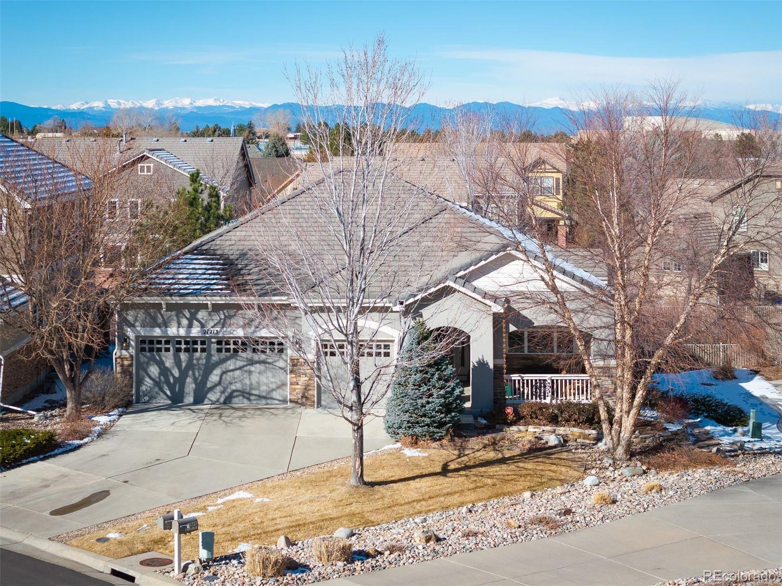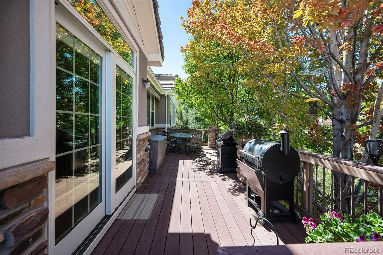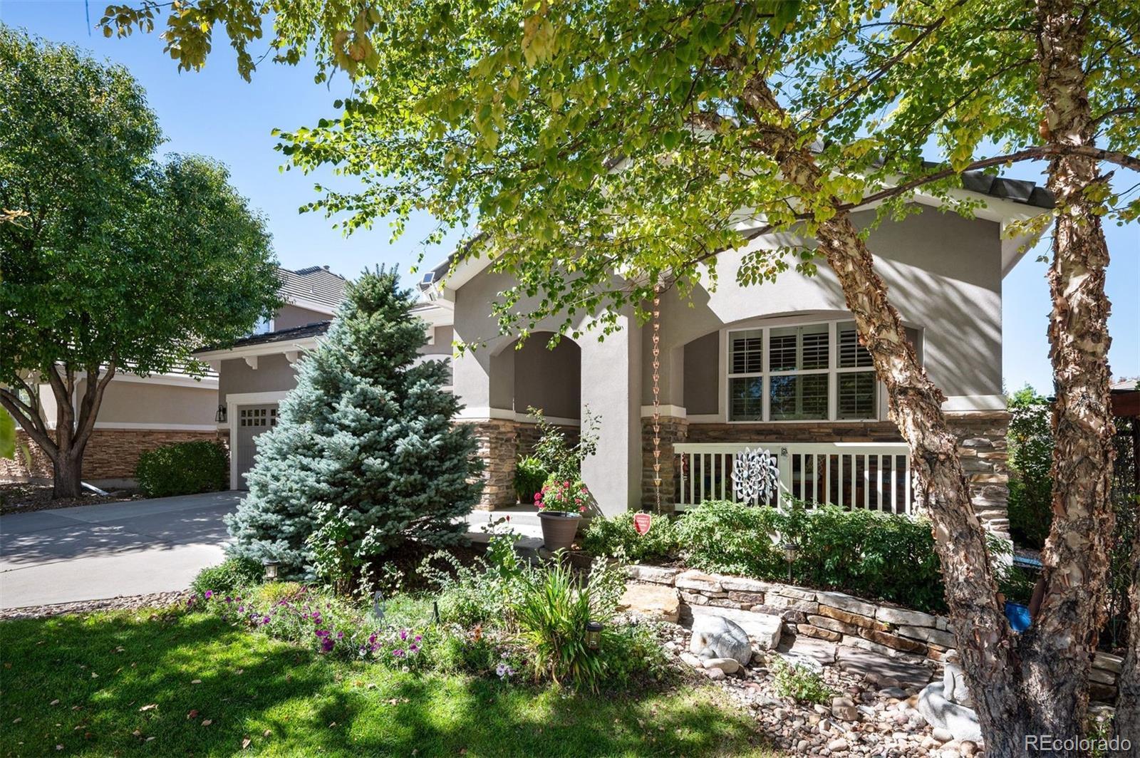 Discover effortless living in this beautifully maintained ranch home in Turnberry at Saddle Rock. Surrounded by mature trees and professional landscaping, this 4-bedroom, 4-bath residence combines main-level convenience with generous entertaining spaces and a low-maintenance lifestyle. The inviting interior showcases hardwood floors, abundant natural light, and thoughtful updates throughout. A dedicated office with built-ins and plantation shutters provides a quiet workspace at the front of the home. The open-concept kitchen features granite countertops, matte black appliances, pull-out cabinetry, and excellent storage, connecting seamlessly to the dining and living areas. A gas fireplace and access to the deck create a warm, relaxed flow for indoor-outdoor living. The main-level primary suite includes dual closets, a large walk-in shower, dual sinks, and heated tile floors. Two additional bedrooms, a full bath, and a laundry/mudroom complete the main floor. The professionally finished garden-level basement offers an expansive recreation room with a wet bar, game and media zones, a second gas fireplace, a fitness or flex room, a guest bedroom, and a full bath. Additional highlights include a newer furnace, A/C, attic fan, built-in vacuum, newer carpet, and a three-car garage with an epoxy floor. The HOA maintains front lawn care and snow removal, ensuring a truly low-maintenance lifestyle. Enjoy proximity to Southlands Shopping Center, E-470, golf, parks, and Cherry Creek Schools in this serene and well-connected community.