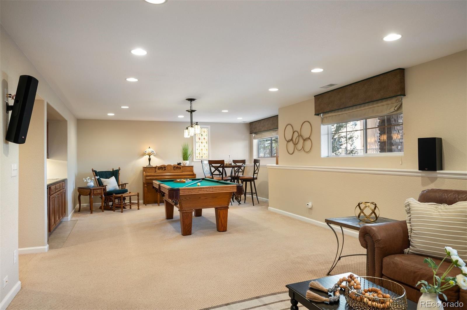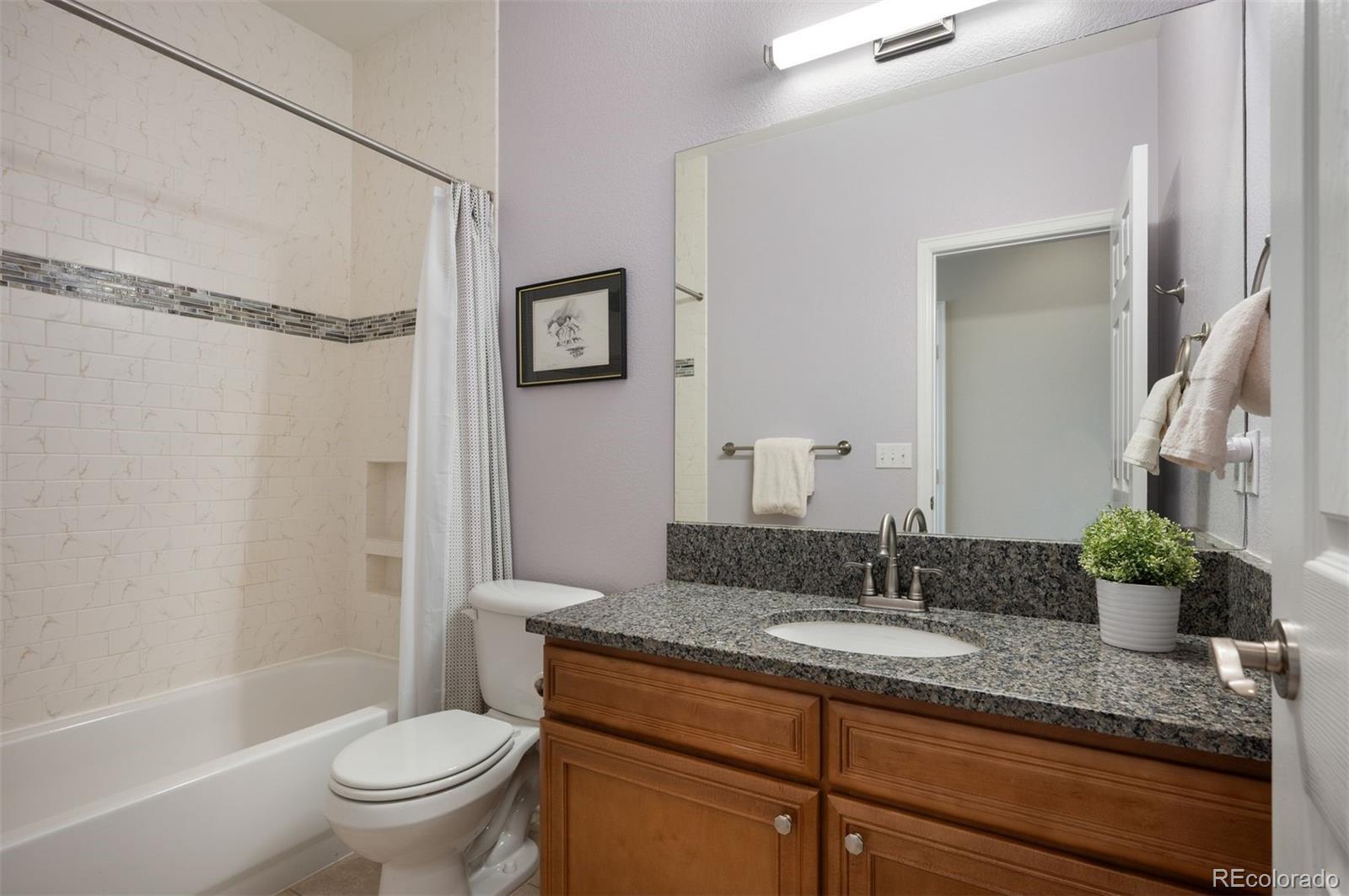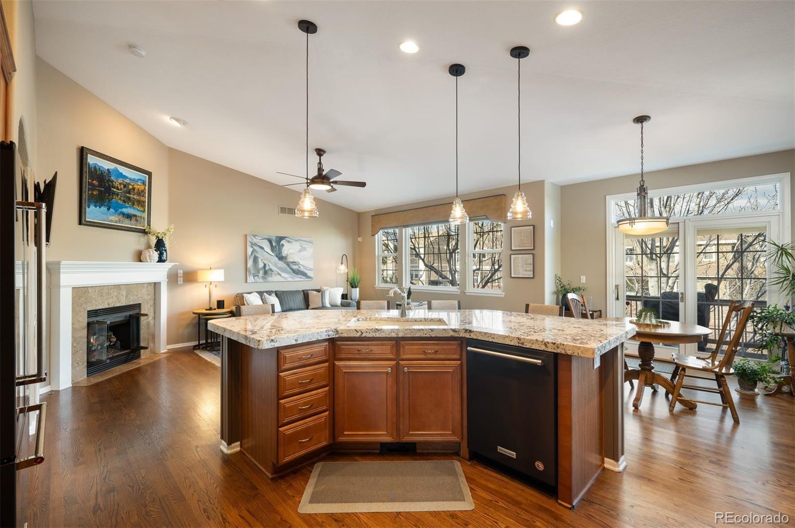 Discover effortless living in this beautifully maintained ranch home in Turnberry at Saddle Rock. Surrounded by mature trees and professional landscaping, this 4-bedroom, 4-bath residence combines main-level convenience with generous entertaining spaces and a low-maintenance lifestyle. The inviting interior showcases hardwood floors, abundant natural light, and thoughtful updates throughout. A dedicated office with built-ins and plantation shutters provides a quiet workspace at the front of the home. The open-concept kitchen features granite countertops, matte black appliances, pull-out cabinetry, and excellent storage, connecting seamlessly to the dining and living areas. A gas fireplace and access to the deck create a warm, relaxed flow for indoor-outdoor living. The main-level primary suite includes dual closets, a large walk-in shower, dual sinks, and heated tile floors. Two additional bedrooms, a full bath, and a laundry/mudroom complete the main floor. The professionally finished garden-level basement offers an expansive recreation room with a wet bar, game and media zones, a second gas fireplace, a fitness or flex room, a guest bedroom, and a full bath. Additional highlights include a newer furnace, A/C, attic fan, built-in vacuum, newer carpet, and a three-car garage with an epoxy floor. The HOA maintains front lawn care and snow removal, ensuring a truly low-maintenance lifestyle. Enjoy proximity to Southlands Shopping Center, E-470, golf, parks, and Cherry Creek Schools in this serene and well-connected community.