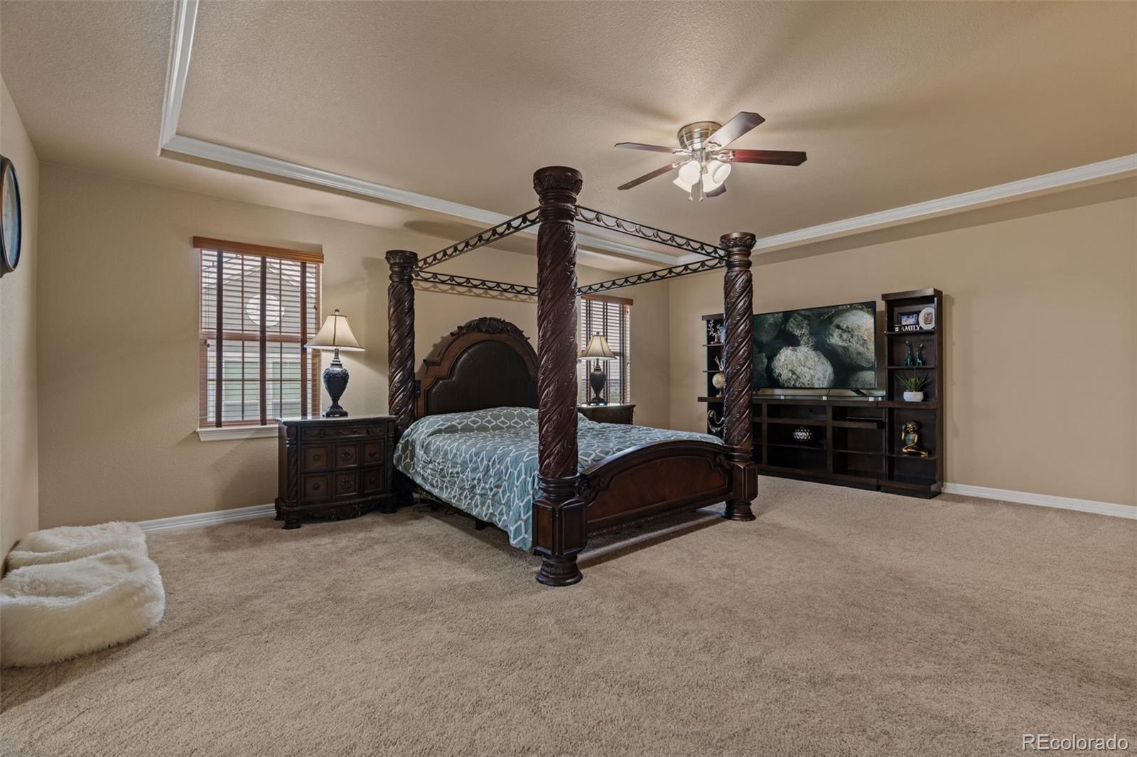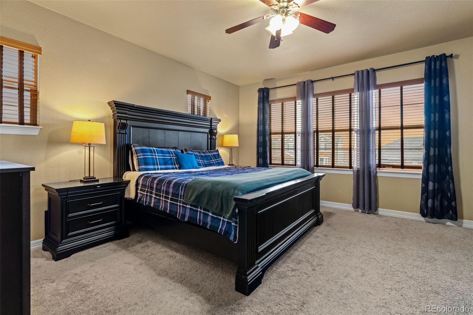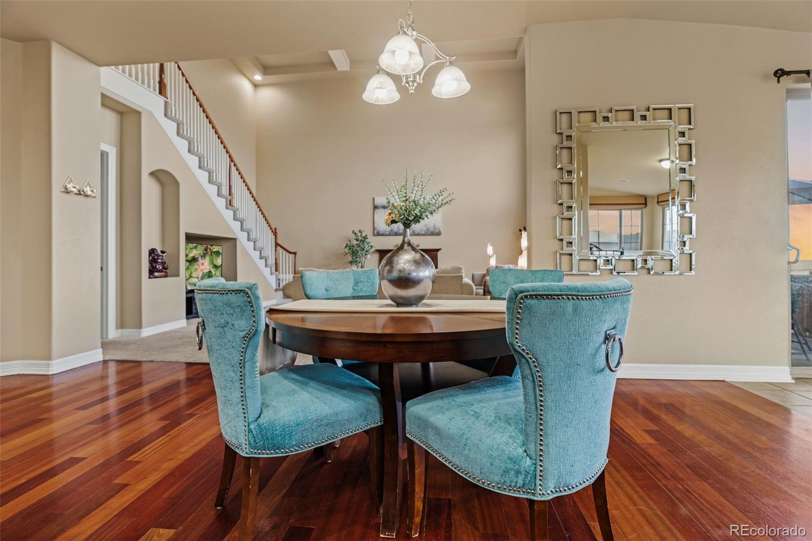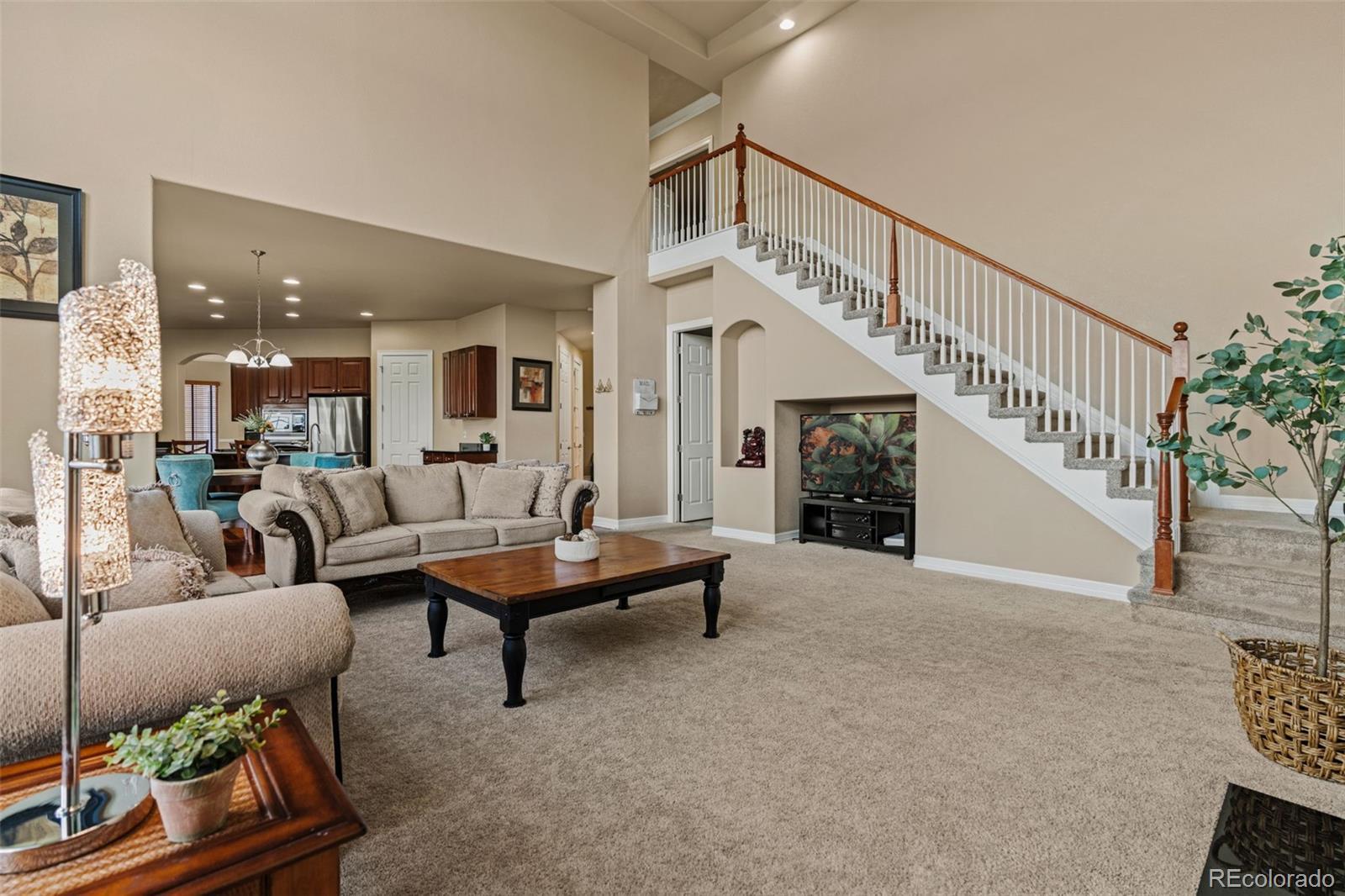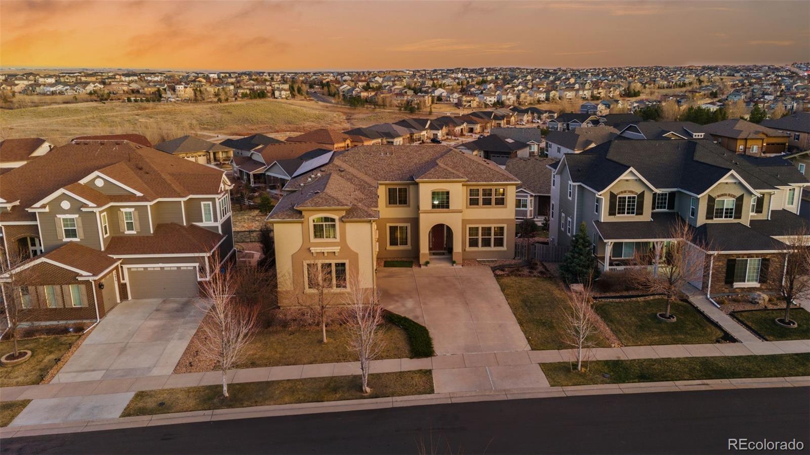 One of the largest floorplans built in SE Aurora, this over 6,200 sqft finished Toll Brothers home blocks away from the Aurora Reservoir in Beacon Point is priced for instant equity and is ready for all of your cosmetic updates! This 6 bedroom, 5 bath home offers a finished walkout basement situated on a quiet lot backing to a greenbelt. The home showcases several dramatic design elements including a spiral staircase in the two story foyer as well as soaring living room windows that are set against 25 foot vaulted ceilings with beams and a gas fireplace. The main floor also offers not one, but two home office spaces (or room for a piano if inclined) as well as a dedicated formal dining room and large dine in kitchen. The main floor sunroom opens to a deck that provides views to the east as well as water views of the nearby Aurora Reservoir. Off the living room, a secondary staircase leads upstairs to four additional bedrooms including the massive Primary Suite with dedicated seating area, dual closets and five piece ensuite bath. Two more secondary bedrooms upstairs are connected by a Jack and Jill bath, while the fourth bedroom enjoys it's own private ensuite bath. The fully finished walkout basement is ready for entertaining with a large theatre screen with projector. A large secondary Primary Suite in the basement provides the perfect guest retreat or opportunity for multigenerational living. A 6th nonconforming bedroom could also be utilized as a home gym or large playroom. The low maintenance backyard includes artificial turf and an extended concrete patio for those upcoming warm evenings outdoors. Solar panels are fully owned! Located within walking distance of elementary, middle and high schools in the award winning Cherry Creek School District as well as the Aurora Reservoir with miles of trails, fishing, paddle boarding and swim beach! Enjoy community amenities including a private pool, clubhouse and tennis courts for Beacon Point residents!