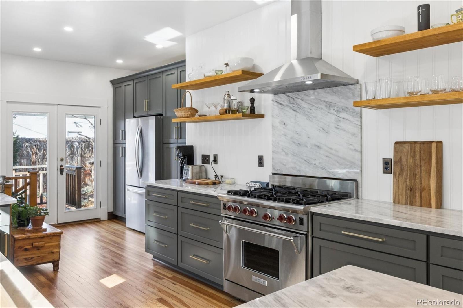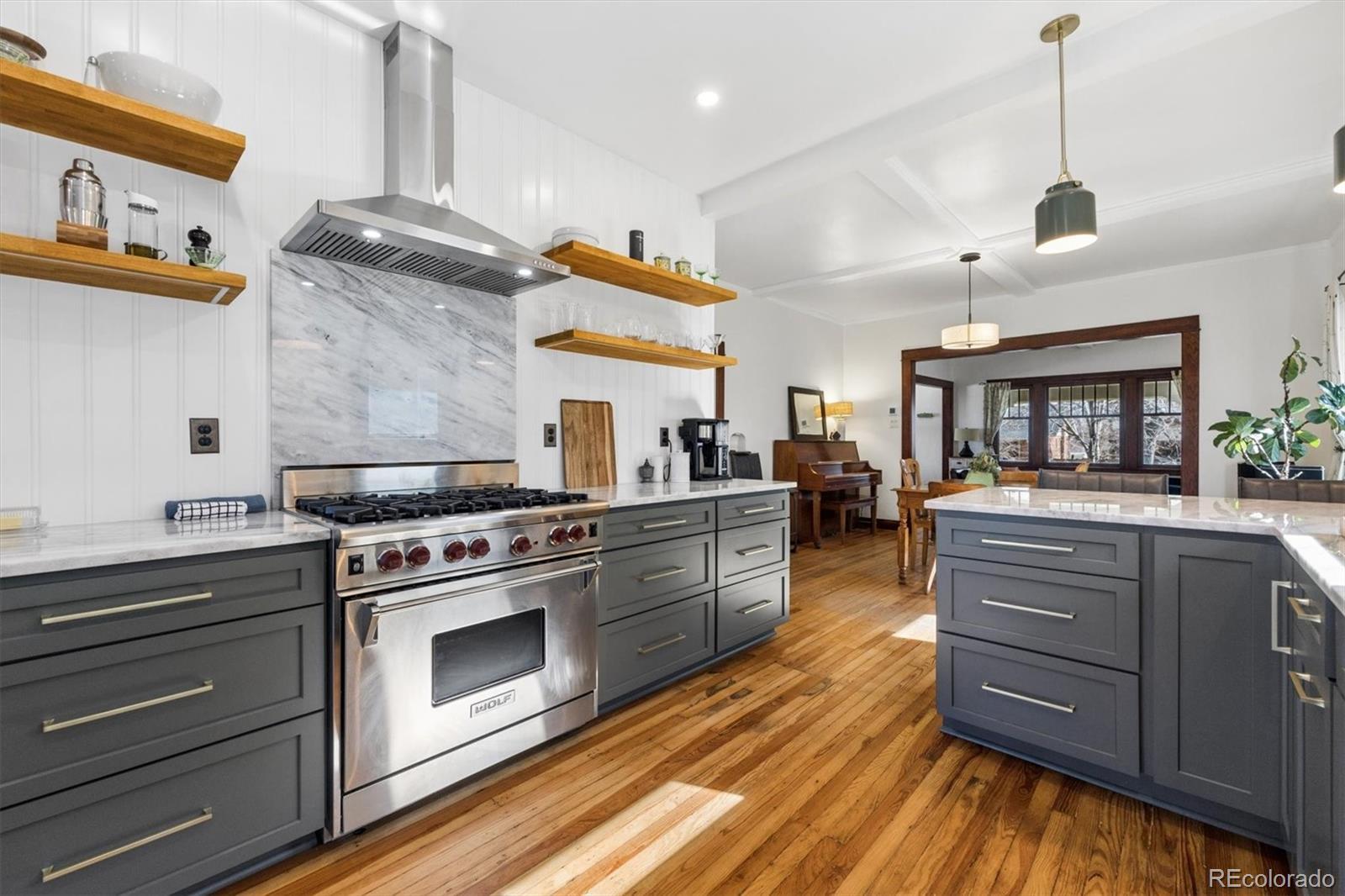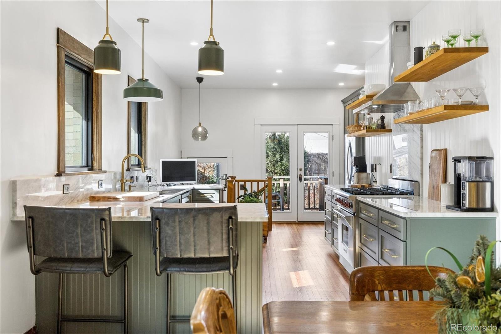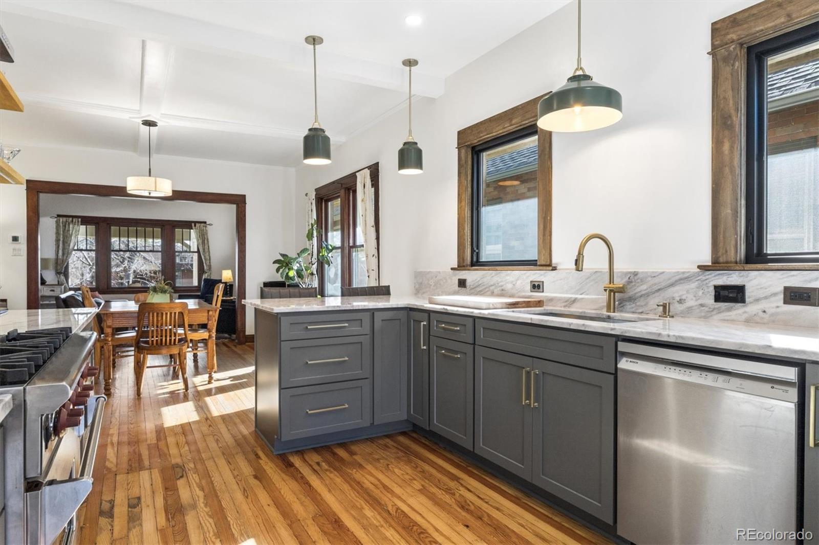 Classic Bungalow in Congress Park with an historic feel, including the thoughtful remodel. Truly it's like everything behind the plaster is new. And, lucky you, this quintessential floor plan has a twist - two bathrooms on the main! The primary bedroom has an en-suite bathroom, a coveted rarity. Plus you'll find an additional bedroom and bath on the main floor. This entire home is completely remodeled and looks fabulous. This is THE classic with an elevated aesthetic. The open kitchen is absolutely stunning. The custom cabinetry in the kitchen is top notch with special storage drawers in the pantry and drawers for plates and glasses to preserve the open shelving look. Six burner gas Wolf range with vent hood. New dishwasher and refrigerator. Each detail delights - the button light switches are period accurate but installed only recently - no knob and tube wiring behind that plate. All of the work was done in the past couple of years, but this is as far from a fix and flip as you can get. The seller did it for himself and spared no expense. Original hardwood floors, original unpainted wood trim, original doors and door hardware (all matching), original mouldings and exterior. Congress Park is perfect for relaxing on your shaded front porch - a sanctuary in the city. In the basement, you'll find a wonderful great room with egress windows, a third bedroom, also with egress windows, laundry and a full bath. There's still room for an office, too. This home is eco-friendly with a high efficiency furnace and central air, and a new roof in 2025 with a 3.6 kW solar shingle system that is low-profile and integrated right into the roofing material. And the best part is that the solar is seller owned - no leases or loans. Walk two blocks to Blue Pan Pizza, The French Press, a local grocery/liquor store, sushi, Mary Martha's gift shop and flowers. Walk a bit farther for upscale Cherry Creek, or head north to Colfax and Natural Grocers, etc. A prime find, book an appointment.