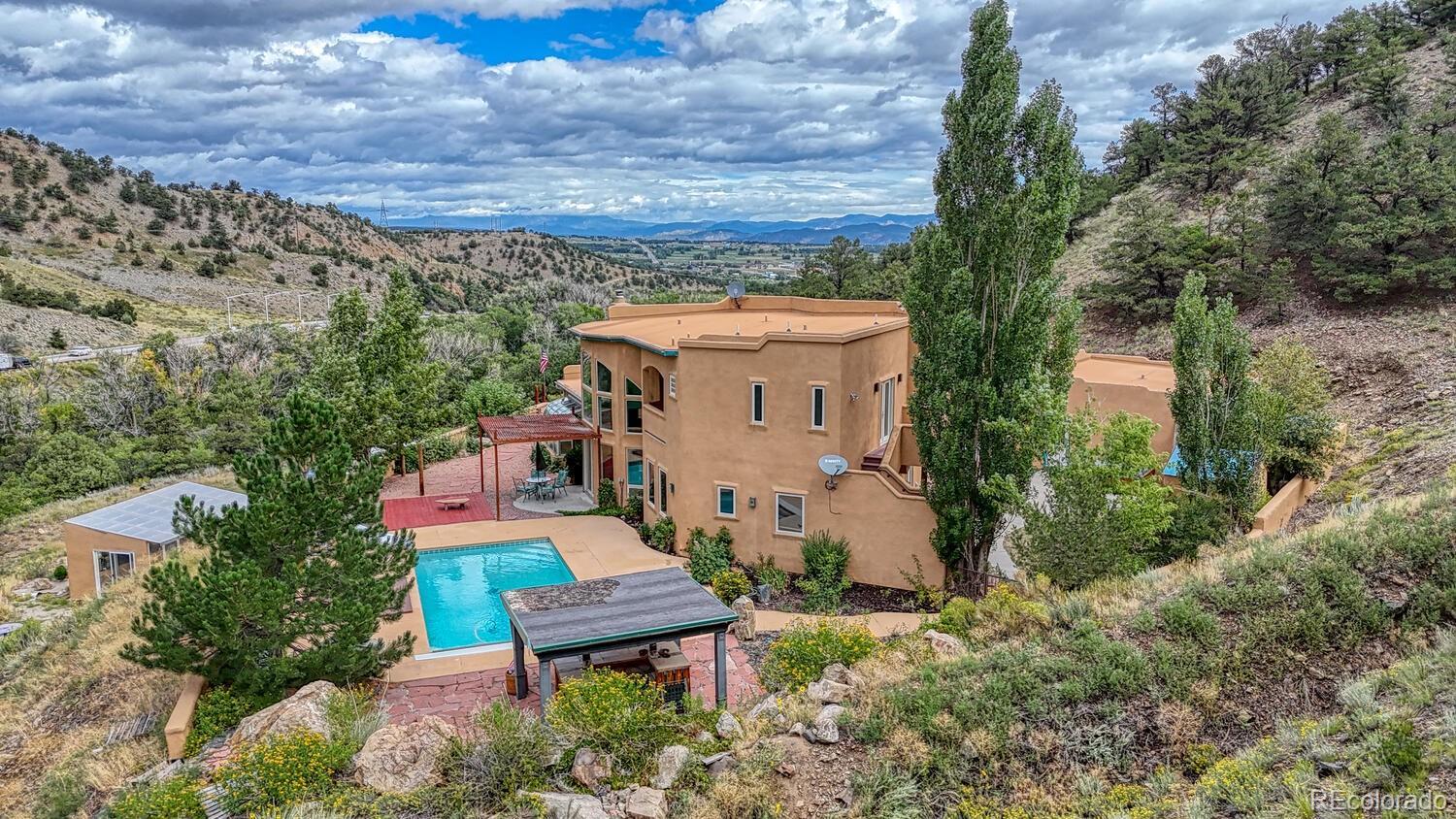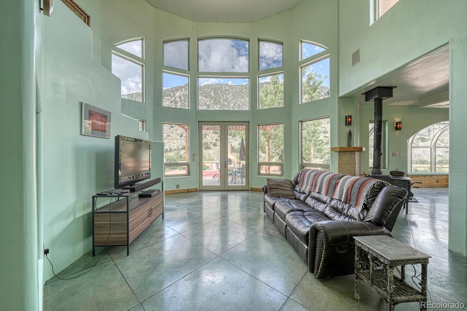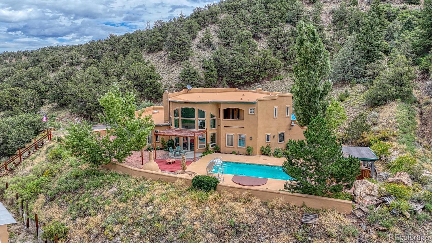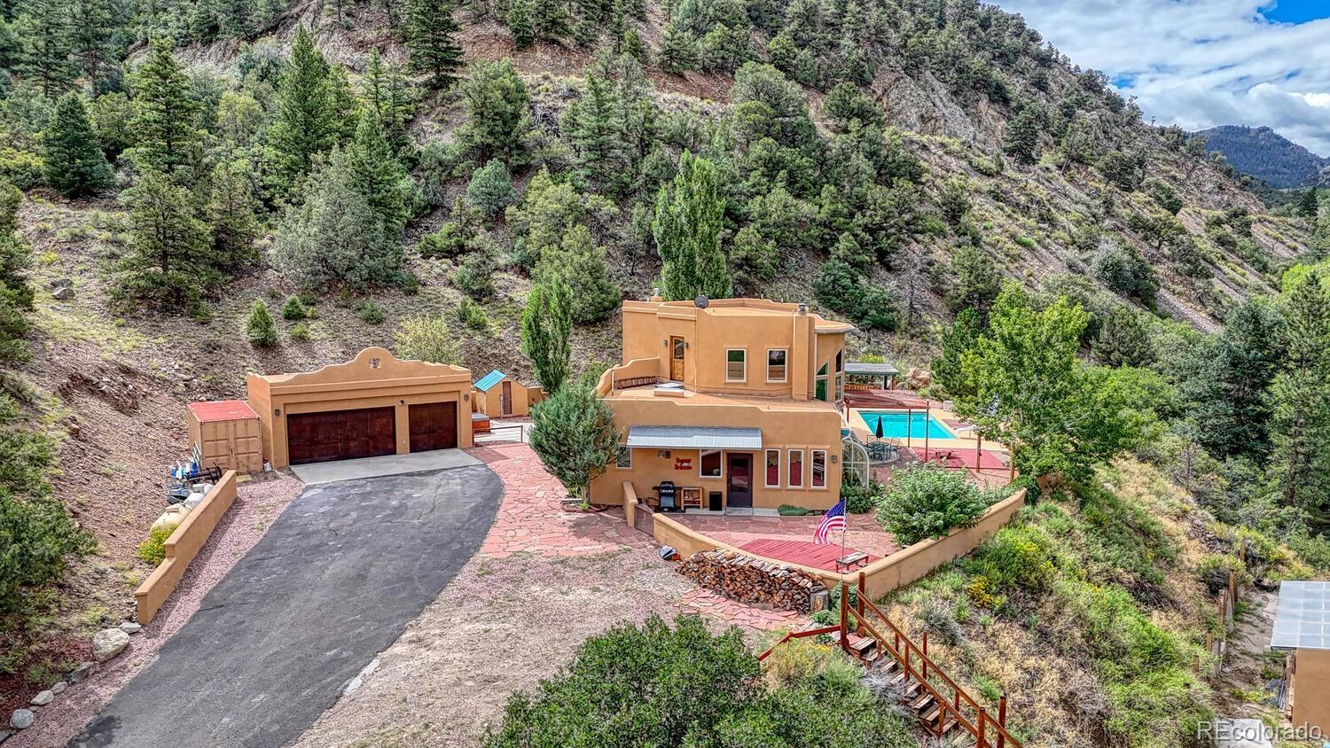 Welcome to this one-of-a-kind custom Spanish-style home, a true gem nestled at the base of Poncha Pass with breathtaking views of the Arkansas River Valley. Situated on over 37 acres, with more than half a mile of Poncha Creek frontage, this 3-bedroom, 3-bath home & 3 Car Garage this property offers the perfect balance of luxury, privacy, and mountain living. The home boasts an open, expansive floor plan with floor-to-ceiling windows and an impressive front room with vaulted ceilings soaring over 26 feet, filling the space with natural light and panoramic views. Whether you’re seeking a peaceful mountain retreat or a permanent residence, this property offers timeless elegance and functionality, with ample space to grow and entertain. The gourmet kitchen is a chef’s dream, featuring a large baker’s island, stainless steel appliances, a gas range & oven, microwave, and dishwasher. Custom alder hardwood cabinetry surrounds the 12’ x 4’ butcher block island, providing ample storage for all your culinary needs. The vaulted ceilings throughout the home create a bright, airy atmosphere, seamlessly blending the living, dining, and outdoor spaces. The back patio is an entertainer’s paradise, complete with a custom-built Kiva fireplace, tiki bar, and in-ground swimming pool & Jacuzzi, offering endless opportunities to host family and friends. All rooms are equipped with ceiling fans, in-floor heating, and central vacuum for ultimate comfort and convenience. The property’s 37 acres is sub-dividable along the creek by following a ROSI (Rural Open Space Initiative - Chaffee County Land Use Plan), allowing for future expansion or development. Additional highlights include private balconies off the master suite, an oversized walk-in closet, a heated garage shower, a dog run, greenhouse, irrigated courtyard, and so much more! Call today to schedule your private tour and make this stunning property your own!