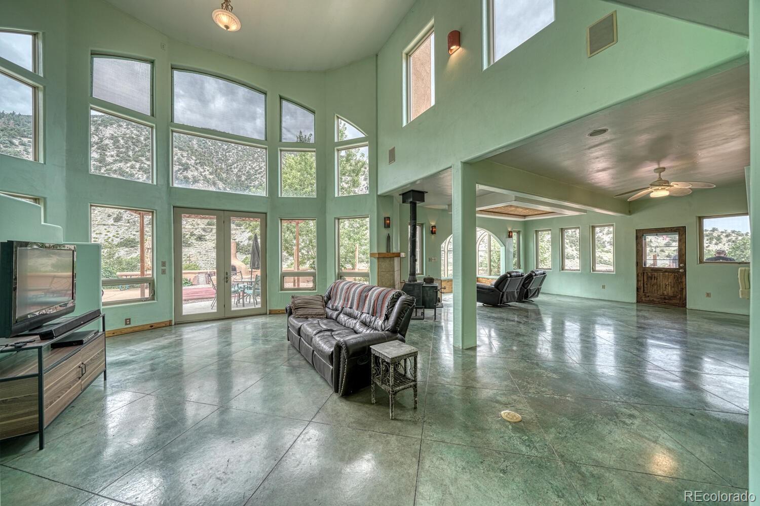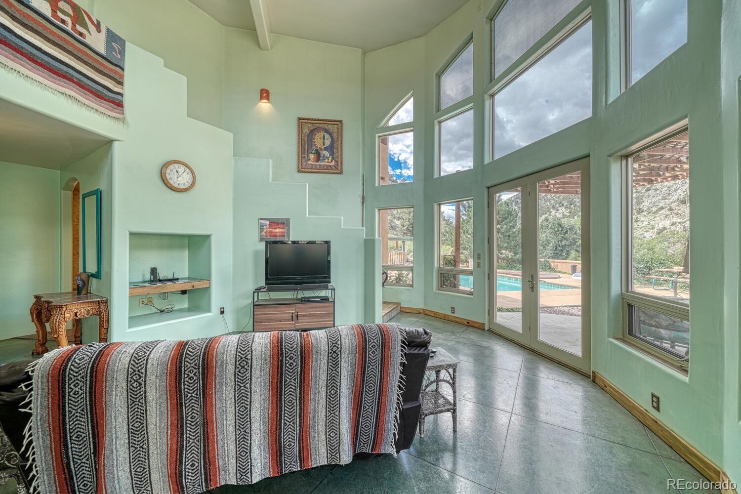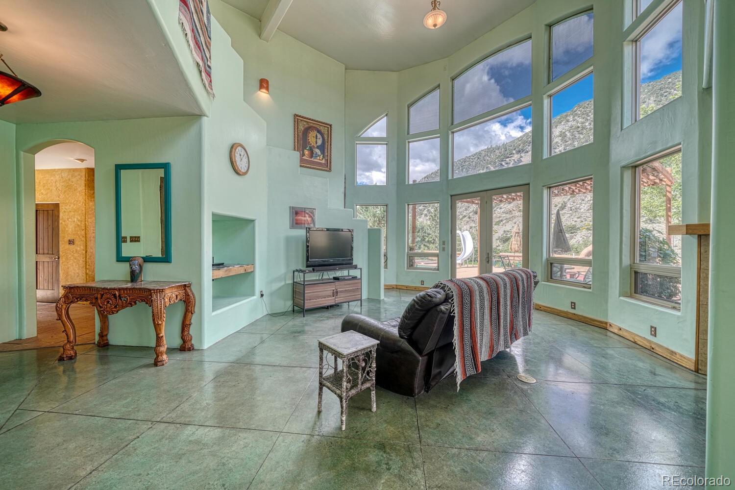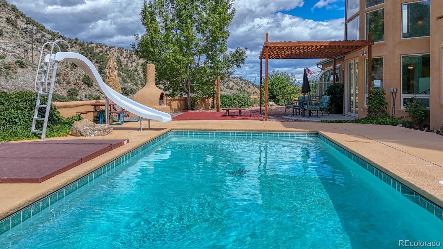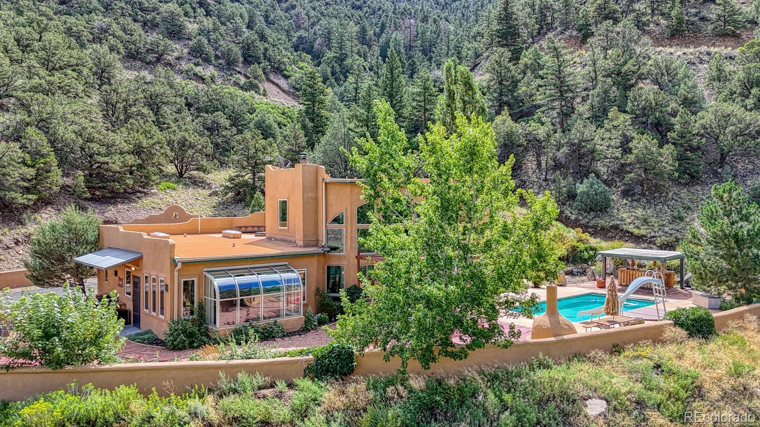Welcome to this one-of-a-kind custom Spanish-style home, a true gem nestled at the base of Poncha Pass with breathtaking views of the Arkansas River Valley. Situated on over 37 acres, with more than half a mile of Poncha Creek frontage, this 3-bedroom, 3-bath home & 3 Car Garage this property offers the perfect balance of luxury, privacy, and mountain living. The home boasts an open, expansive floor plan with floor-to-ceiling windows and an impressive front room with vaulted ceilings soaring over 26 feet, filling the space with natural light and panoramic views. Whether you’re seeking a peaceful mountain retreat or a permanent residence, this property offers timeless elegance and functionality, with ample space to grow and entertain. The gourmet kitchen is a chef’s dream, featuring a large baker’s island, stainless steel appliances, a gas range & oven, microwave, and dishwasher. Custom alder hardwood cabinetry surrounds the 12’ x 4’ butcher block island, providing ample storage for all your culinary needs. The vaulted ceilings throughout the home create a bright, airy atmosphere, seamlessly blending the living, dining, and outdoor spaces. The back patio is an entertainer’s paradise, complete with a custom-built Kiva fireplace, tiki bar, and in-ground swimming pool & Jacuzzi, offering endless opportunities to host family and friends. All rooms are equipped with ceiling fans, in-floor heating, and central vacuum for ultimate comfort and convenience. The property’s 37 acres is sub-dividable along the creek by following a ROSI (Rural Open Space Initiative - Chaffee County Land Use Plan), allowing for future expansion or development. Additional highlights include private balconies off the master suite, an oversized walk-in closet, a heated garage shower, a dog run, greenhouse, irrigated courtyard, and so much more! Call today to schedule your private tour and make this stunning property your own!