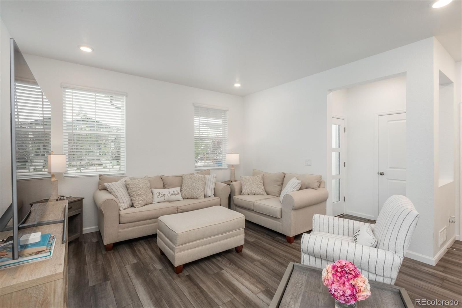 Seller is relocating out of state for work—don’t miss this incredible opportunity to own a stunning home in the highly sought-after Aurora Highlands! Lived in for less than a year, this 3-bedroom, 3-bathroom corner-lot home feels brand new, but with the added benefit of completed upgrades you won’t get with new construction. Window treatments, a finished side yard, added ceiling fan, and upgraded kitchen light fixtures are already done—this home is truly turn-key and move-in ready! Step onto the oversized, covered front porch and enter into a light, bright, and open living space. The main floor features a cheerful family room, a welcoming dining area with sliding glass door leading to the fenced side yard, a convenient half-bath, and a dream kitchen complete with an island, stainless steel appliances, a gas stove, pantry, quartz countertops, upgraded recessed lighting, and a stylish tile backsplash. The seller spared no expense, and it shows! Upstairs, the spacious primary suite offers a true retreat with a 4-piece ensuite bath and a generously sized walk-in closet. Two additional bedrooms—both with walk-in closets, a full bathroom, and a laundry room with washer and dryer included complete the second level. In addition to trash and recycling services included with the monthly HOA, residents will soon enjoy access to the highly anticipated “Beach Club”, scheduled to open later this year, featuring indoor and outdoor pools! Conveniently located near E-470 and I-70, you’ll have easy access to DIA, downtown Denver, and the greater metro area. Contact Brad Brallier today for more information or to schedule your private showing!
