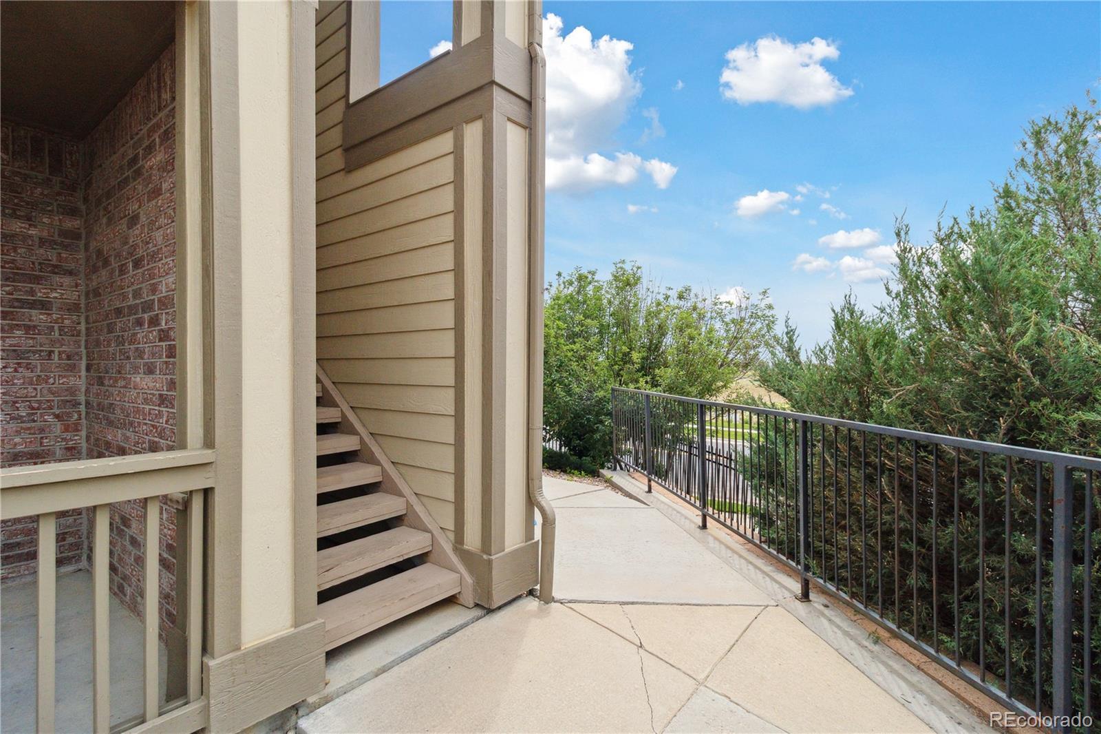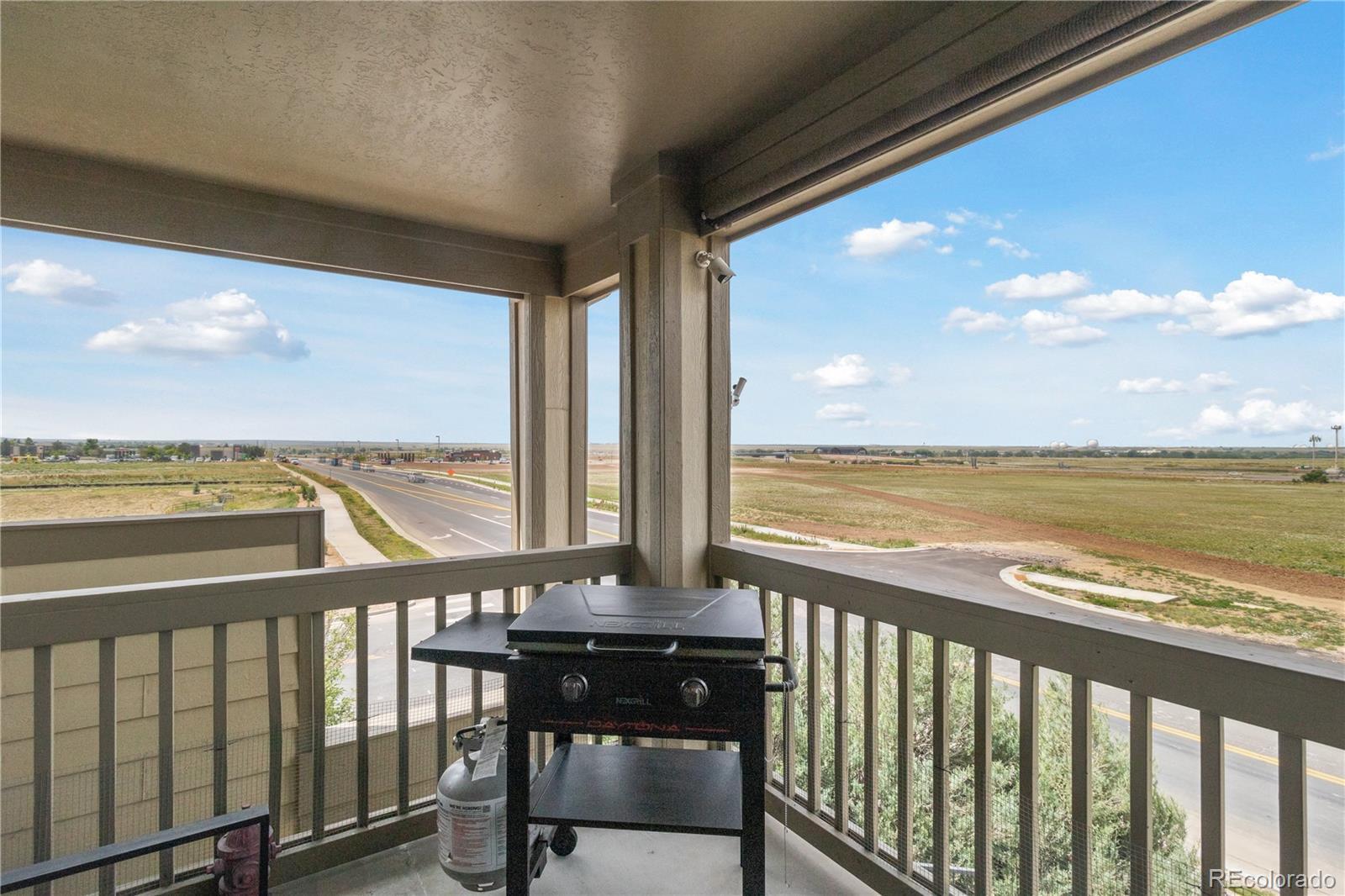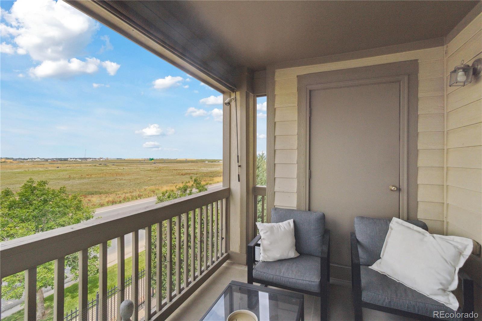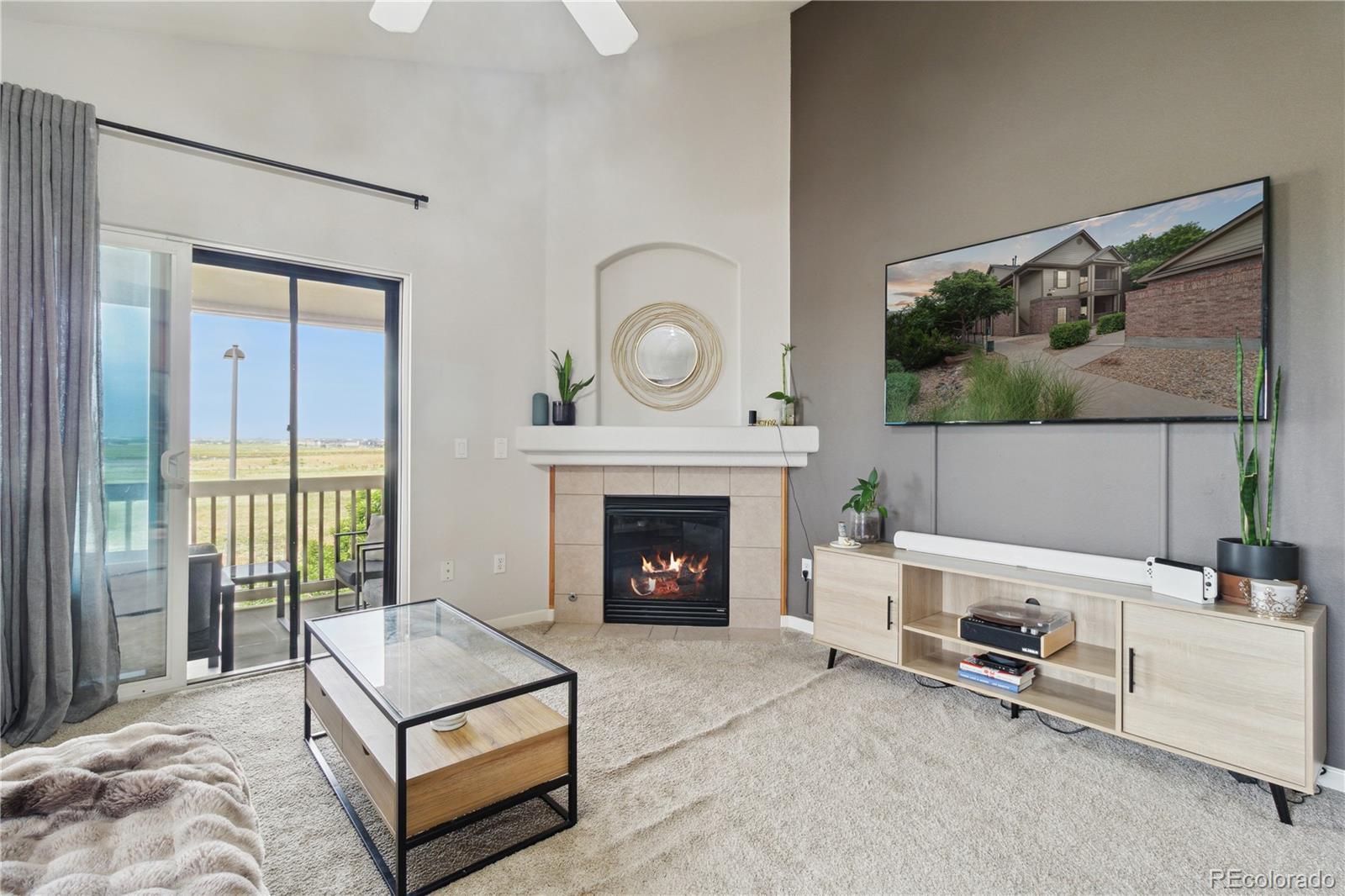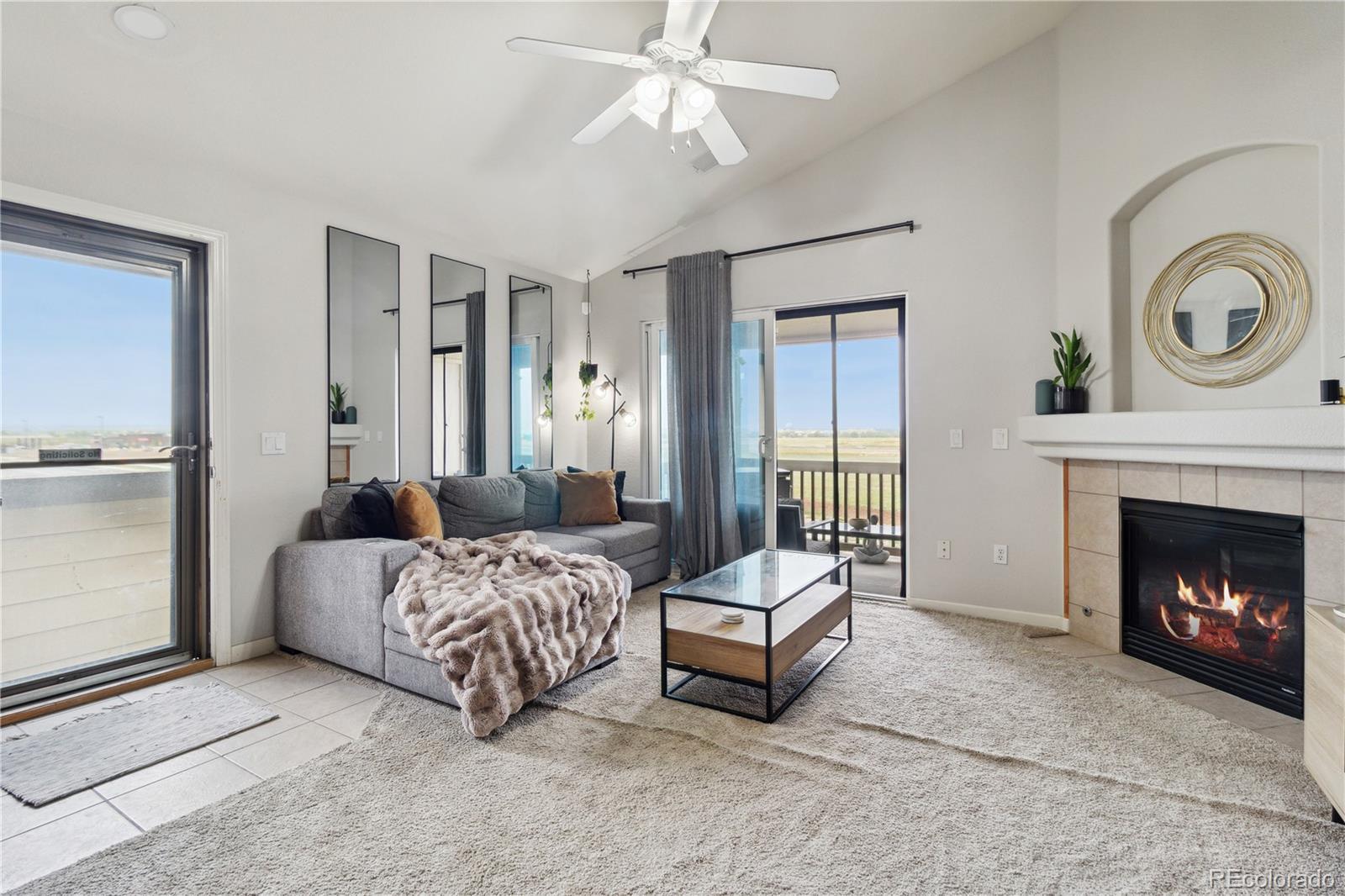 Welcome Home! This upper floor unit boasts natural light, high and vaulted ceilings, open floor concept, unobstructed mountain views and so much more! The large U shaped kitchen has counter space on 3 sides, laminate flooring, and 42" cupboards. Dining room is adjacent and open to kitchen and living room. The spacious living room has a gas fireplace, vaulted ceiling and a sliding door to the west facing balcony with that front range view! The balcony also has a manually activated sun shade. The secondary bedroom is west facing, getting that same beautiful mountain view. Full guest bathroom is between the laundry closet and secondary bedroom. The laundary closet has been customized with cupboards and shelving. Oversized primary bedroom has vaulted ceiling, attached primary bathroom equipped with 2 sinks and garden tub, and access to the large walk-in closet. Lastly, you can park your car with peace of mind in your detached garage. Whether you're starting out or starting over, this condo is the perfect for you! Enjoy easy access to E470 and I70, you can be anywhere in a matter of minutes! Gun Club Road will take you all the way to Southlands, where you'll find dining, shopping and entertainment. Quick drive to Anschutz Medical Campus, Denver International Airport, and to Buckley Space Force Base. BONUS: The assessment on this unit is paid off!