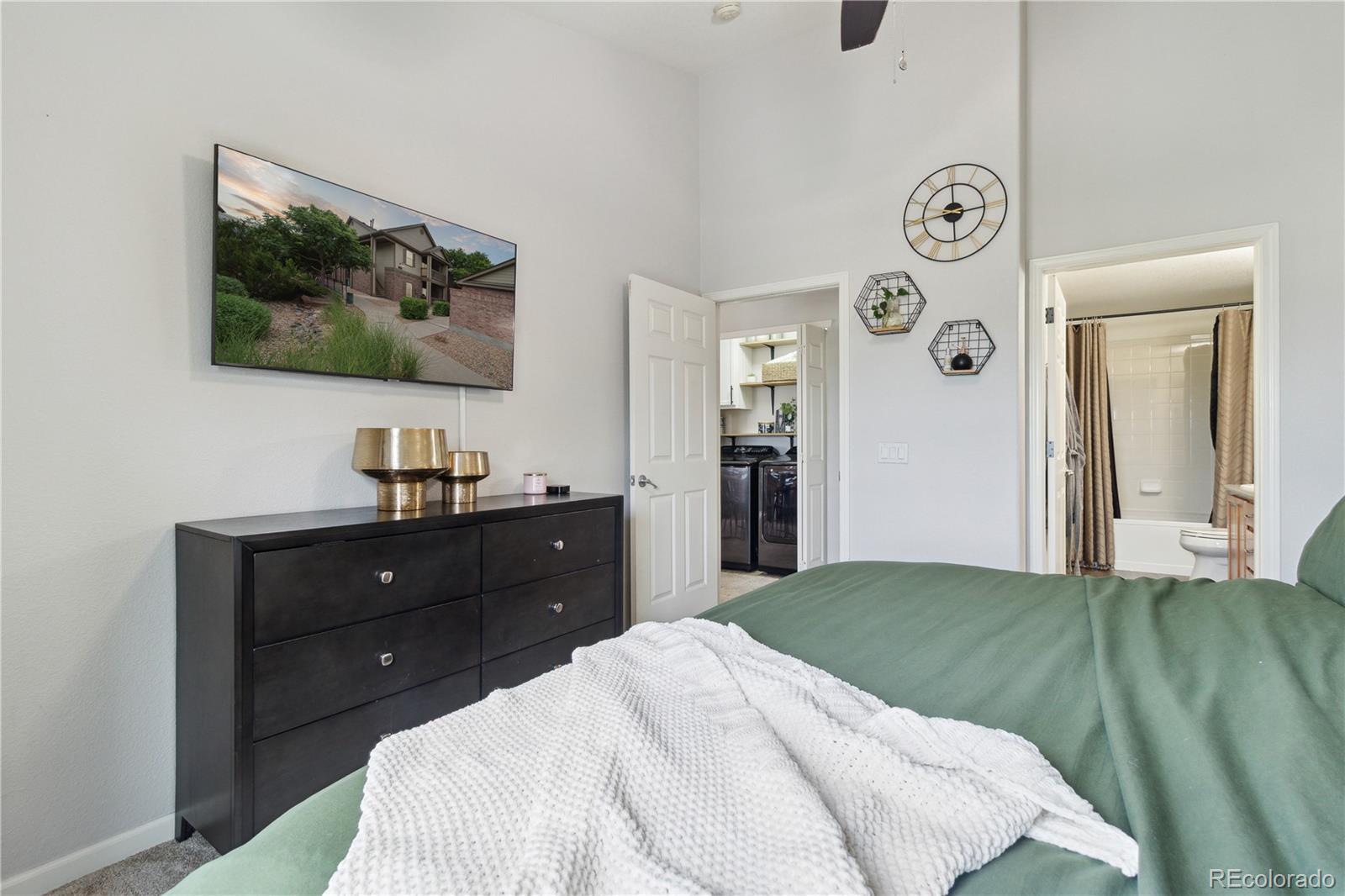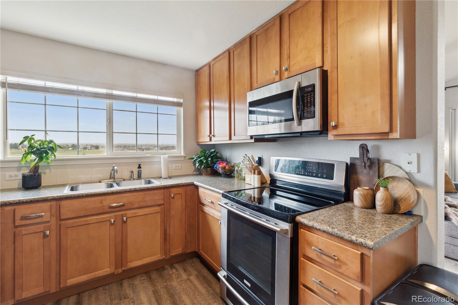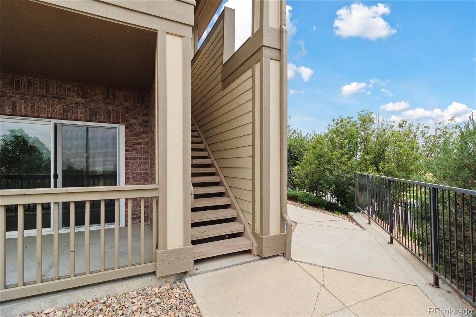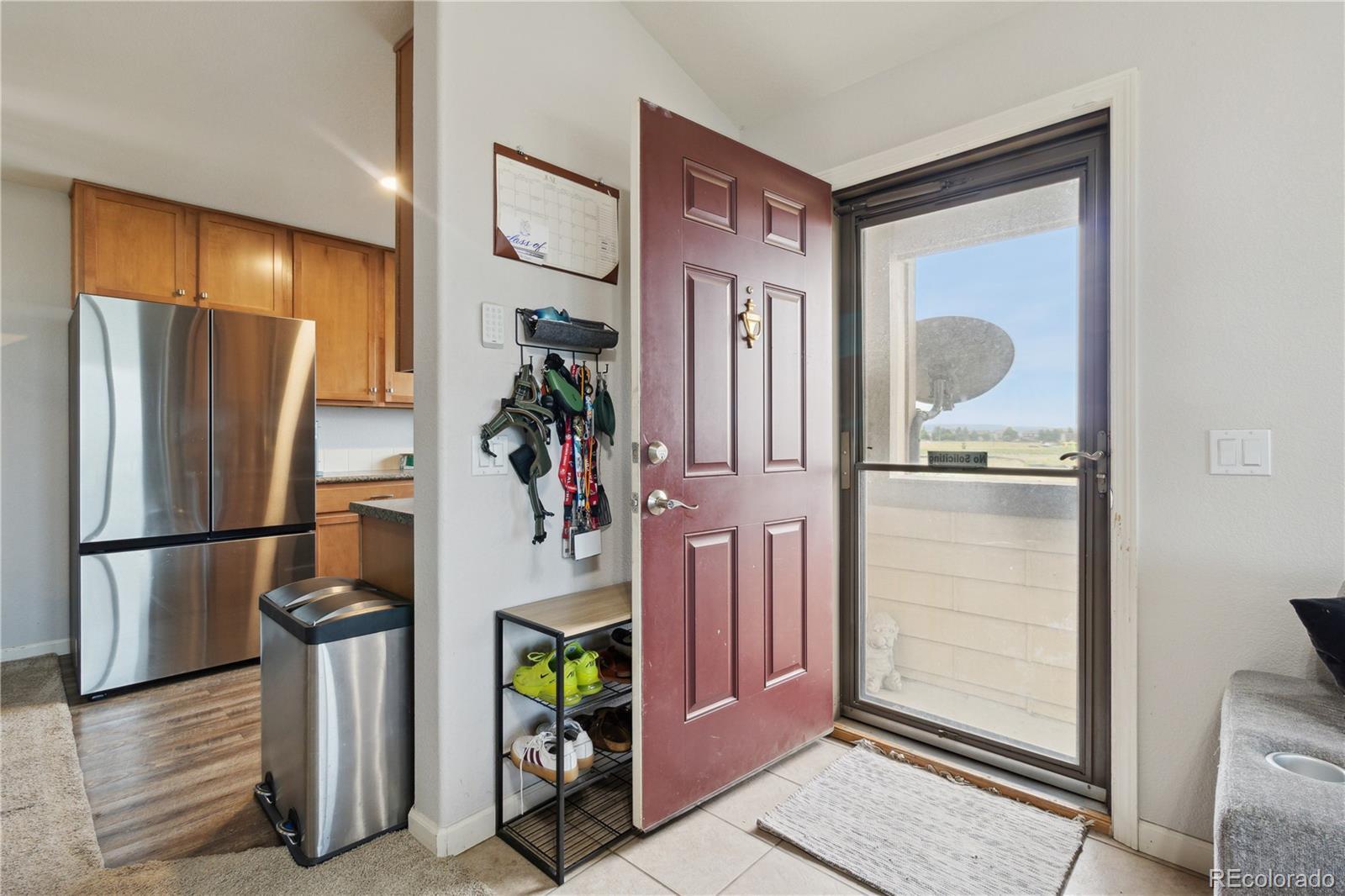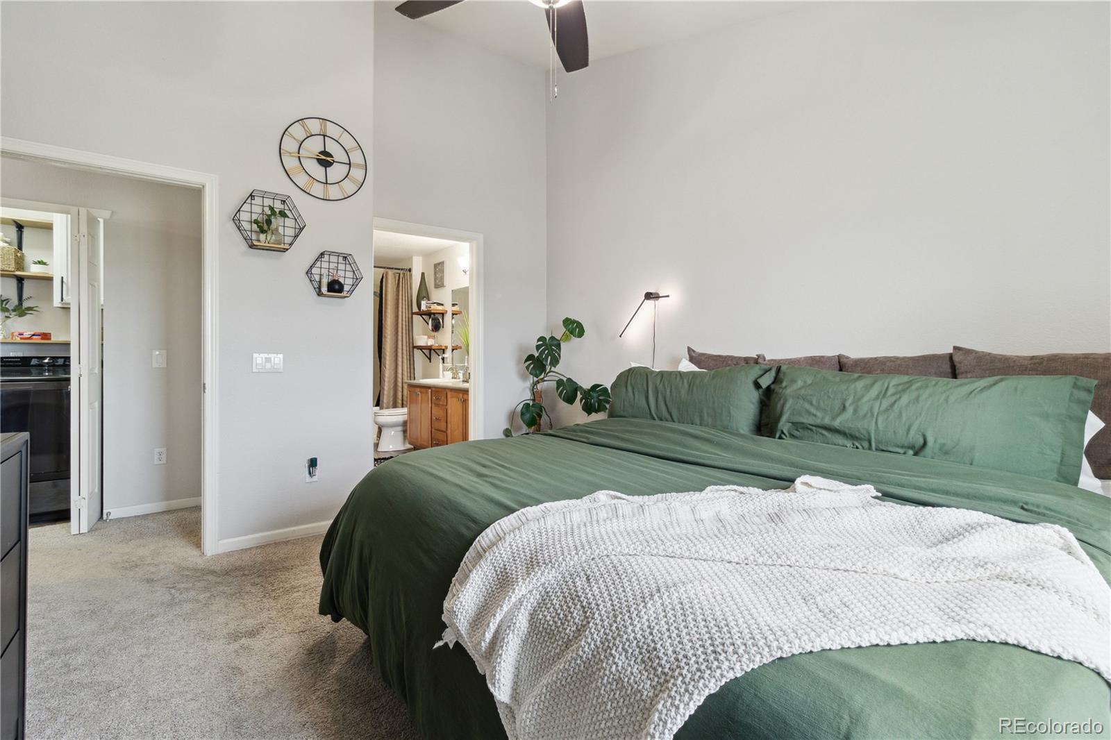 Welcome Home! This upper floor unit boasts natural light, high and vaulted ceilings, open floor concept, unobstructed mountain views and so much more! The large U shaped kitchen has counter space on 3 sides, laminate flooring, and 42" cupboards. Dining room is adjacent and open to kitchen and living room. The spacious living room has a gas fireplace, vaulted ceiling and a sliding door to the west facing balcony with that front range view! The balcony also has a manually activated sun shade. The secondary bedroom is west facing, getting that same beautiful mountain view. Full guest bathroom is between the laundry closet and secondary bedroom. The laundary closet has been customized with cupboards and shelving. Oversized primary bedroom has vaulted ceiling, attached primary bathroom equipped with 2 sinks and garden tub, and access to the large walk-in closet. Lastly, you can park your car with peace of mind in your detached garage. Whether you're starting out or starting over, this condo is the perfect for you! Enjoy easy access to E470 and I70, you can be anywhere in a matter of minutes! Gun Club Road will take you all the way to Southlands, where you'll find dining, shopping and entertainment. Quick drive to Anschutz Medical Campus, Denver International Airport, and to Buckley Space Force Base. BONUS: The assessment on this unit is paid off!
