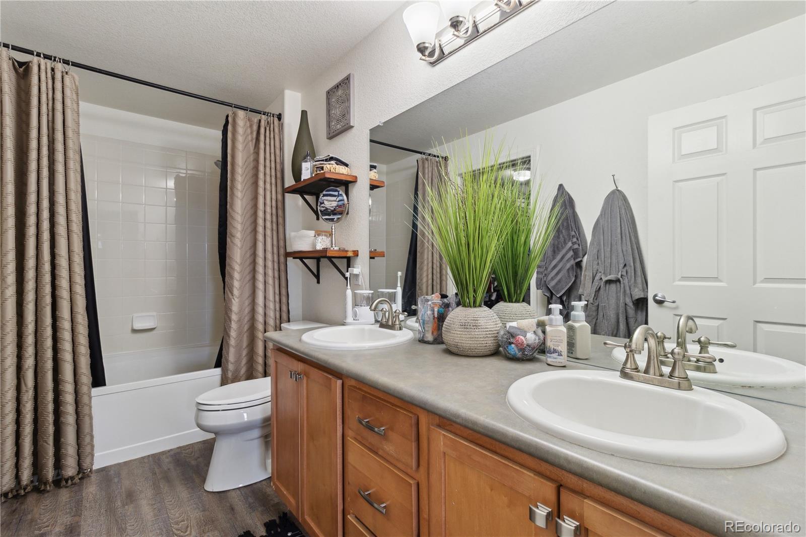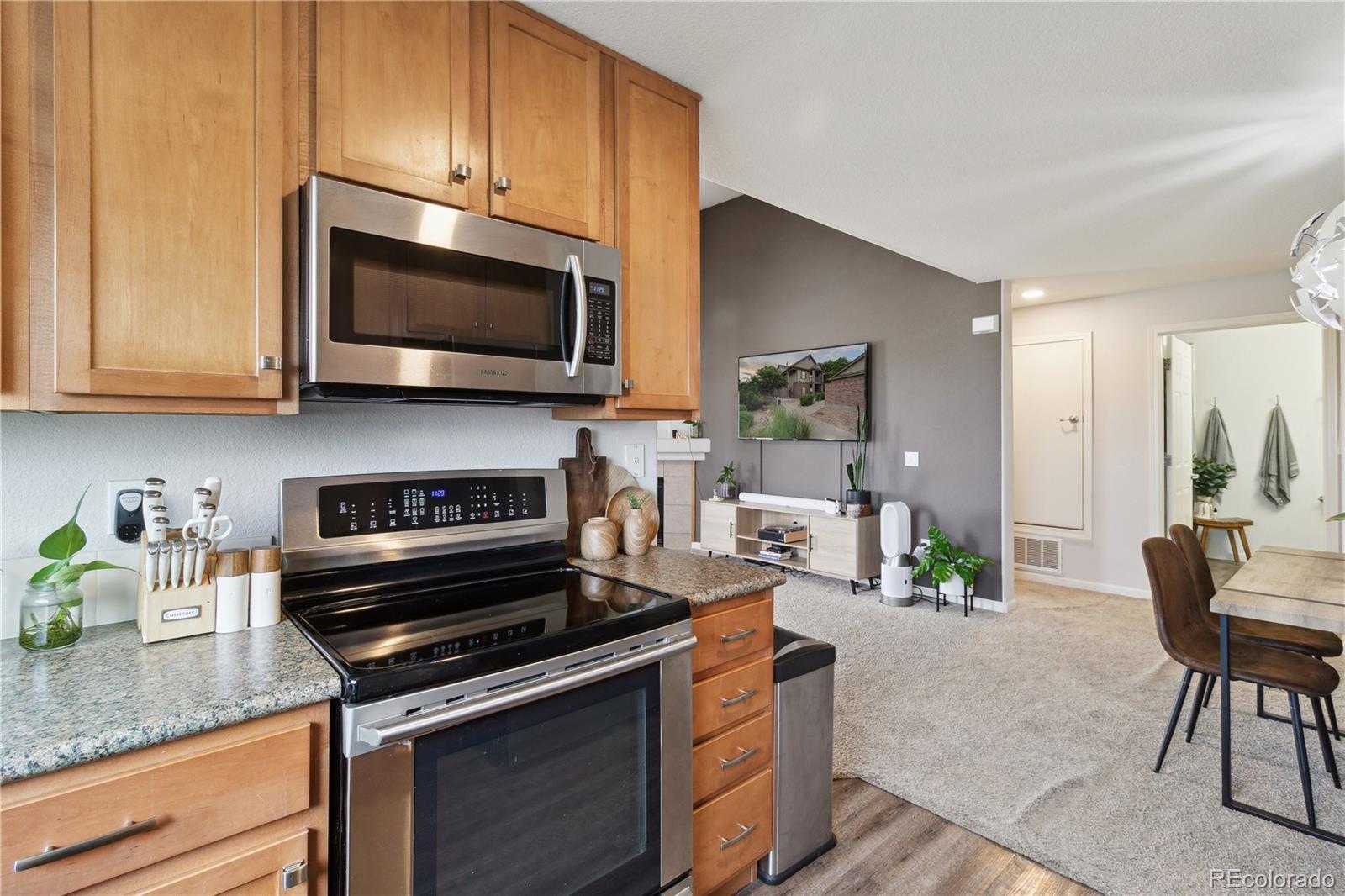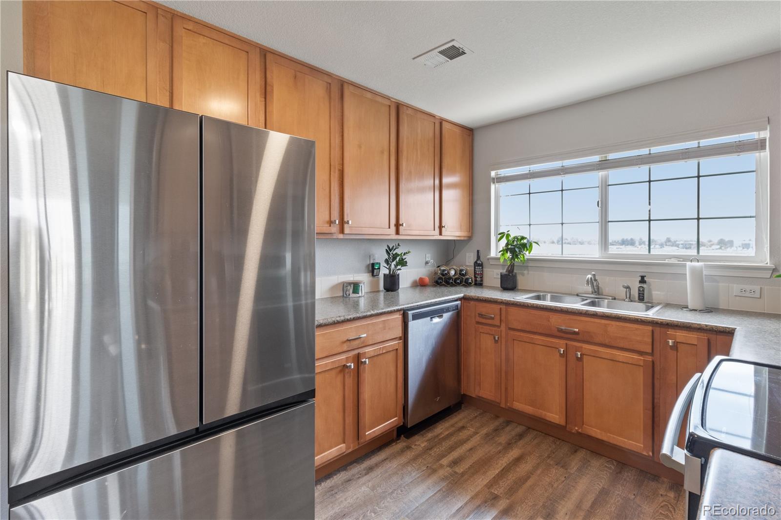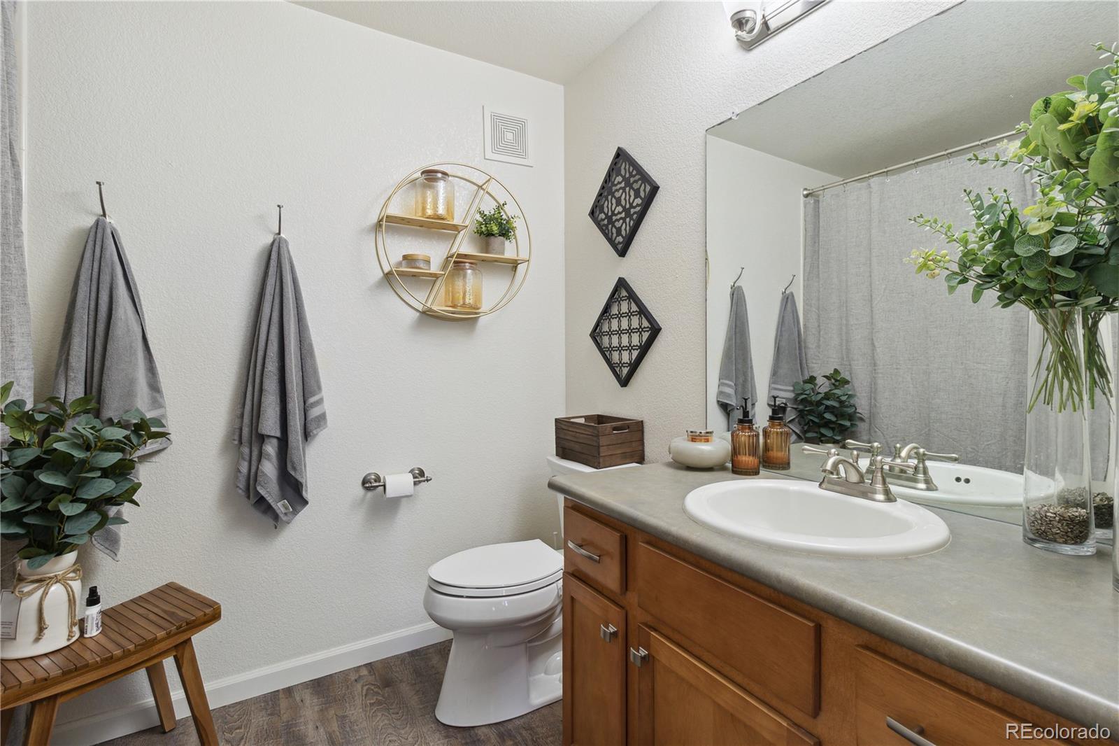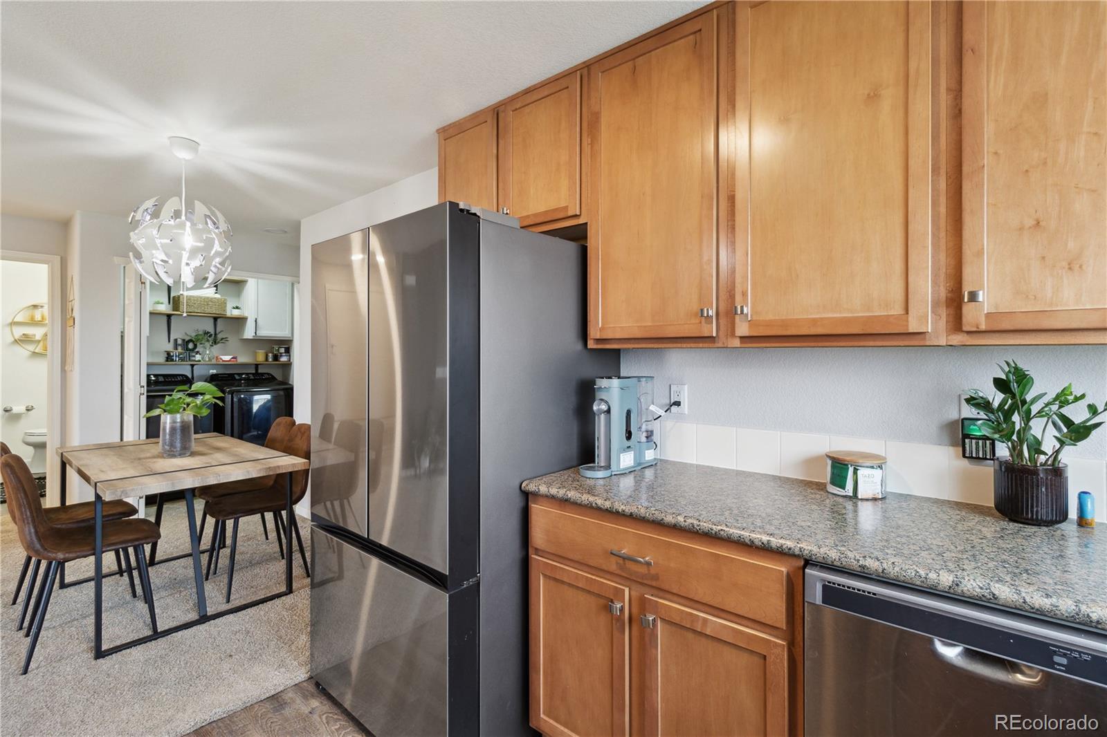 Welcome Home! This upper floor unit boasts natural light, high and vaulted ceilings, open floor concept, unobstructed mountain views and so much more! The large U shaped kitchen has counter space on 3 sides, laminate flooring, and 42" cupboards. Dining room is adjacent and open to kitchen and living room. The spacious living room has a gas fireplace, vaulted ceiling and a sliding door to the west facing balcony with that front range view! The balcony also has a manually activated sun shade. The secondary bedroom is west facing, getting that same beautiful mountain view. Full guest bathroom is between the laundry closet and secondary bedroom. The laundary closet has been customized with cupboards and shelving. Oversized primary bedroom has vaulted ceiling, attached primary bathroom equipped with 2 sinks and garden tub, and access to the large walk-in closet. Lastly, you can park your car with peace of mind in your detached garage. Whether you're starting out or starting over, this condo is the perfect for you! Enjoy easy access to E470 and I70, you can be anywhere in a matter of minutes! Gun Club Road will take you all the way to Southlands, where you'll find dining, shopping and entertainment. Quick drive to Anschutz Medical Campus, Denver International Airport, and to Buckley Space Force Base. BONUS: The assessment on this unit is paid off!