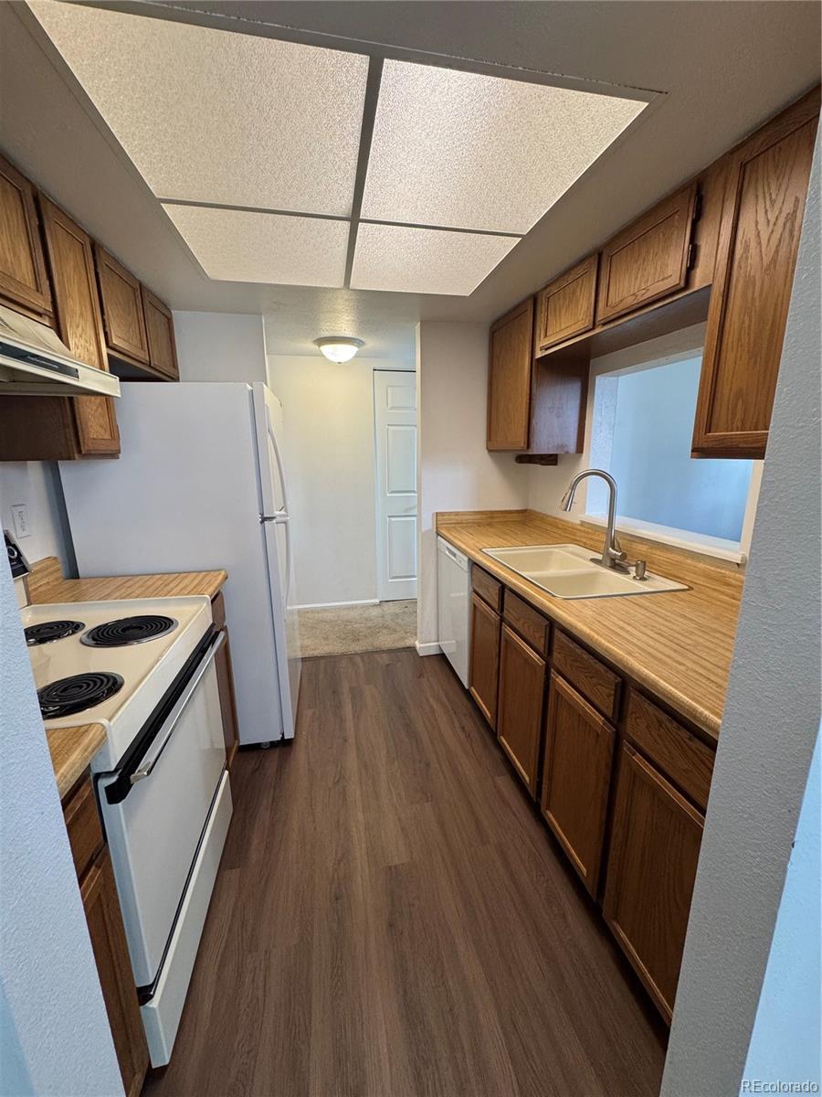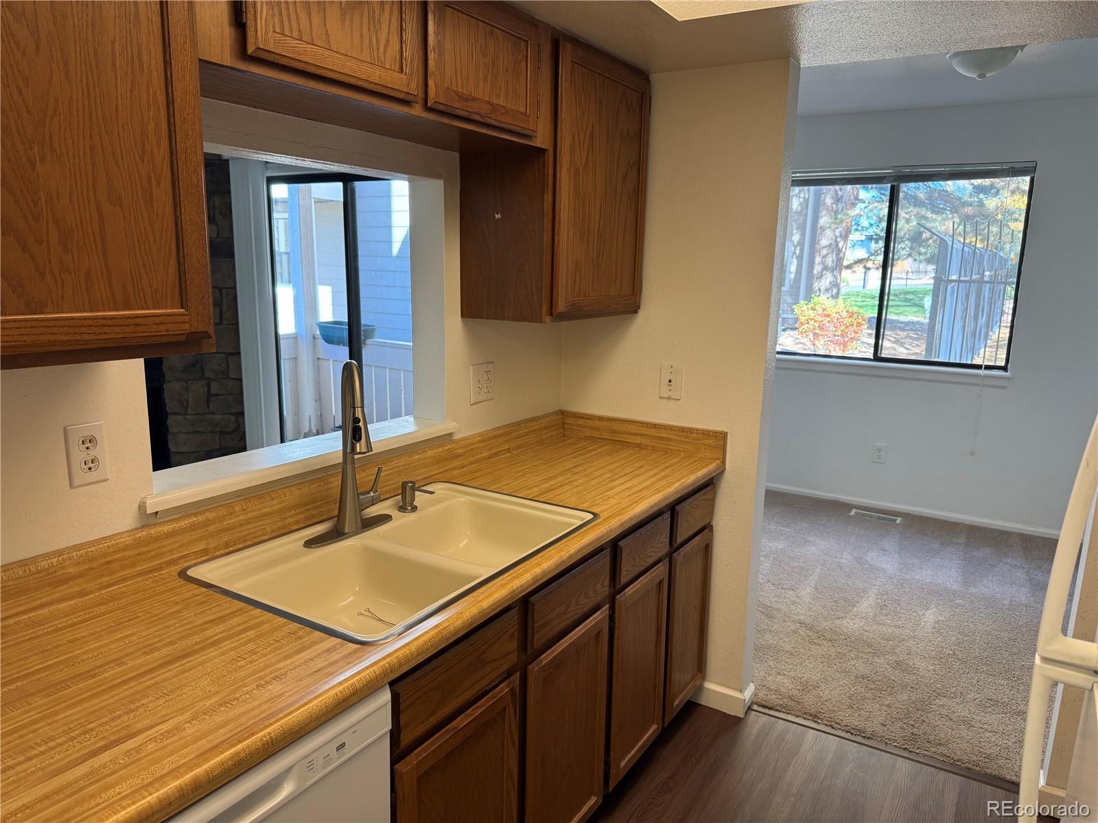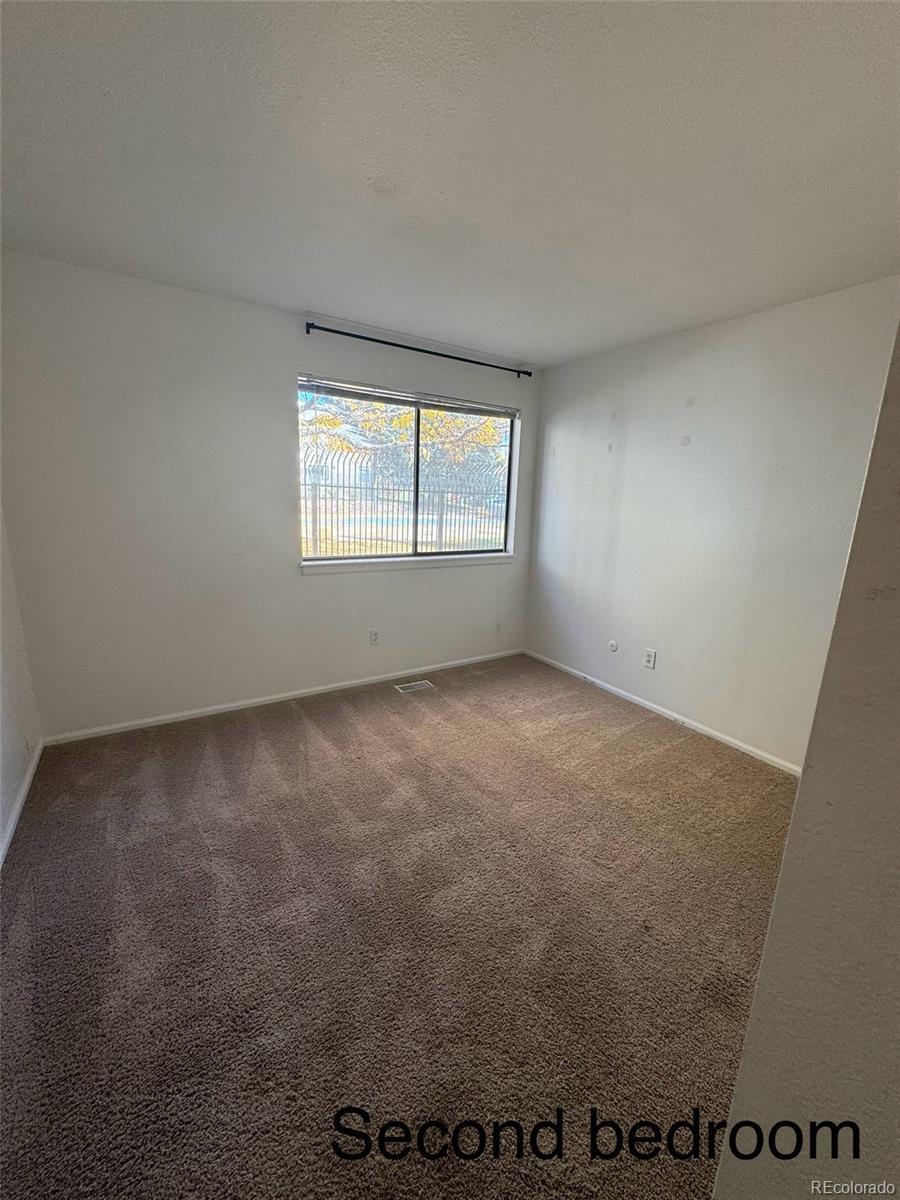 A GREAT PLACE TO CALL HOME. Spacious 2 bedroom 2 bathroom condominium backs to open space with amazing views near Quincy Reservoir. This property is located in the prestigious Cherry Creek School District. Enter to a large living room with a covered patio. The dining room has lots of space for entertaining and is next to the kitchen with plenty of storage and a pass through to the living room which provides more brightness. The kitchen includes a refrigerator, stove and new dishwasher. At the end of the hall is a roomy primary bedroom with a walk-in closet and en suite bathroom. The secondary bedroom has plenty of closet space and is light and bright and close to a three-quarter bathroom for added convenience. The separate laundry room comes with a full-size washer and dryer (new dryer) There is new laminate flooring in the kitchen, entry, bathrooms, and laundry room. A carpet allowance is available with a strong offer. This unit has 2 reserved parking spaces very conveniently located near the path to the parking lot. The community has a seasonal pool with lounge chairs and tennis courts. All special assessments will be paid prior to closing.